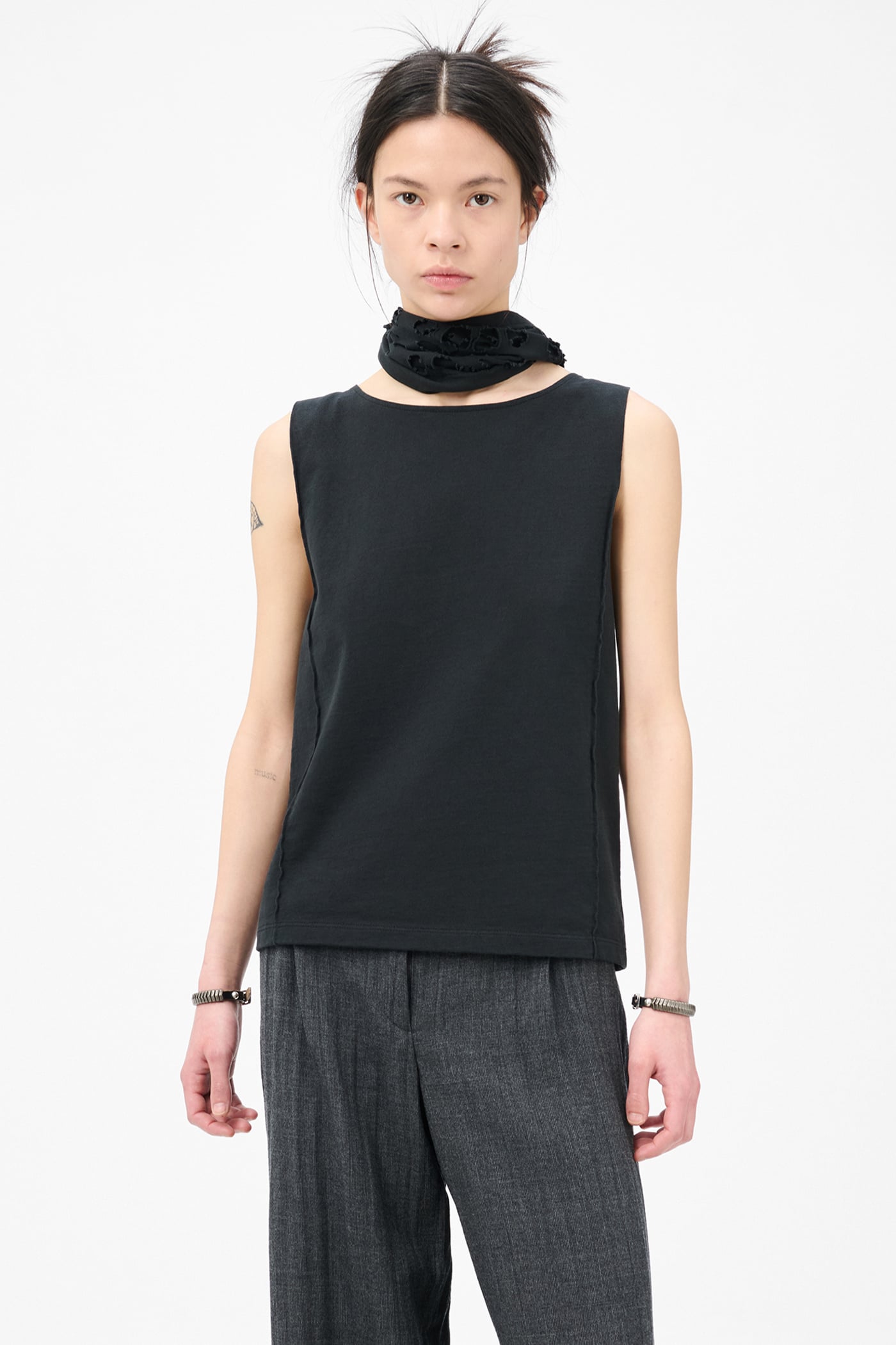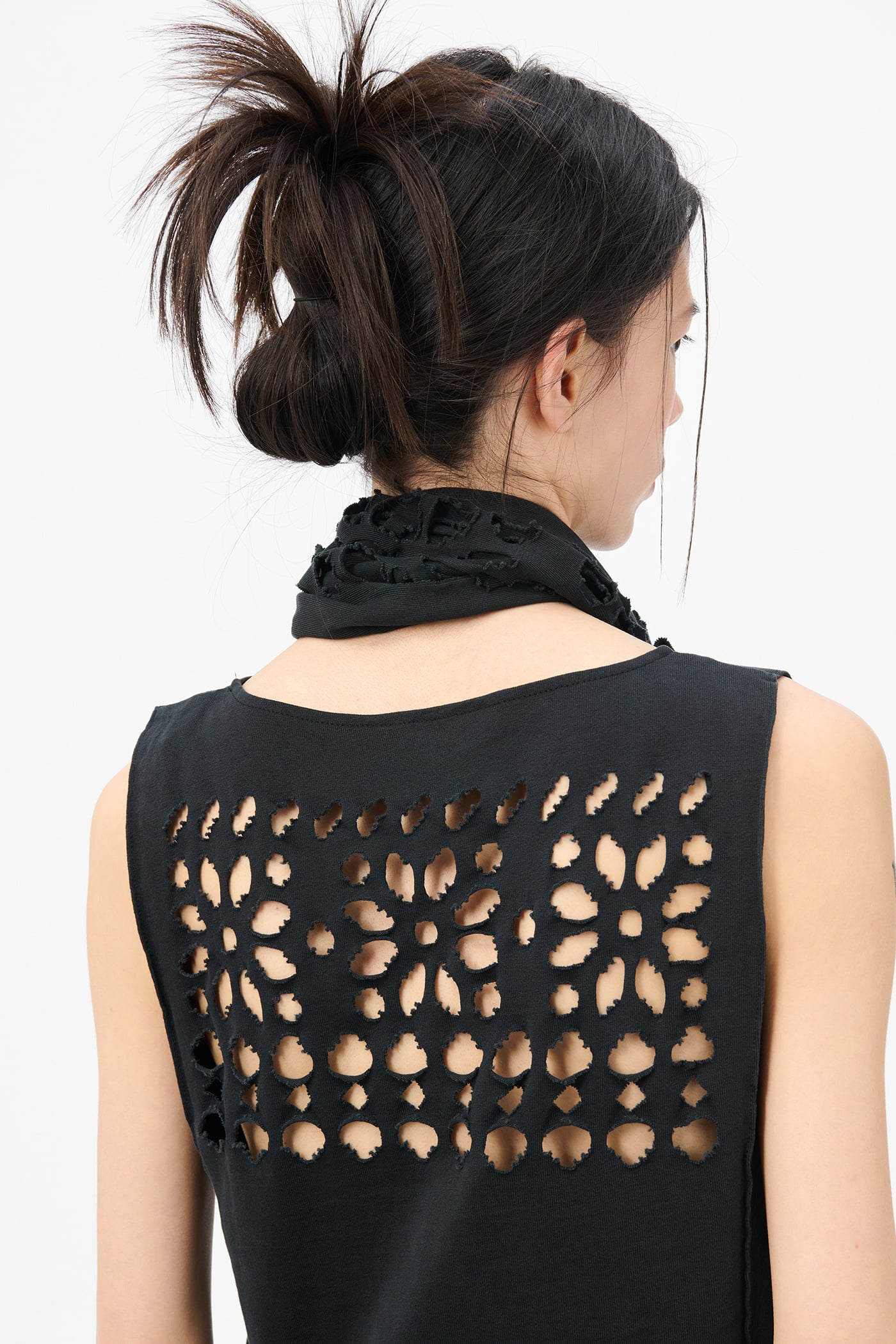 Our Lounge Top in Cut Fairisle Ink Band Jersey. Produced in Portuguese cotton, the women's Lounge Top has interesting construction details and features a laser cut treatment on the back which exposes the wearer's skin. The front and back feature a pinch crease that folds the top of armhole inwards. The back laser cut detail showcases a fair isle pattern taking inspiration from traditional knitwear sweaters, with raw edges that roll to give the detail a worn-out look.