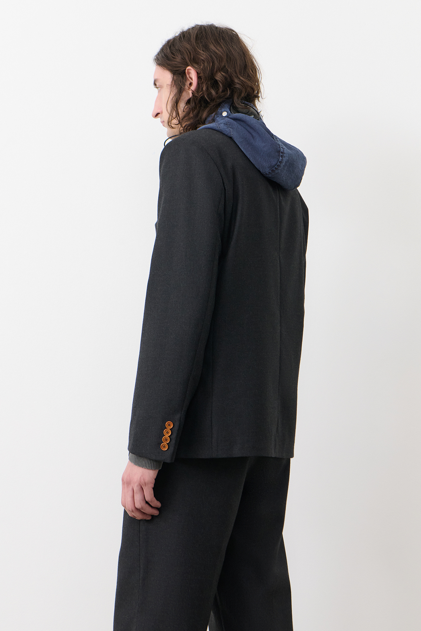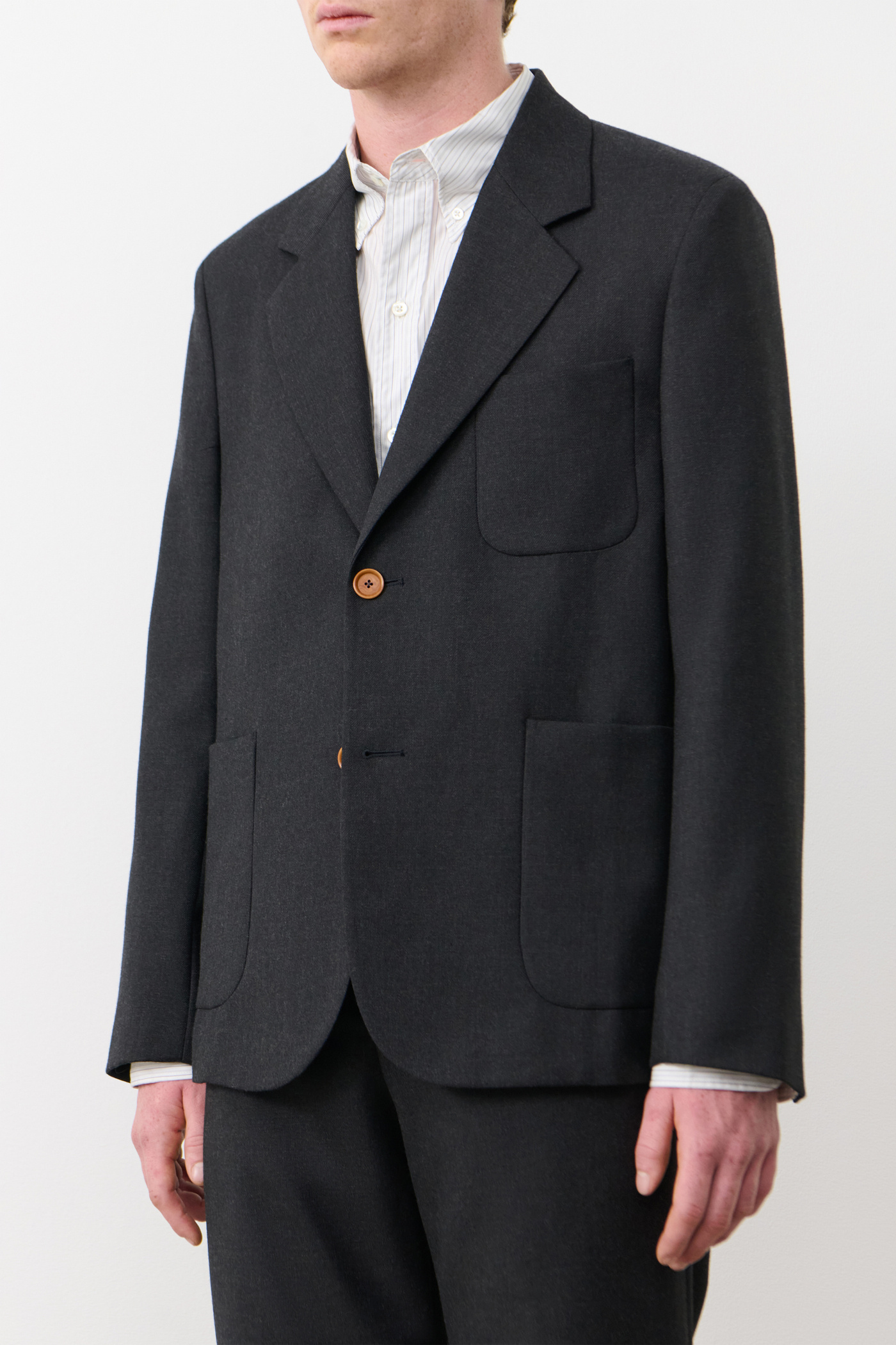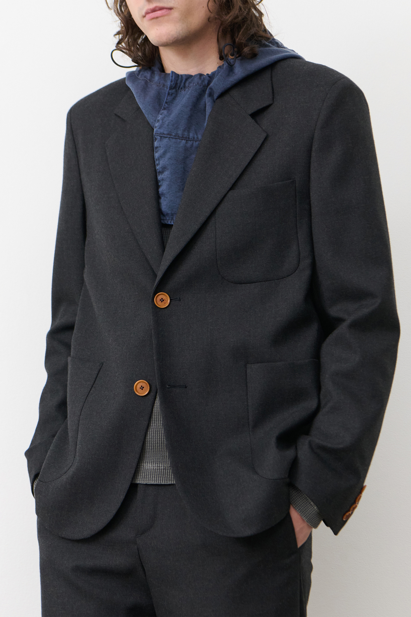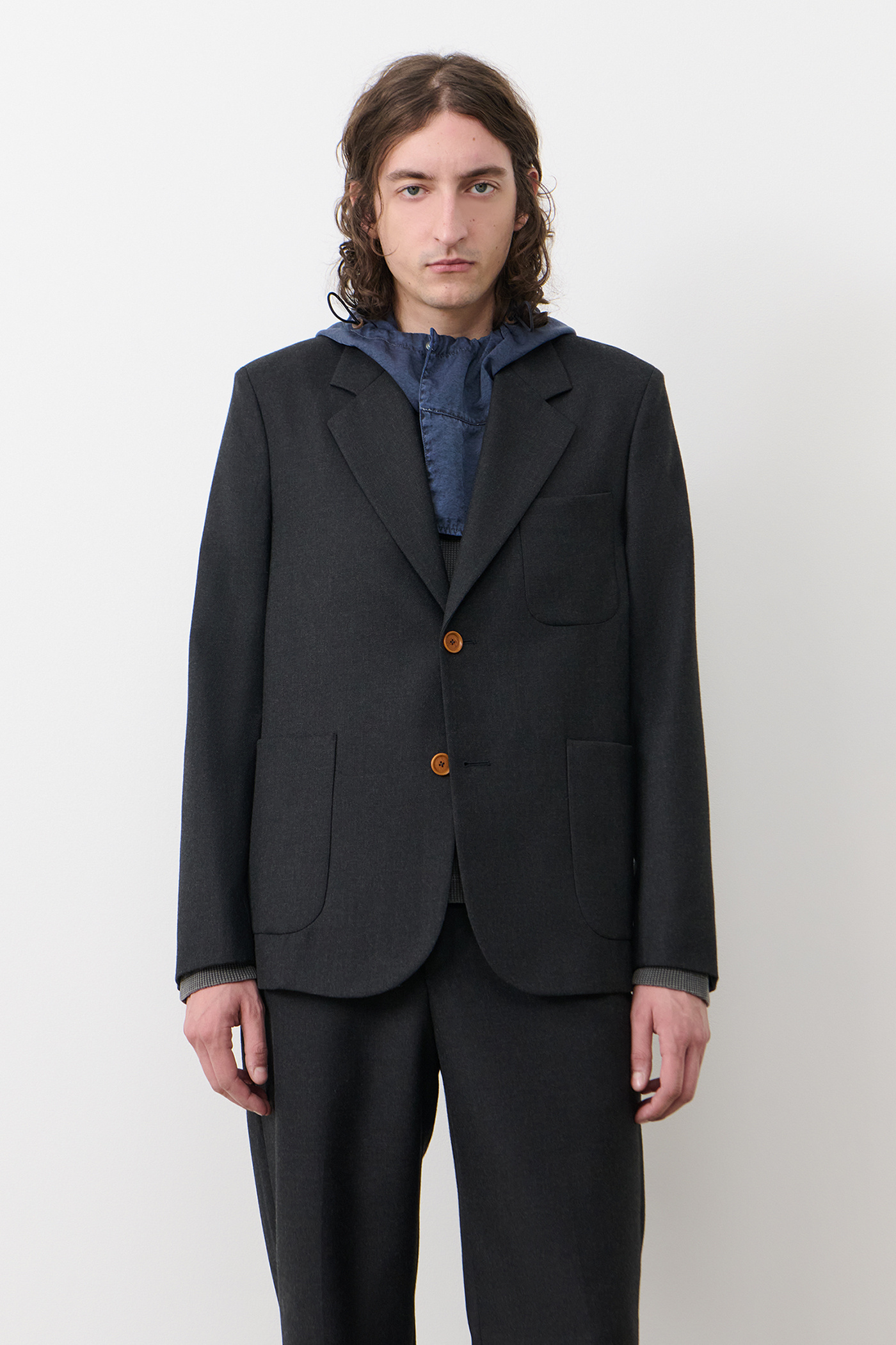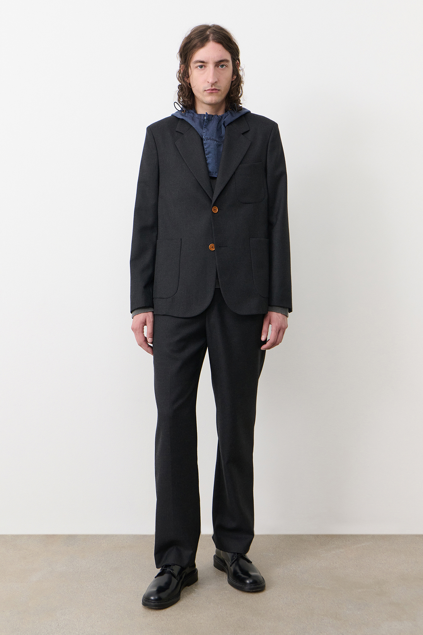Marconi Blazer in Wool Gabardine Moonless Night. Blazer crafted from a blend of Italian virgin wool and nylon gabardine for the collaboration between Our Legacy WORK SHOP and C.P. Company. Designed through research in the C.P. Company archive, Marconi Blazer ia referencing details from archival suiting translated to a classic Our Legacy fit. Featuring notched lapel, two button closure, patch pockets and Corozo buttons. Regular fit.