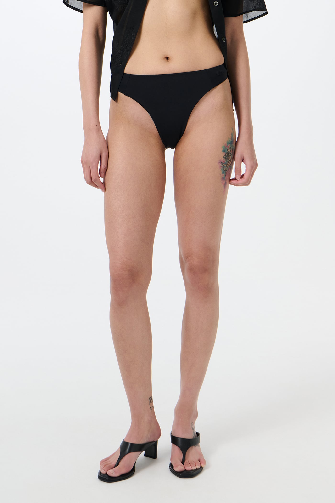 Our Meguro Bikini Bottom in Jet Black Jersey. Produced in a Portuguese polyamide and elastane jersey, the Meguro Bikini Bottom has a semi-high rise, elastic side seam and a clean, minimal silhouette.