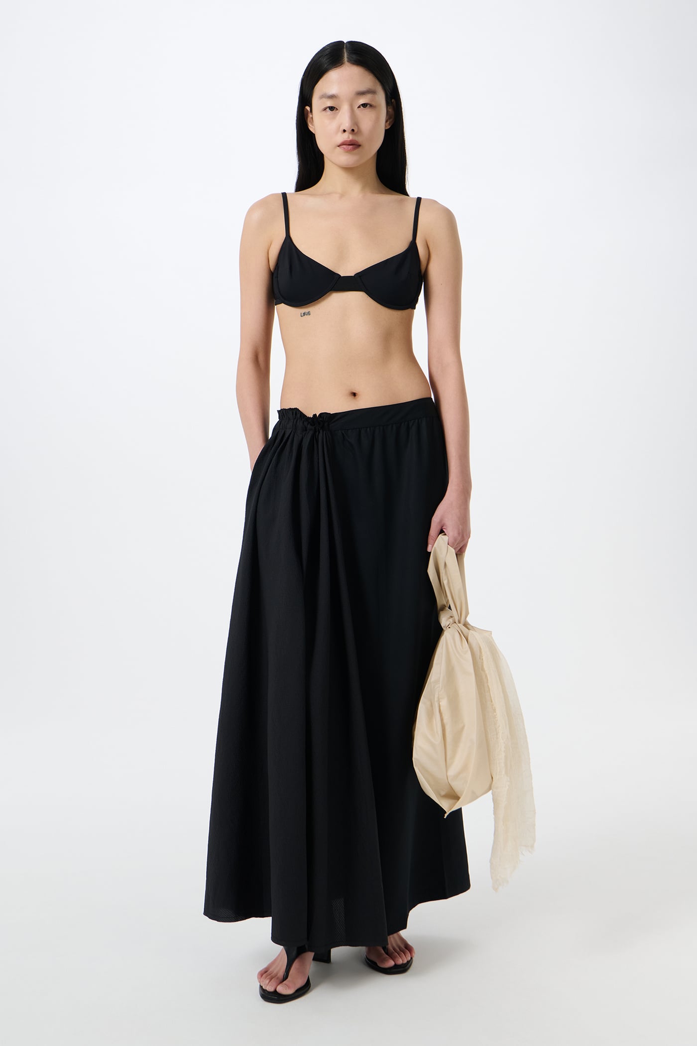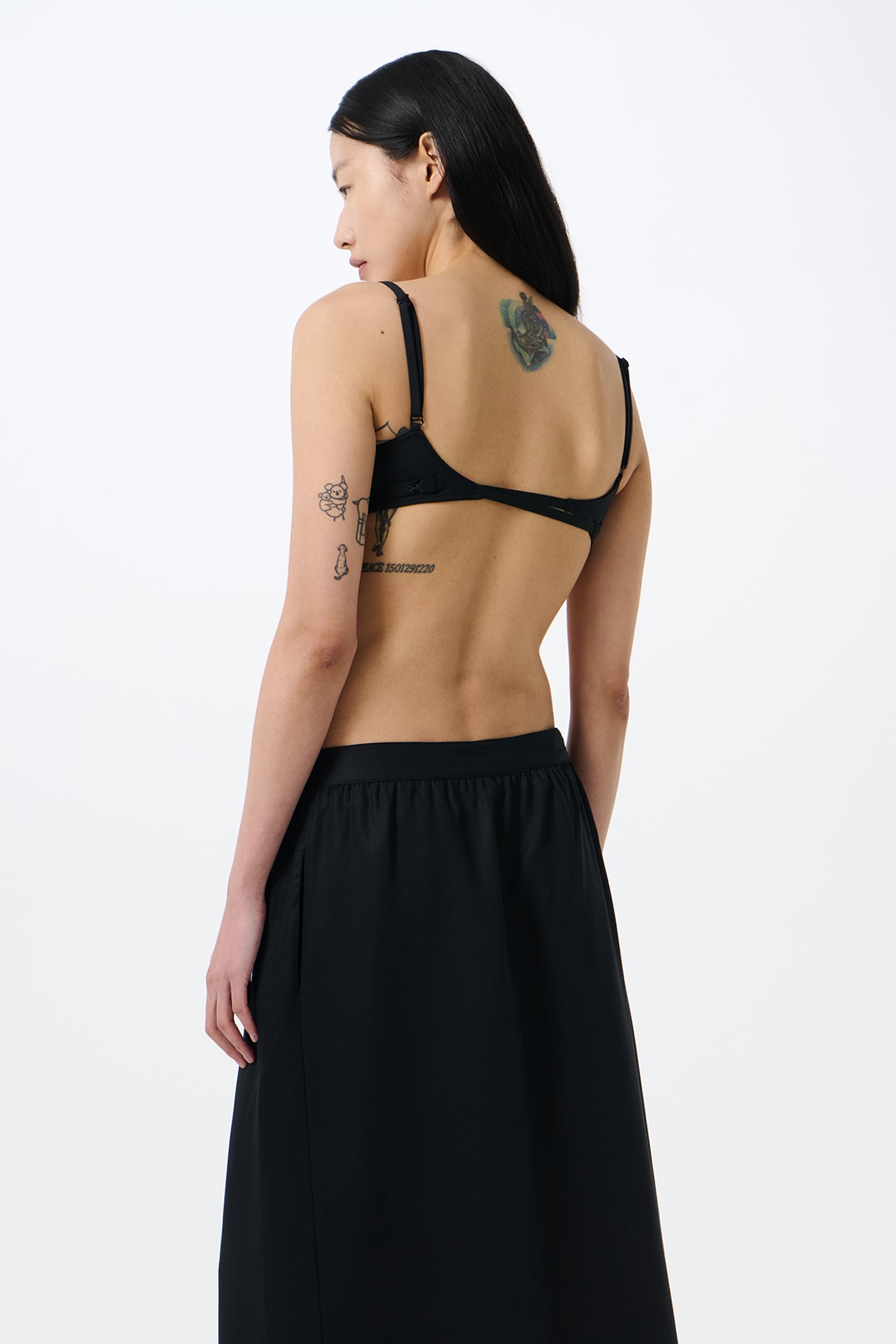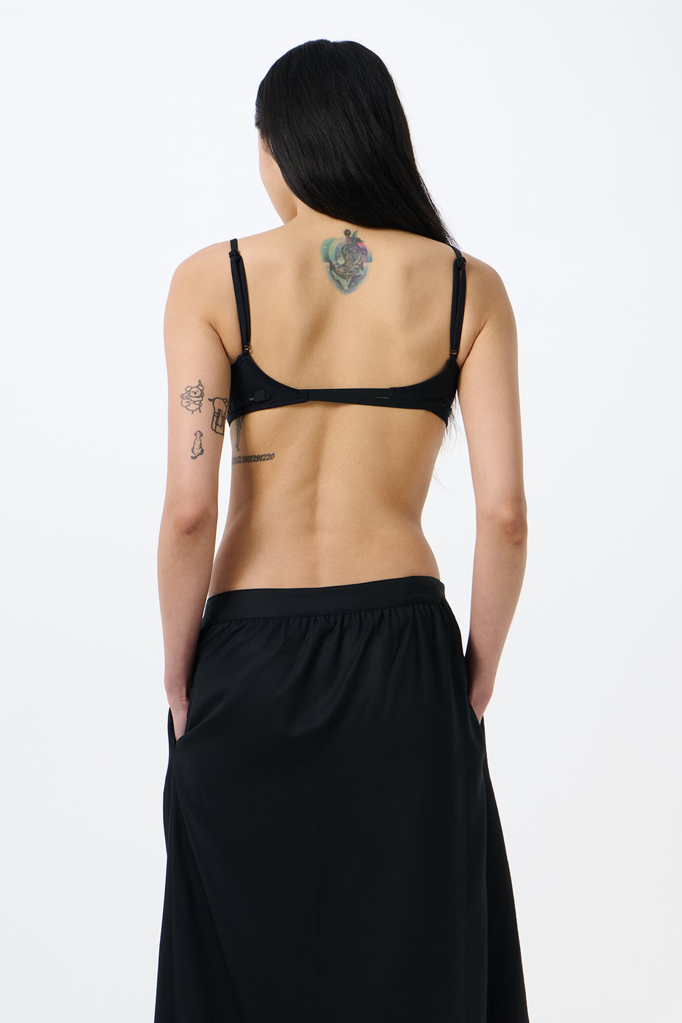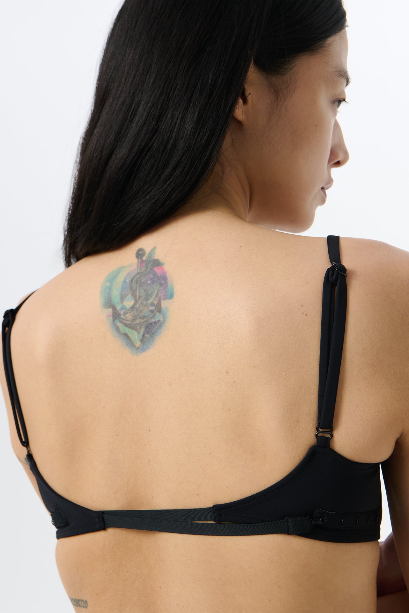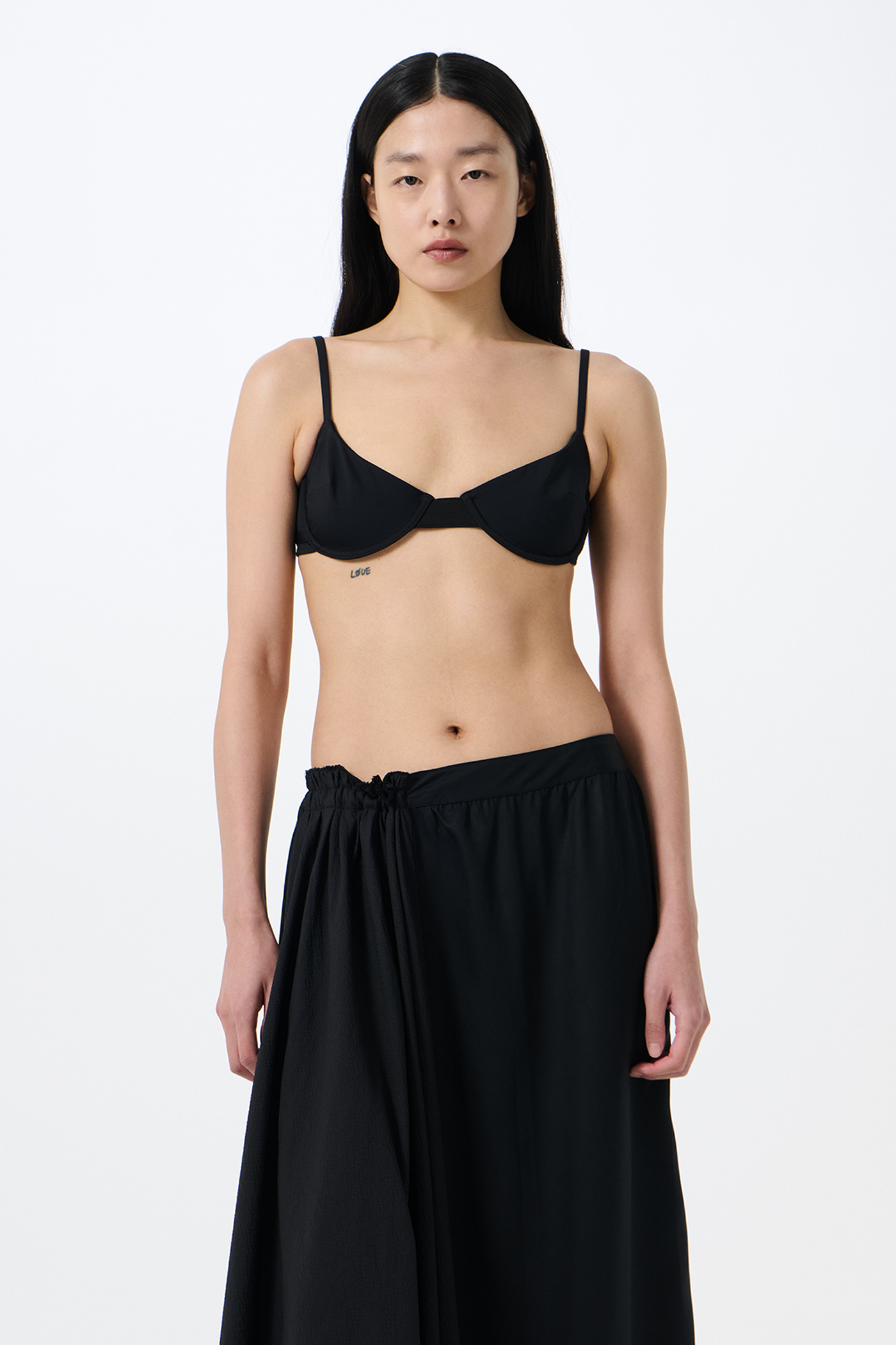 Our Meguro Bikini Top in Jet Black Jersey. Produced in Portuguese stretch jersey crafted from polyamide and elastane, the women's Meguro Bikini Top features wired cups for support, slender spaghetti straps, and a detailed adjustable fastening at the back.