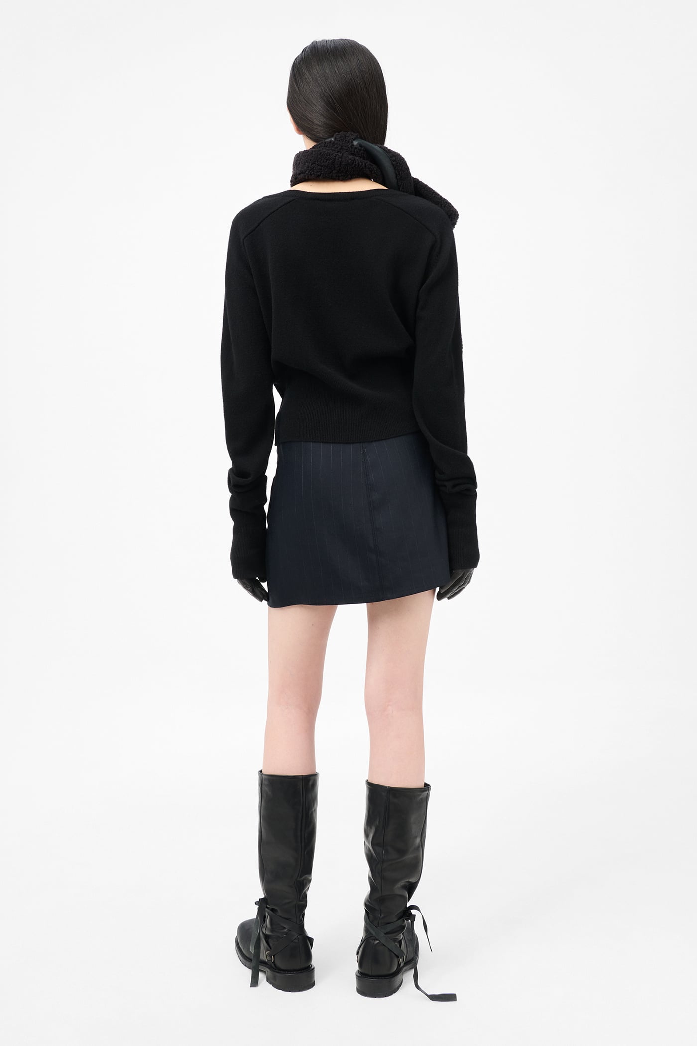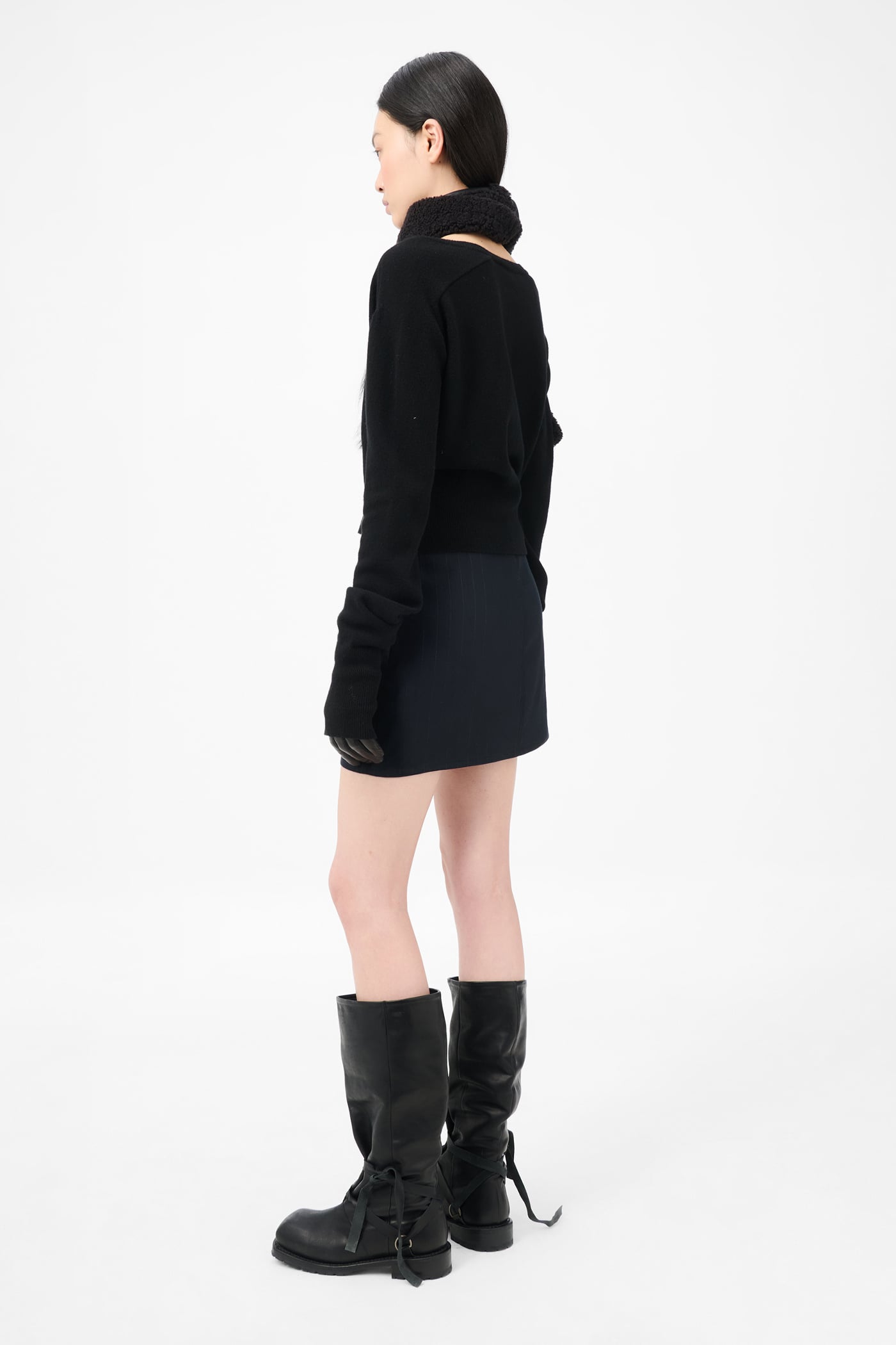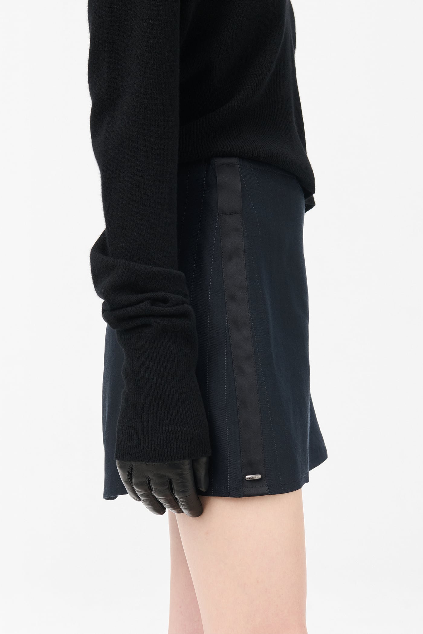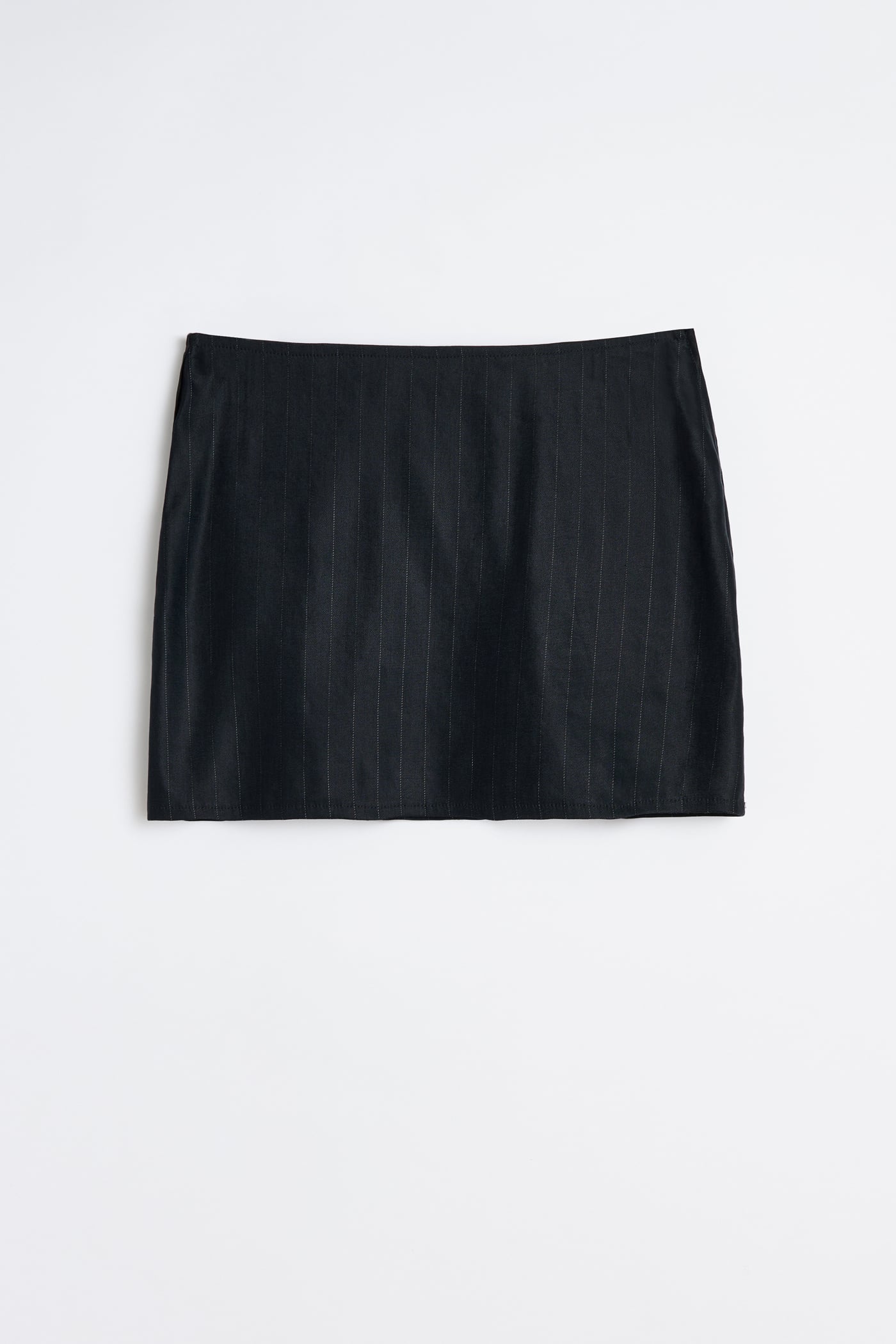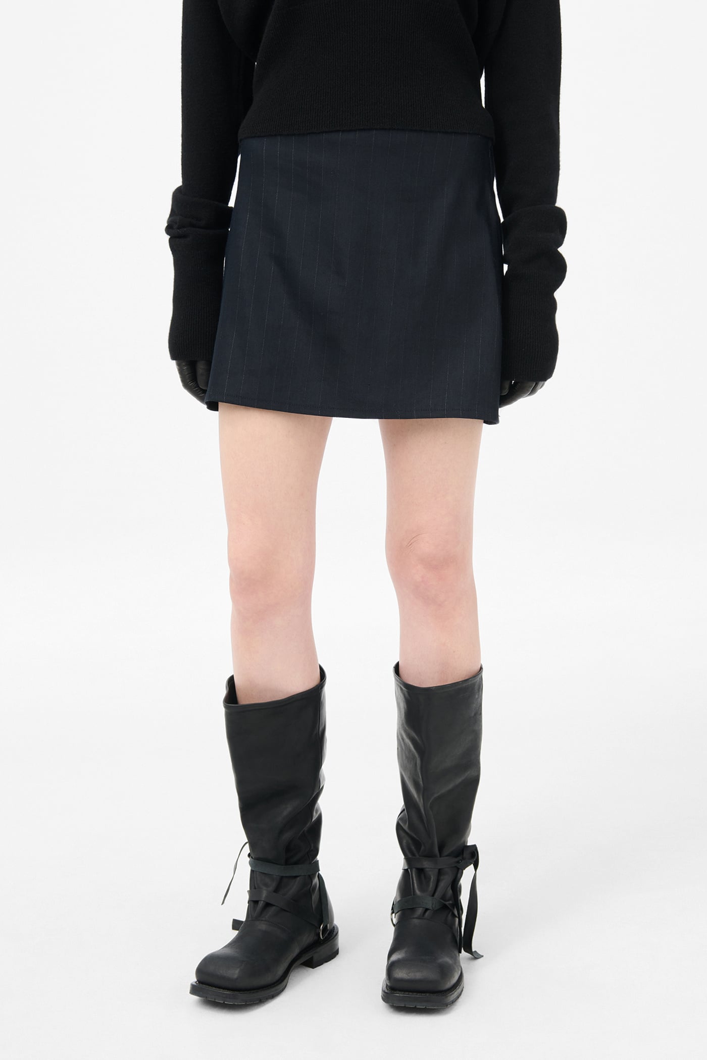 Our Mini Skirt in Night Covert Flex Pinstripe. Produced in Italian technical fabric with a viscose and linen blend, the women's Mini Skirt has a slim fit and features a herringbone side stripe, RiRi side zip, hook guard, Our Legacy metal rivet, and is fully lined.