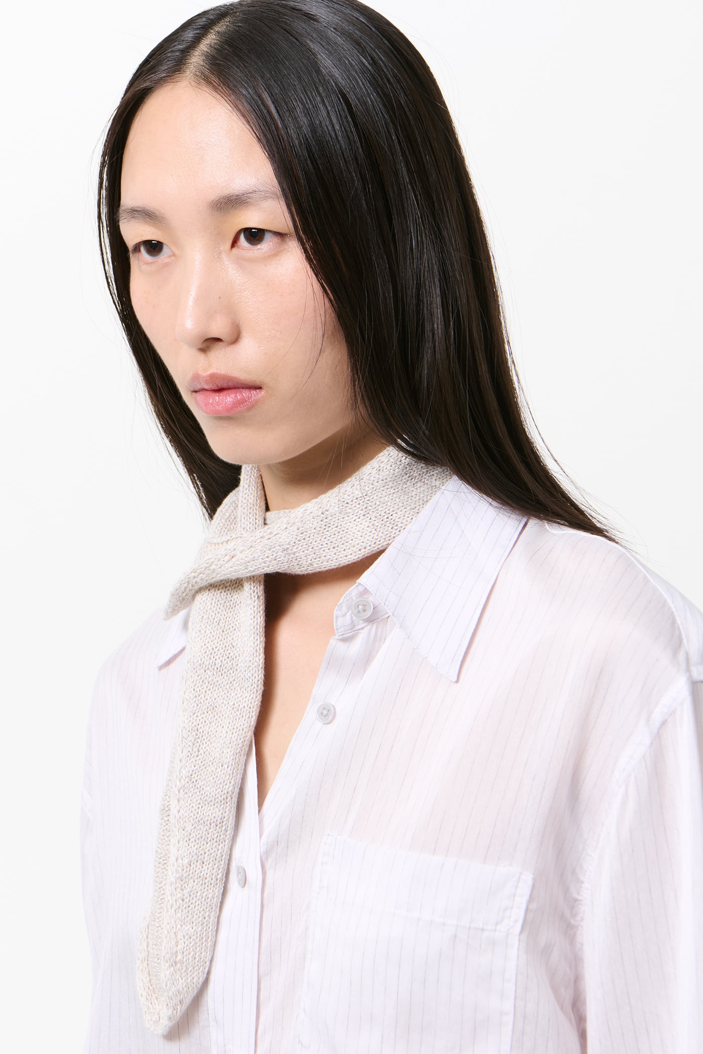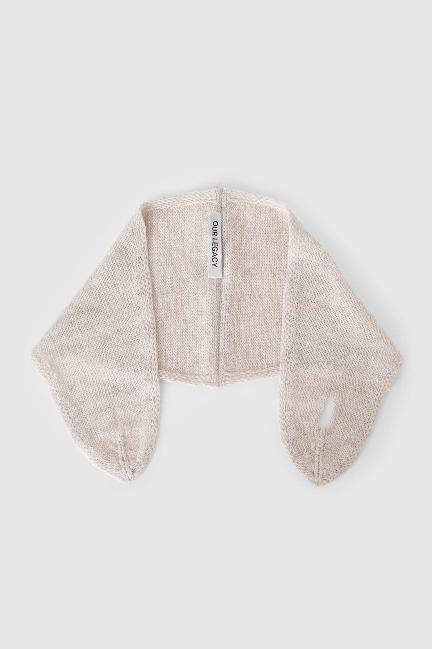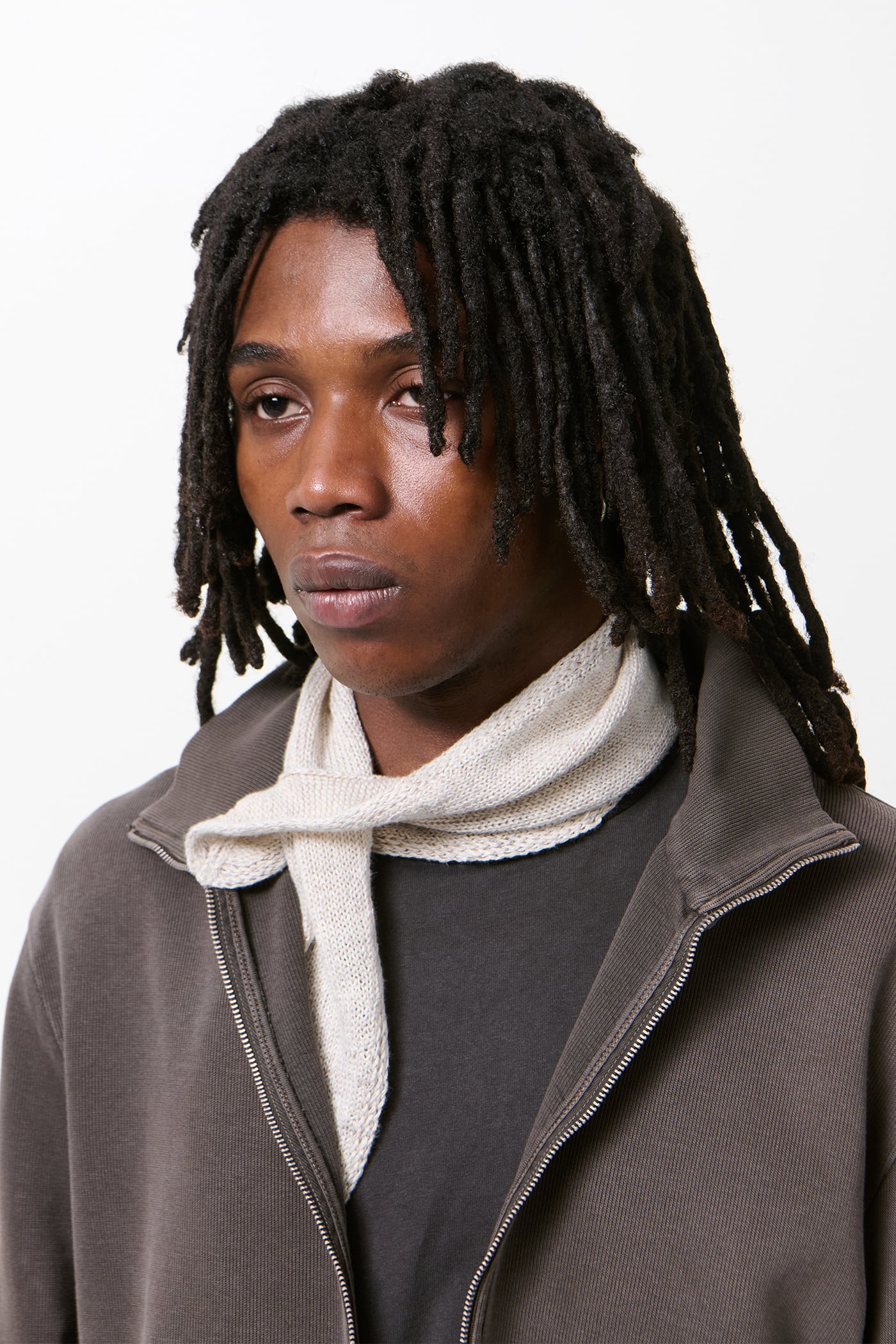 Our Miniature Scarf in Soft Ecru Cyclone Linen. Knitted from Italian linen and organic cotton yarn. The Miniature Scarf features an integrated knitted opening for looping through itself, full needle edge finishing and a centre seam with the Our Legacy tab logo.