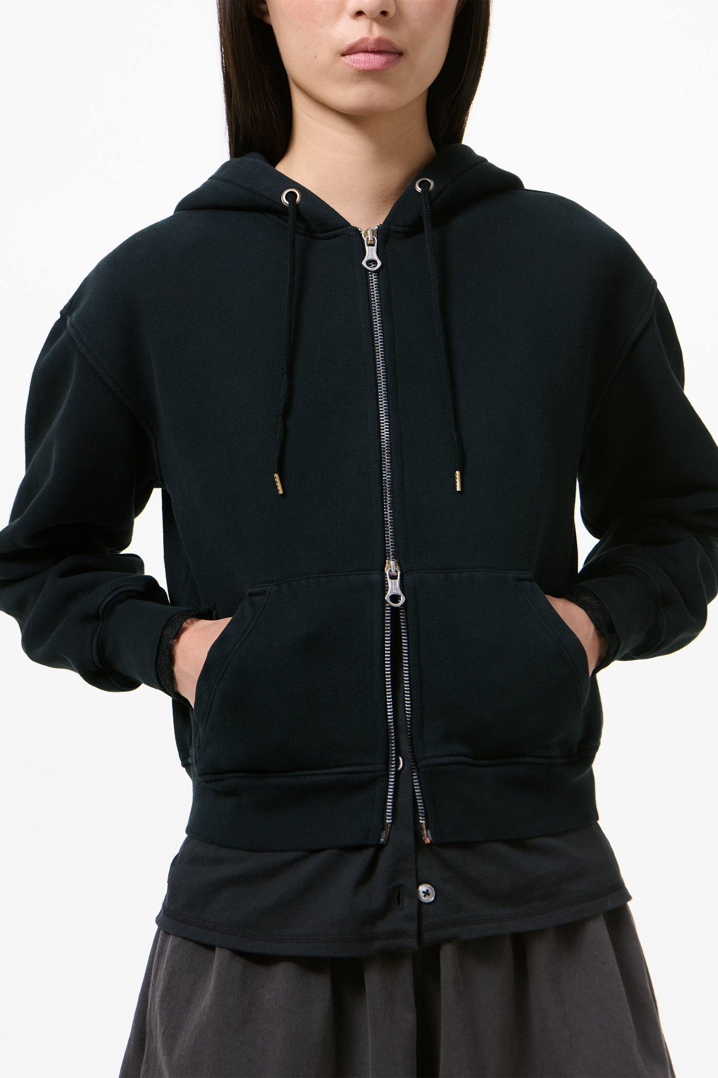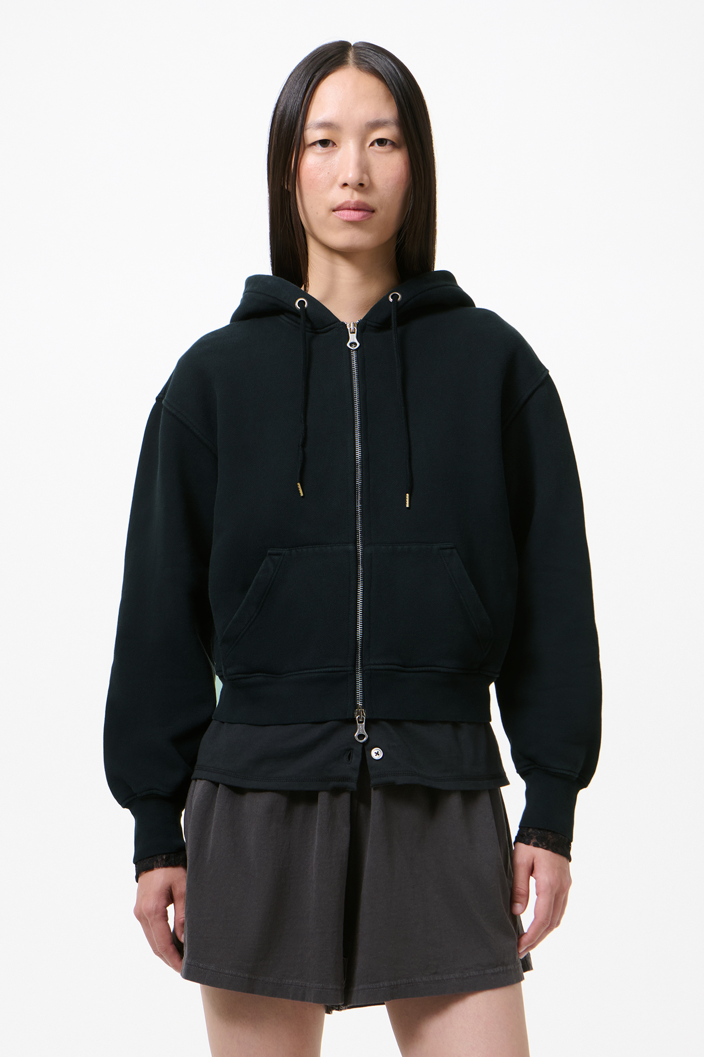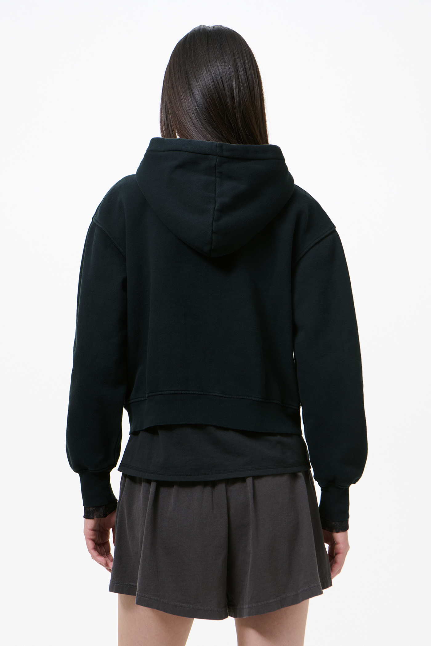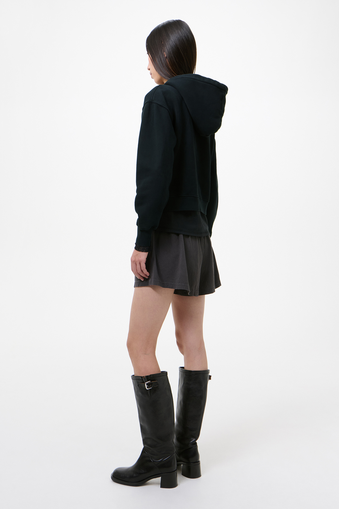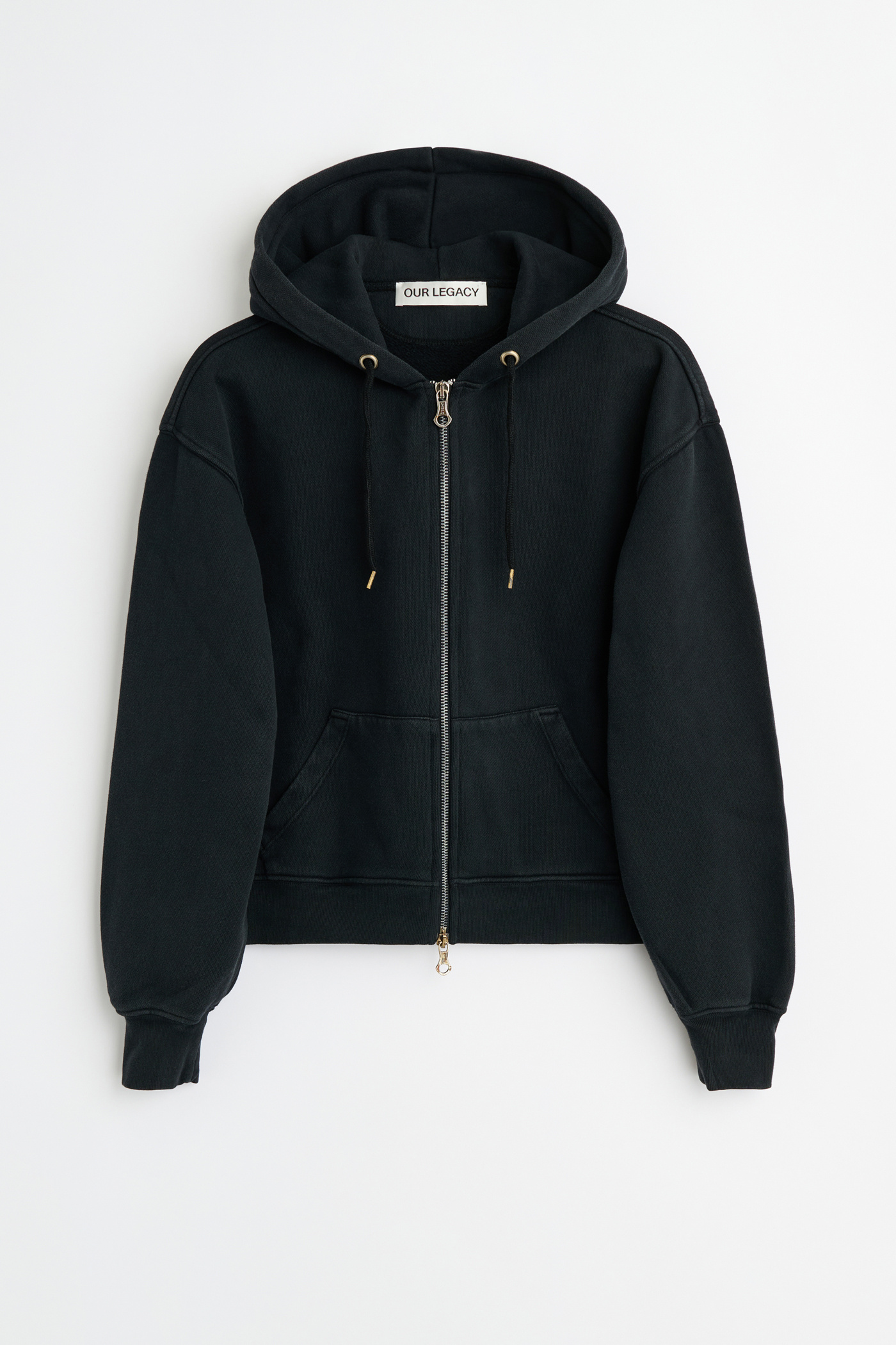 Our Mischief Hood in Washed Black Star Fleece. Produced in a Portuguese heavyweight organic cotton jersey, pigment dyed and finished with specialized treatments, the fleece offers a dense, soft hand with warm, comfortable wear. The vintage-inspired, lived-in character gives each piece depth and uniqueness, while the knit construction provides insulation and breathability. the hoodie has a boxy, cropped fit and features a drawstring hood, a Lampo two-way zip, a kangaroo pocket, ribbed cuffs and hem, and dropped shoulders. Pigment dyed for a washed black finish.