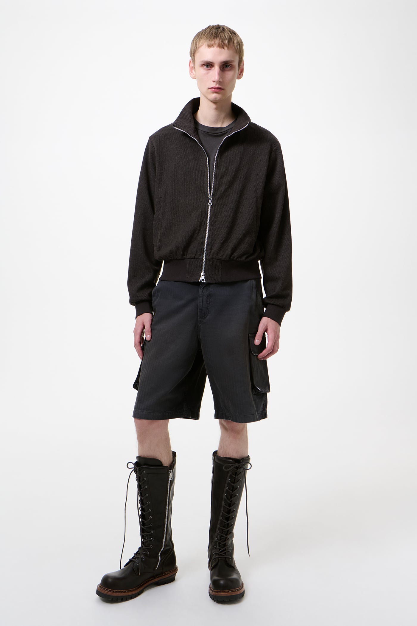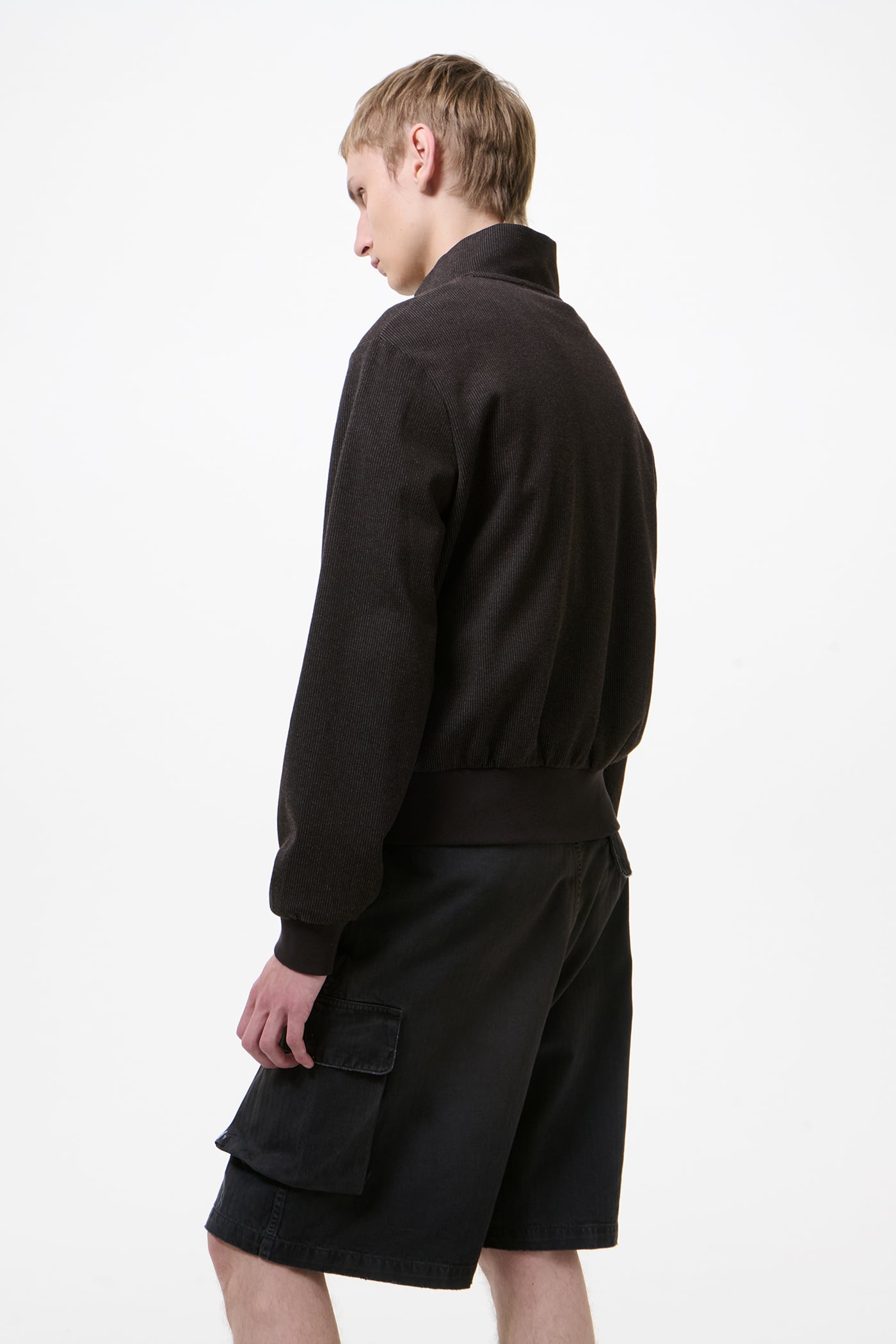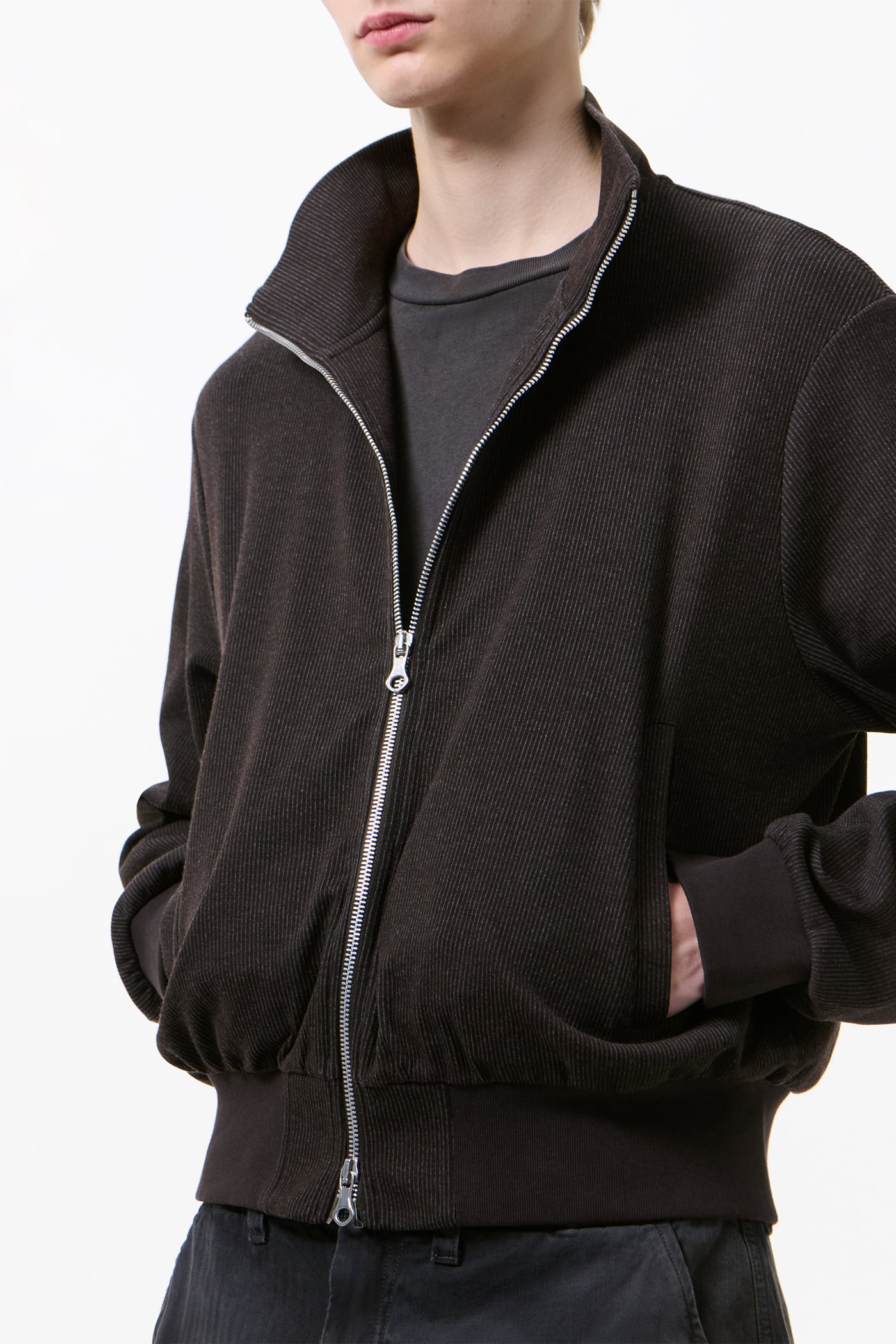 Our Mob Jacket in Track And Field Pinstripe. Produced in Portuguese fabric woven from cotton, polyester, wool and polyamide, the men's MOB JACKET has a regular, straight fit and features a funnel neck, two-way RiRi zip, ribbed cuffs and hem, and two front welt pockets.