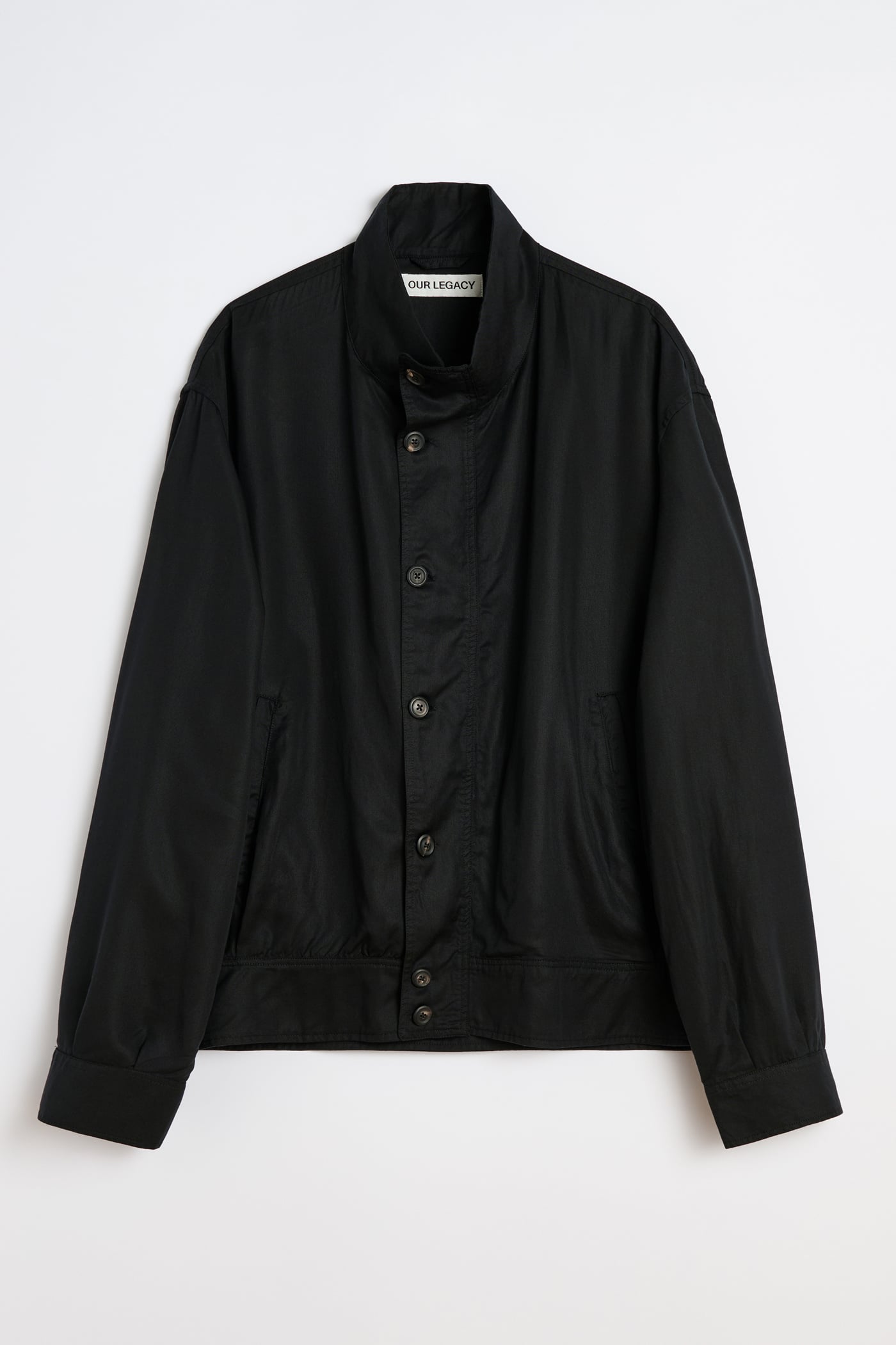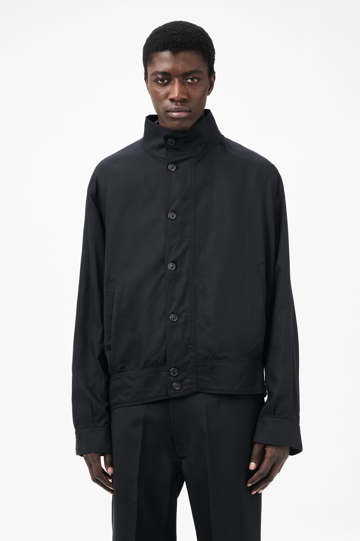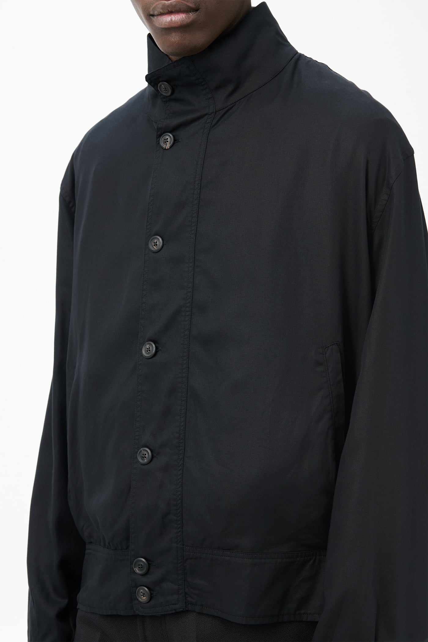 Our Mock Bomber in Draping Black Lyocell. Produced in Portuguese lyocell fabric, the men's Mock Bomber has a relaxed fit and features a funnel neckline, pleated waistband and cuffs that create soft flow and volume, and horn buttons. Taking inspiration from bomber jackets, this design skips traditional knitted ribs in favor of multiple pleats that replicate the characteristic volumes while creating beautiful drape through the piece.