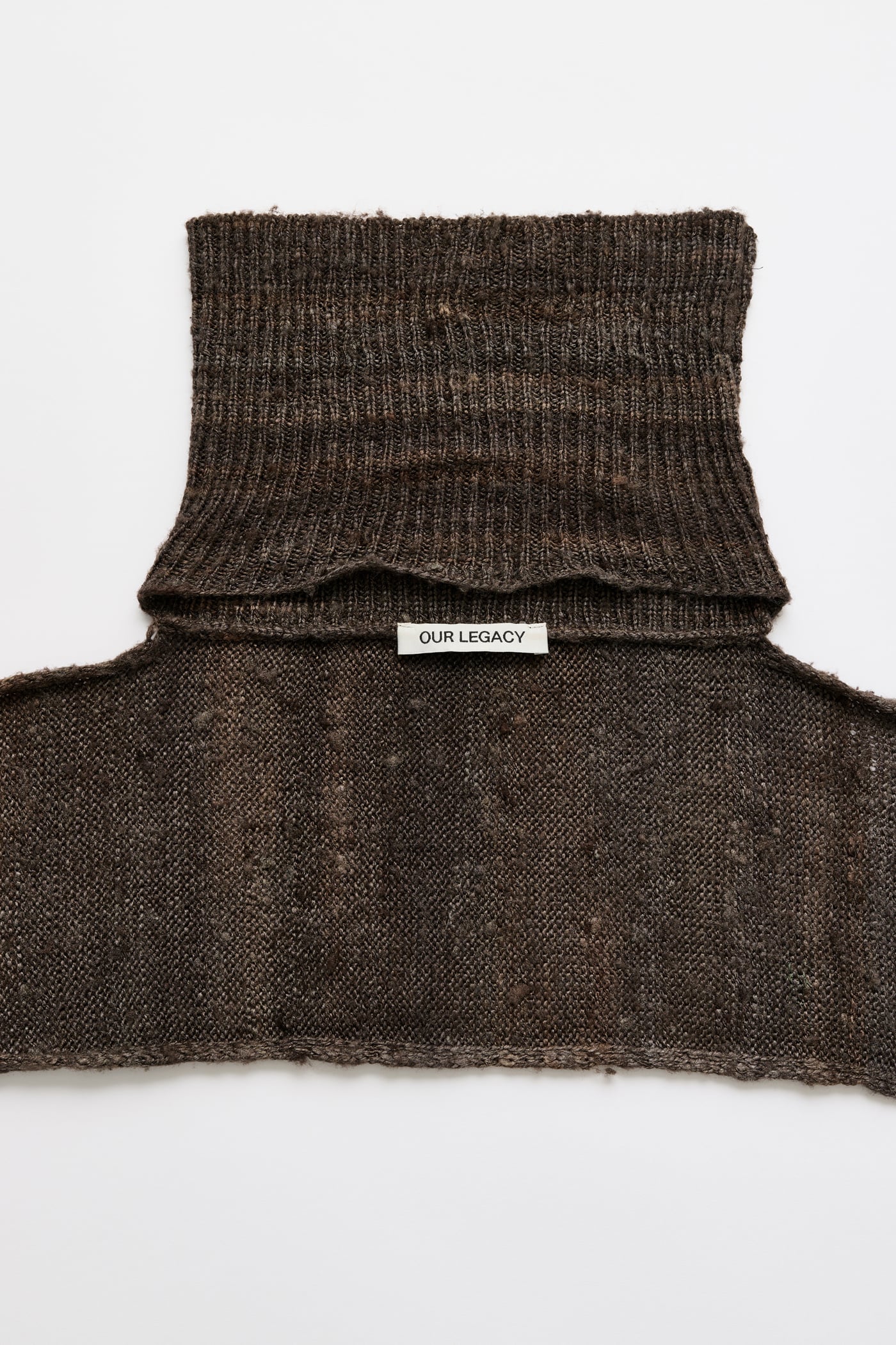 Our Mock Scarf in Wathered Earth Handspun Silk. Produced in Italian handspun silk yarn, the Mock Scarf is knitted in a single-layer jersey stitch with a 1x1 rib and features a ribbed turtleneck. The handspun silk imparts a distinct texture with subtle irregularities that underscore its artisanal character.