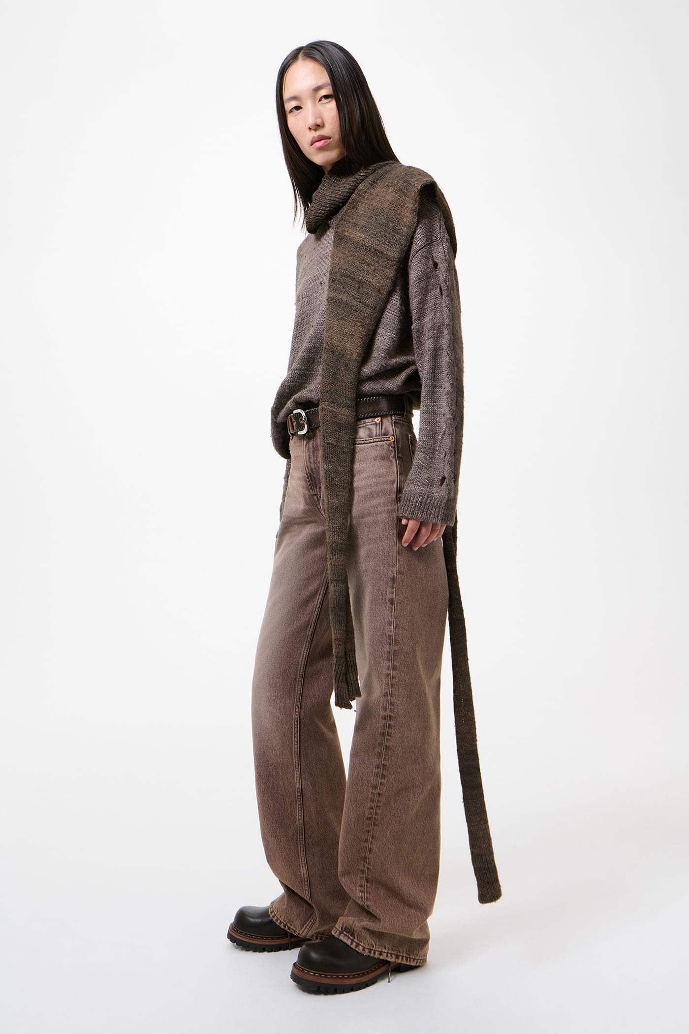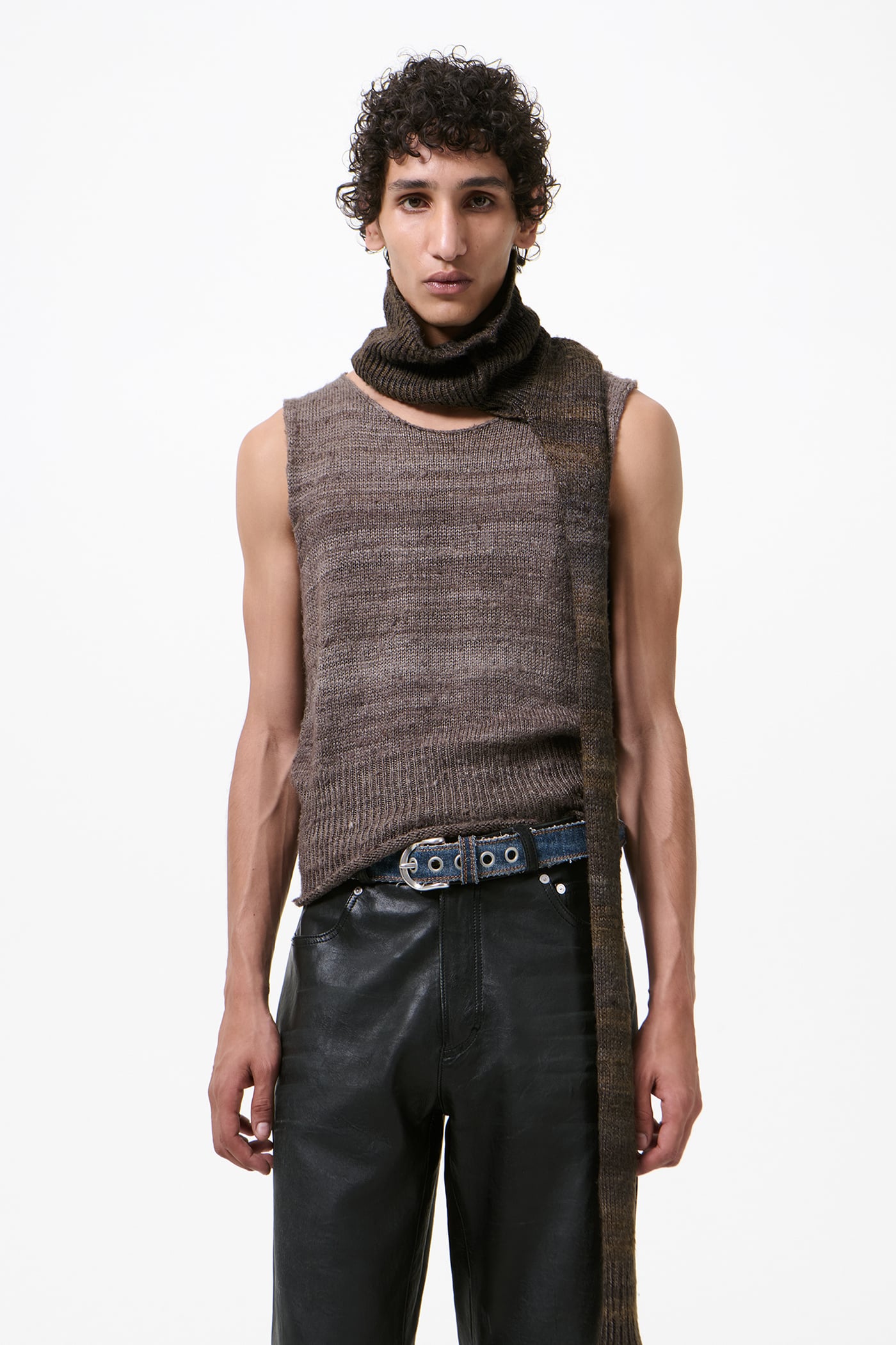 This garment is manufactured using a carefully sourced yarn. The natural characteristics of the yarn, combined with the construction of the knit allows the garment to expand when worn. The garment shall be shaped by its wearer and naturally distress over time to finish the design process. To help keep the integrity of the garment please store the garment folded.
