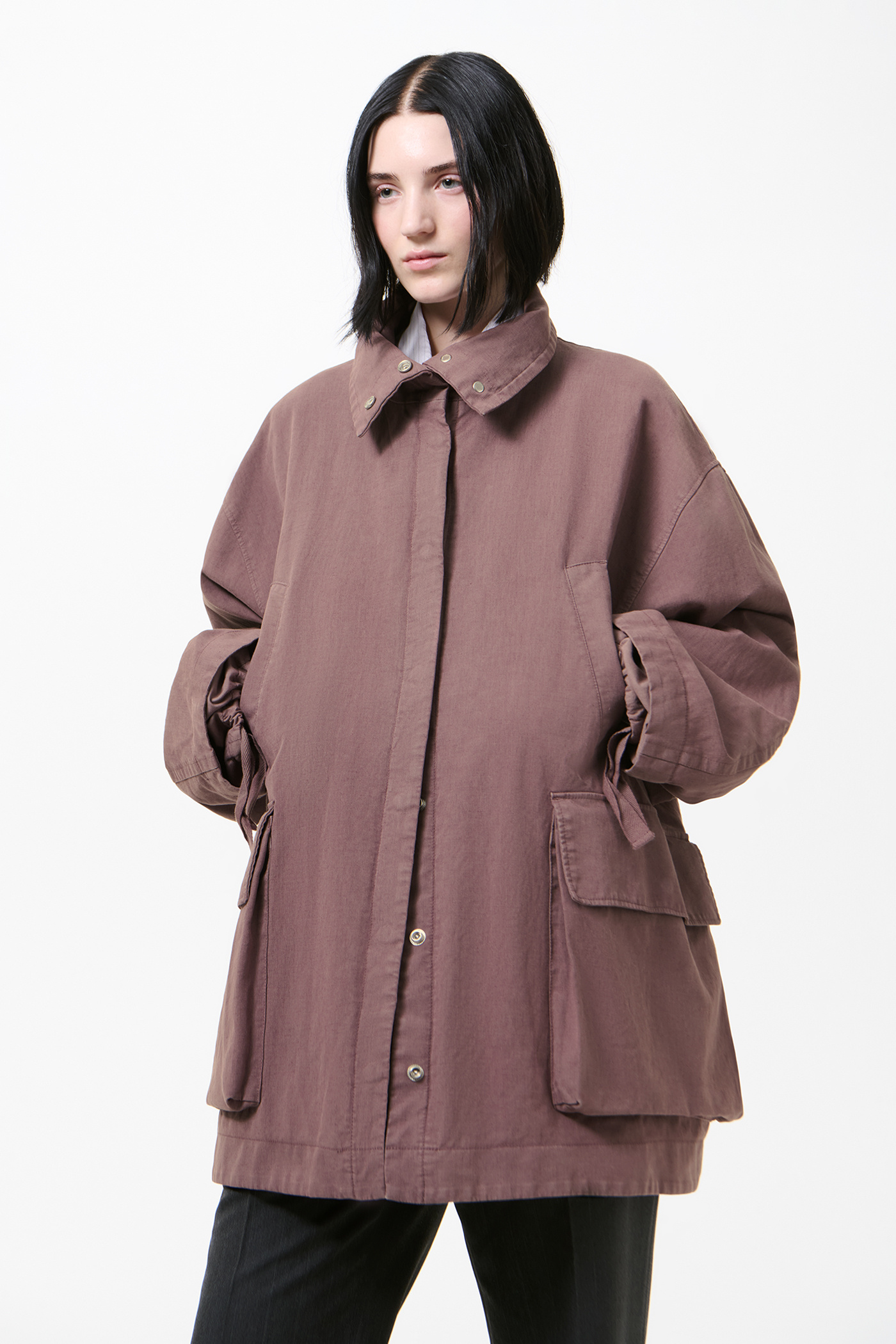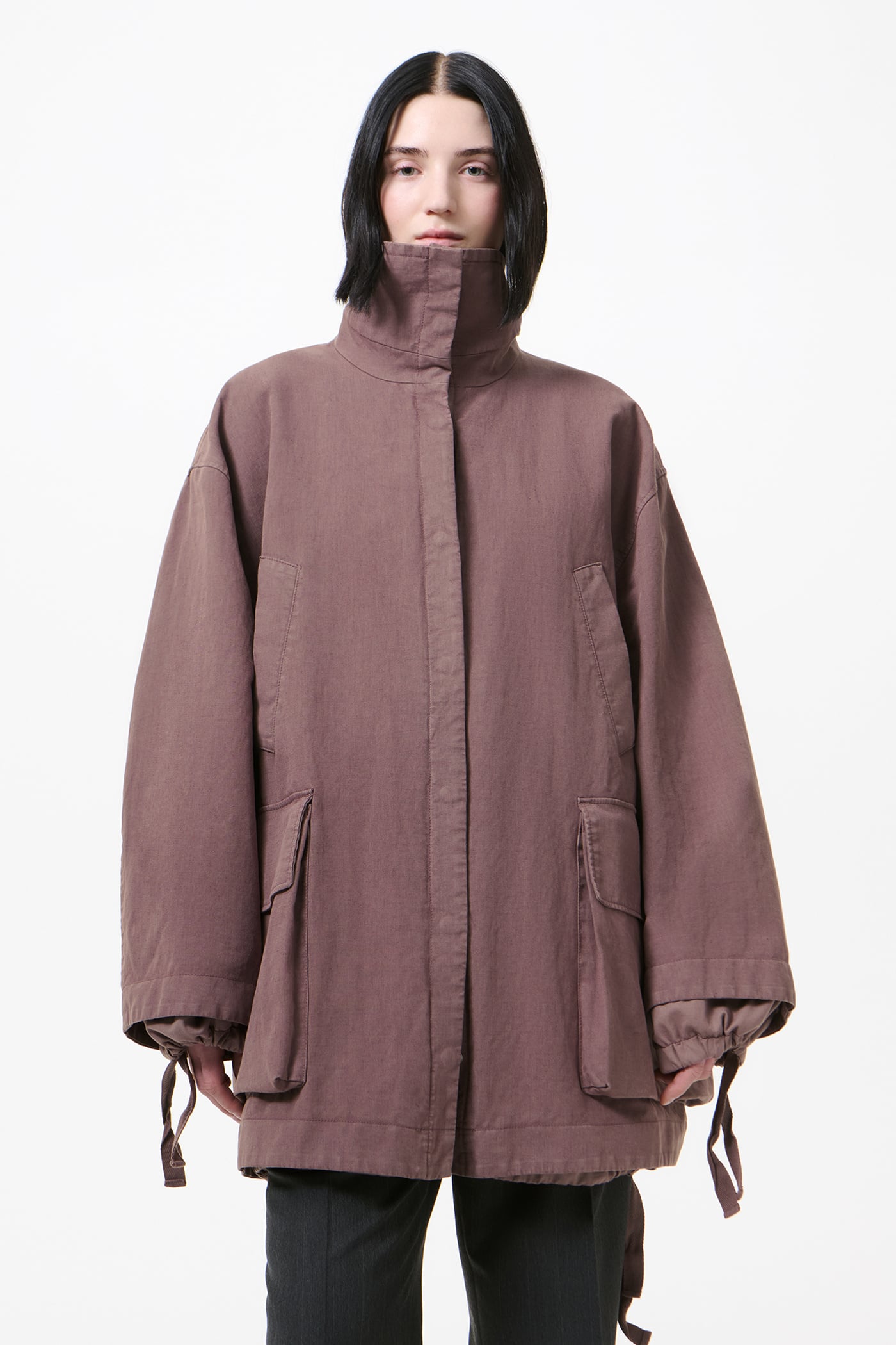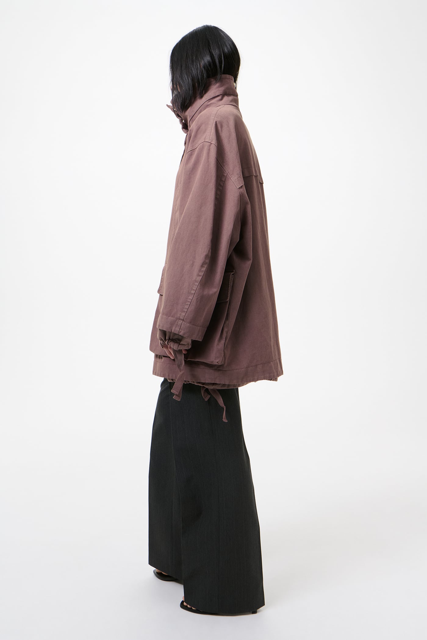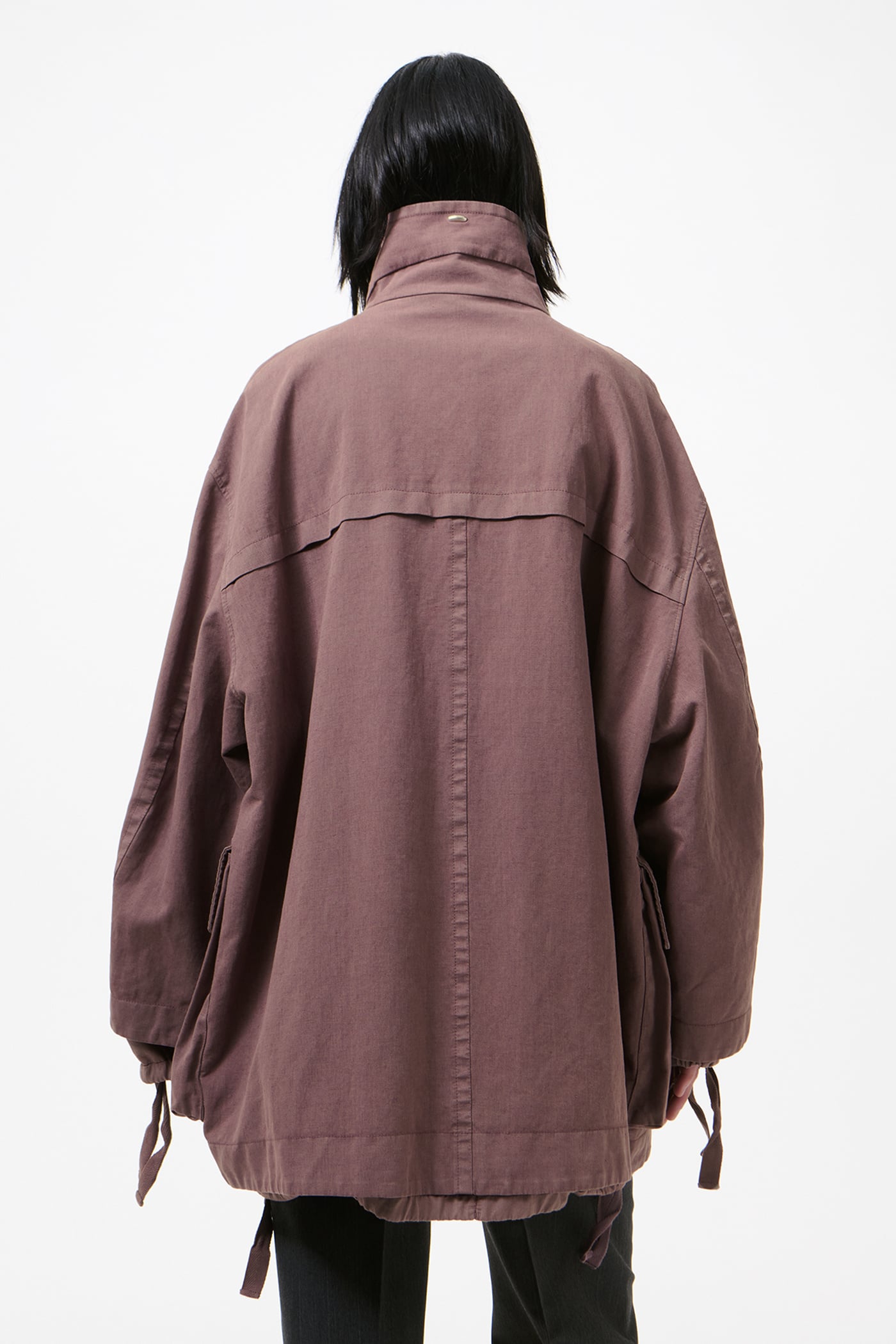 Our Mole Jacket in Port Soft Coat. Produced in a Chinese cotton and linen fabric with polyurethane, the Mole Jacket has an oversized, elongated windbreaker silhouette and features a high funnel neck, a hidden snap placket, generous slouchy patch pockets and hand-warming welt pockets. Soft contrast panels at the sleeves and hem include webbing tie details that can be ruched for added wind and rain protection.