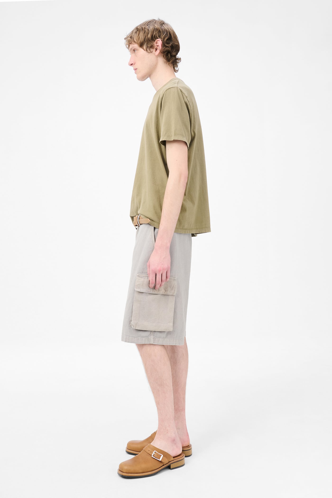 Our Mount Shorts in Stone Gravel Draping Canvas. Produced in a Turkish cotton and hemp canvas, our men's Mount Shorts have a relaxed fit and feature two cargo side pockets, a button closure at the waist, and a single back pocket.