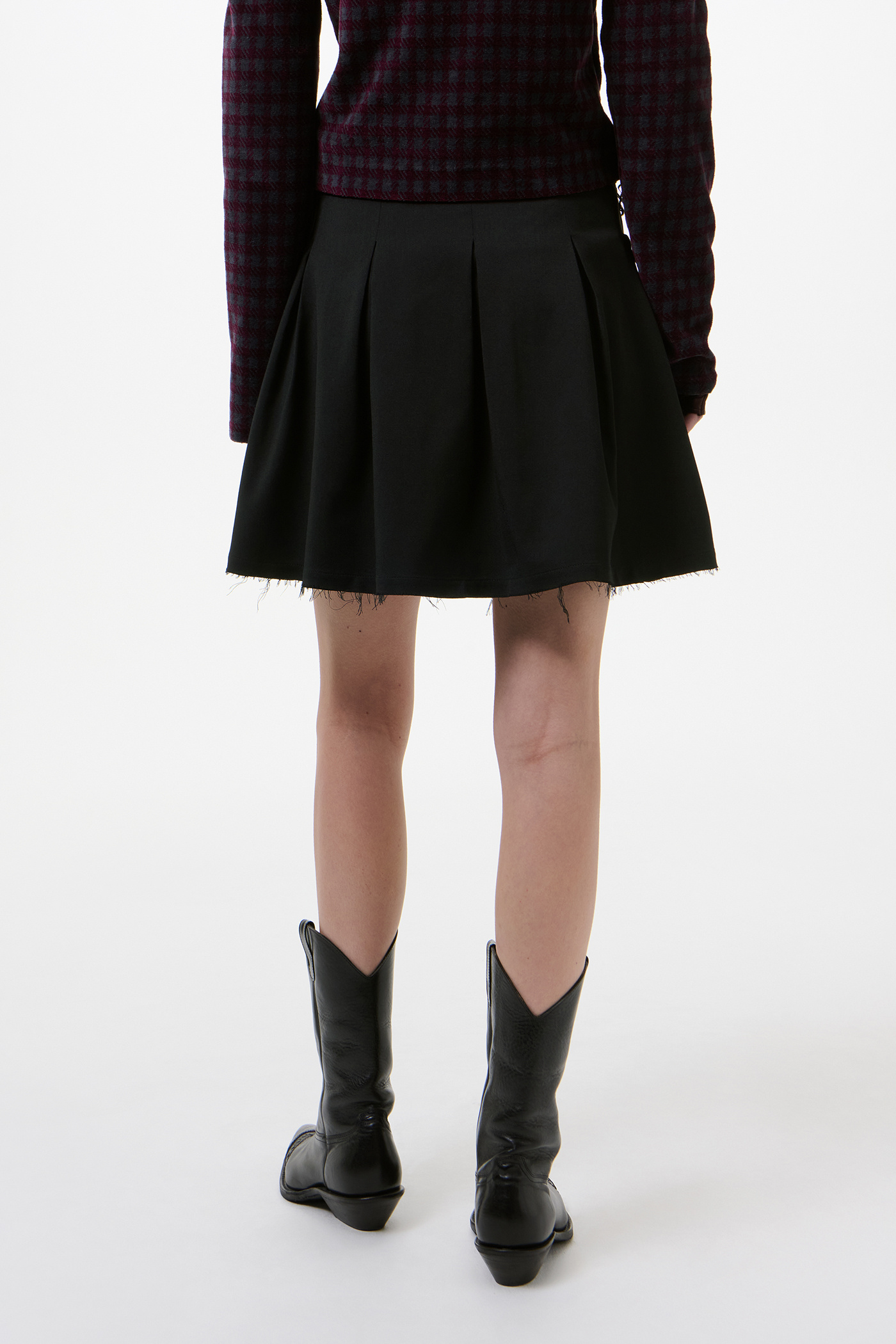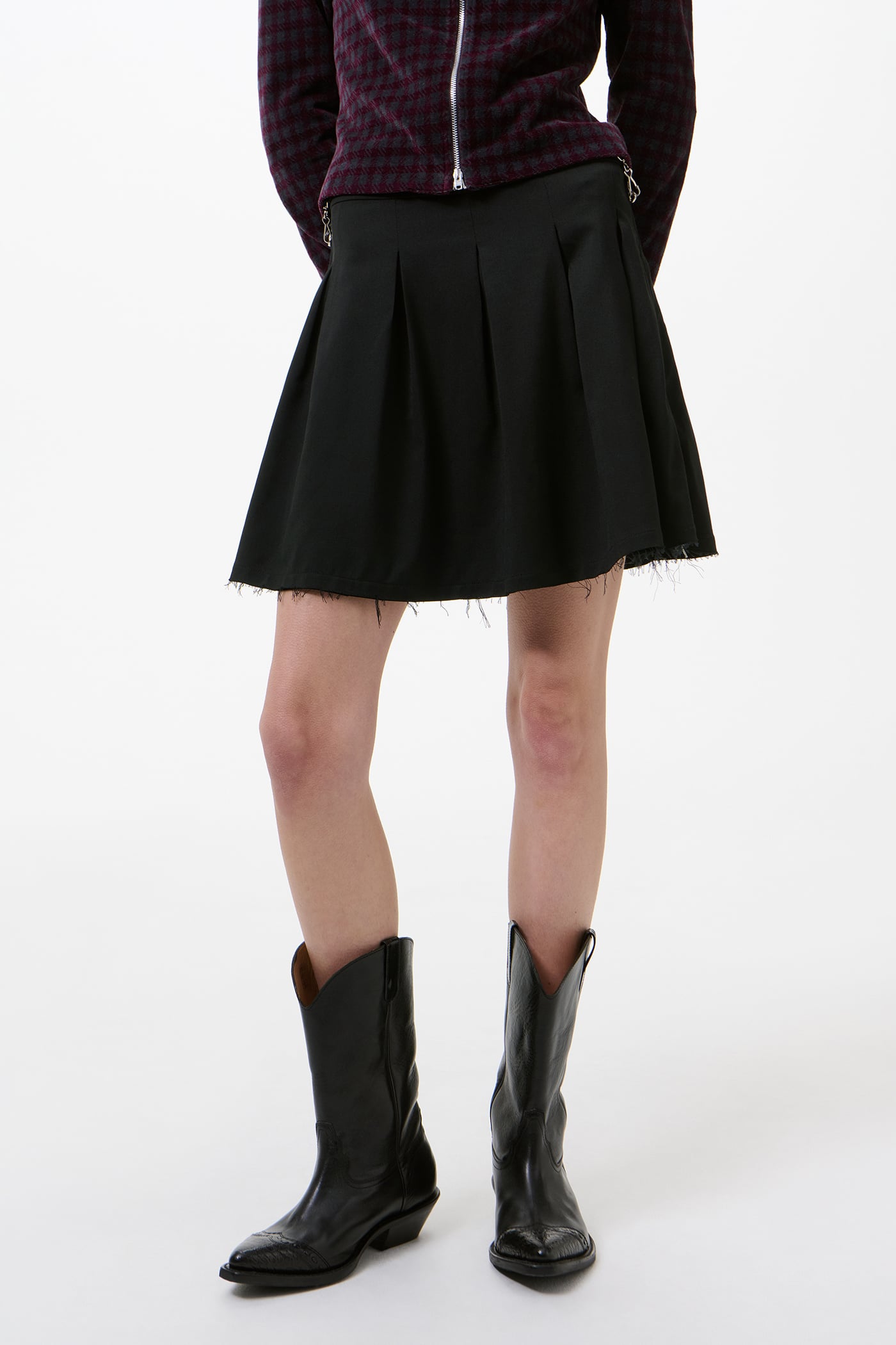 Our Object Skirt in Black Worsted Wool. Produced in an Italian virgin wool suiting fabric, the women's Object Skirt has a pleated construction and features a raw edge hem, hook and eye waist closure, and Lampo zip closures on both sides that can be opened to change the silhouette.