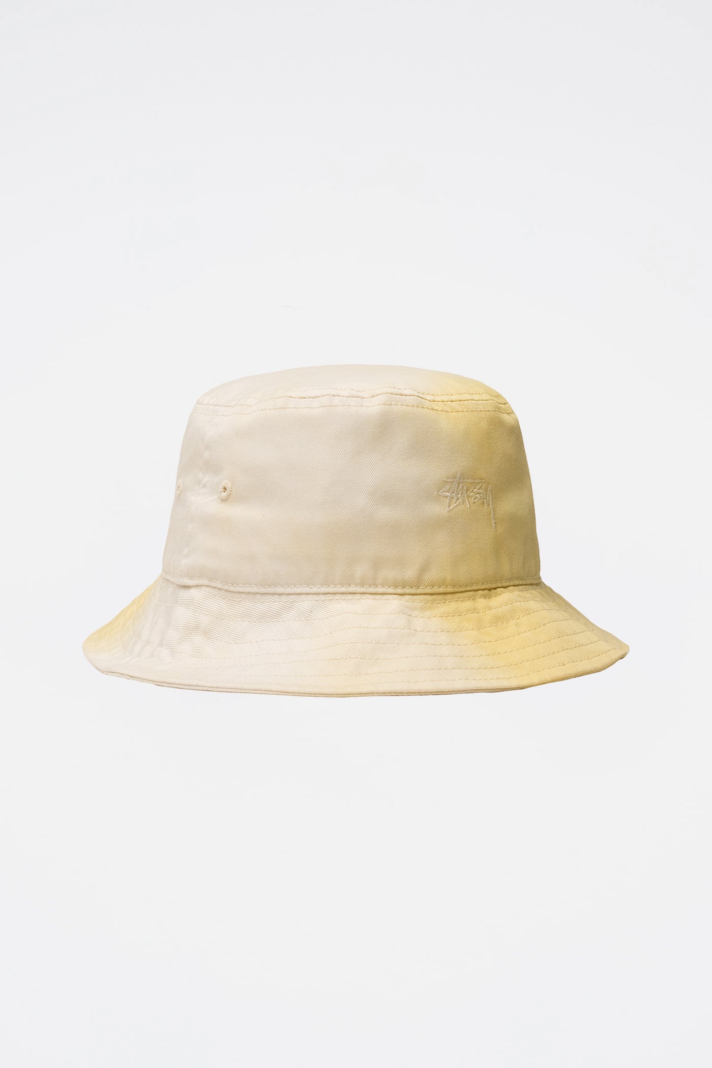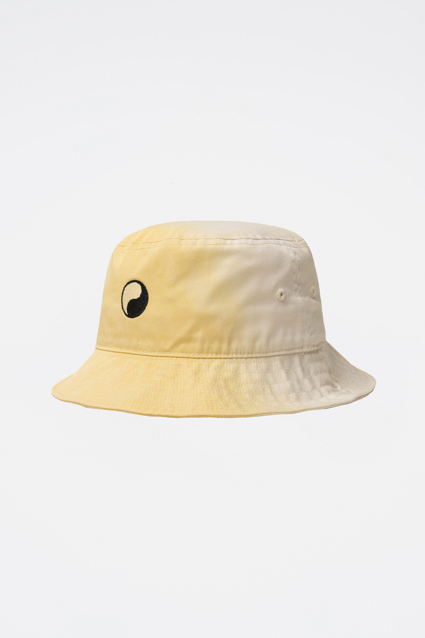 OL RECYCLED TWILL BUCKET HAT in Yellow. Produced in a recycled polyester and organic cotton blend Stüssy fabric, individually hand-dyed using Osage orange and weld in Los Angeles, California by Niki Tsukamoto. The Bucket Hat features a reinforced stitched brim, an embroidered Yin Yang patch and an embroidered Stüssy logo.