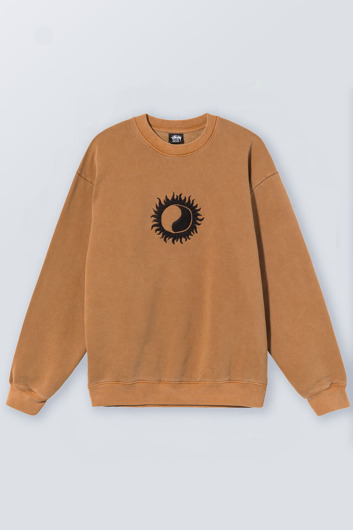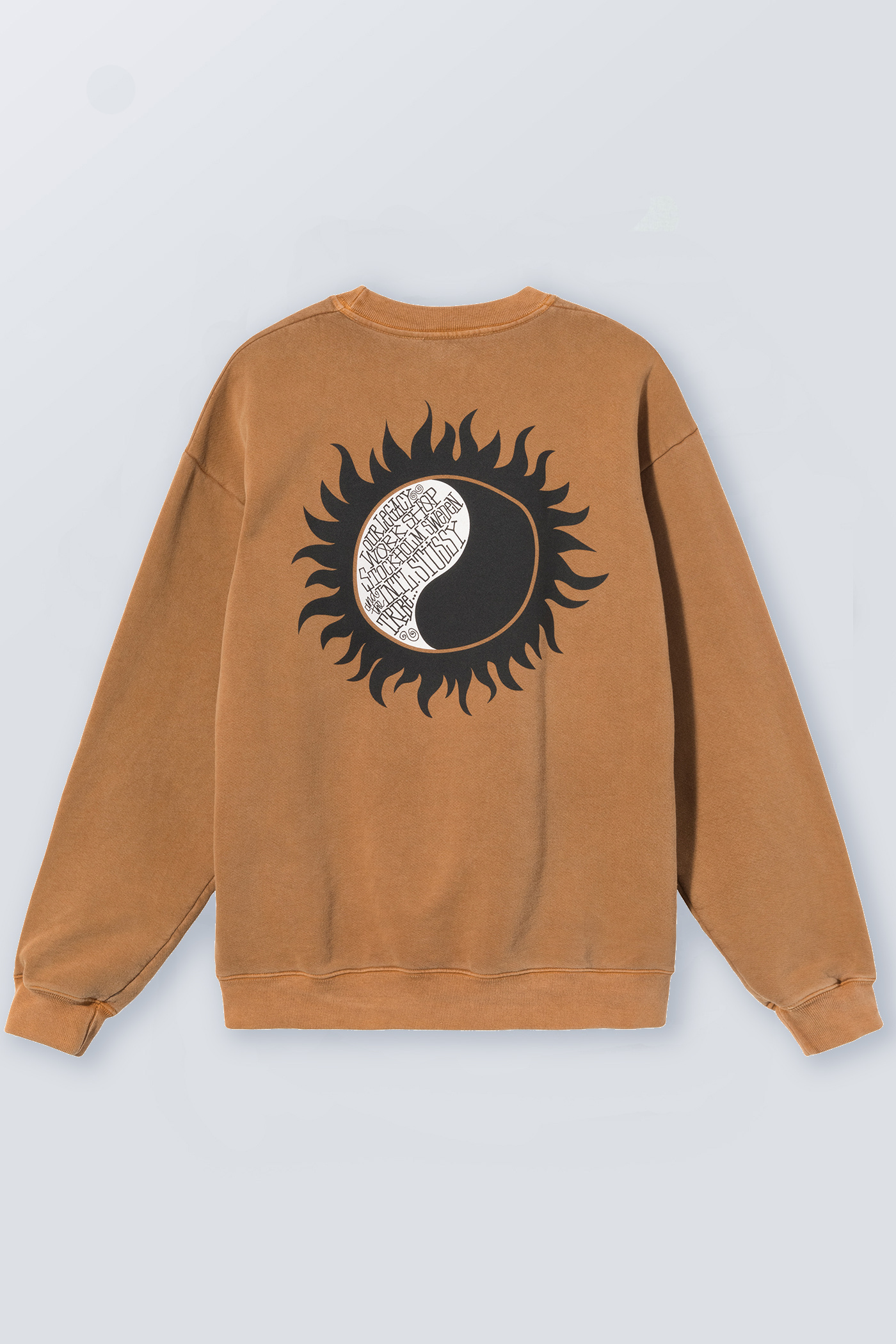 WORK SHOP X STÜSSY OL Sun Pig. Dyed Crew in Caramel. Produced by Stüssy in a pigment dyed ecocycle cotton jersey, the crew features an embroidered front Yin Yang logo and a Stüssy x Work Shop back print.