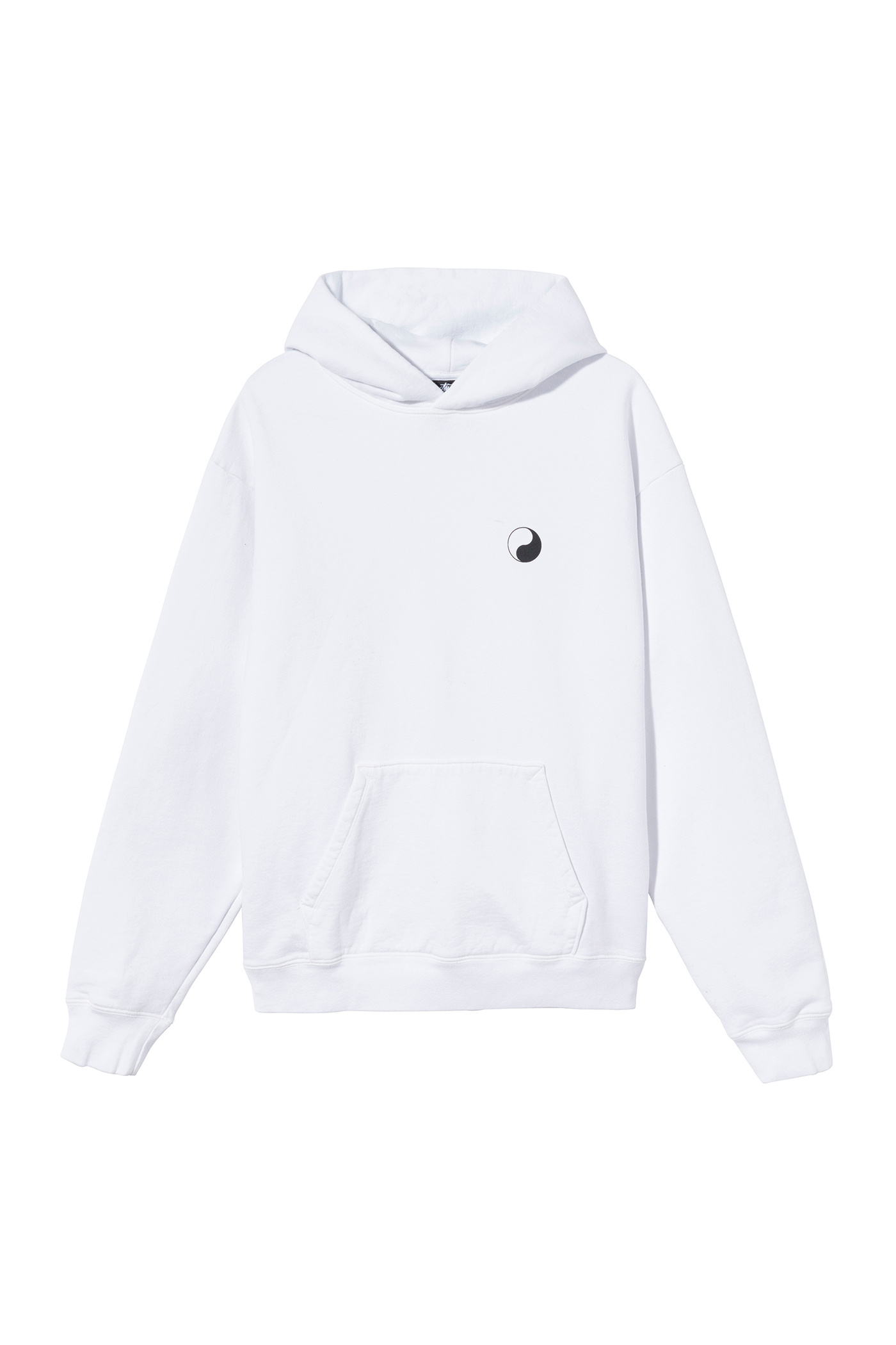 WORK SHOP X STÜSSY OL Yin Yang Pig. Dyed Hood in White. Produced by Stüssy in a pigment-dyed Ecocycle cotton jersey, the hood features a front Yin Yang print and a Stüssy back print.