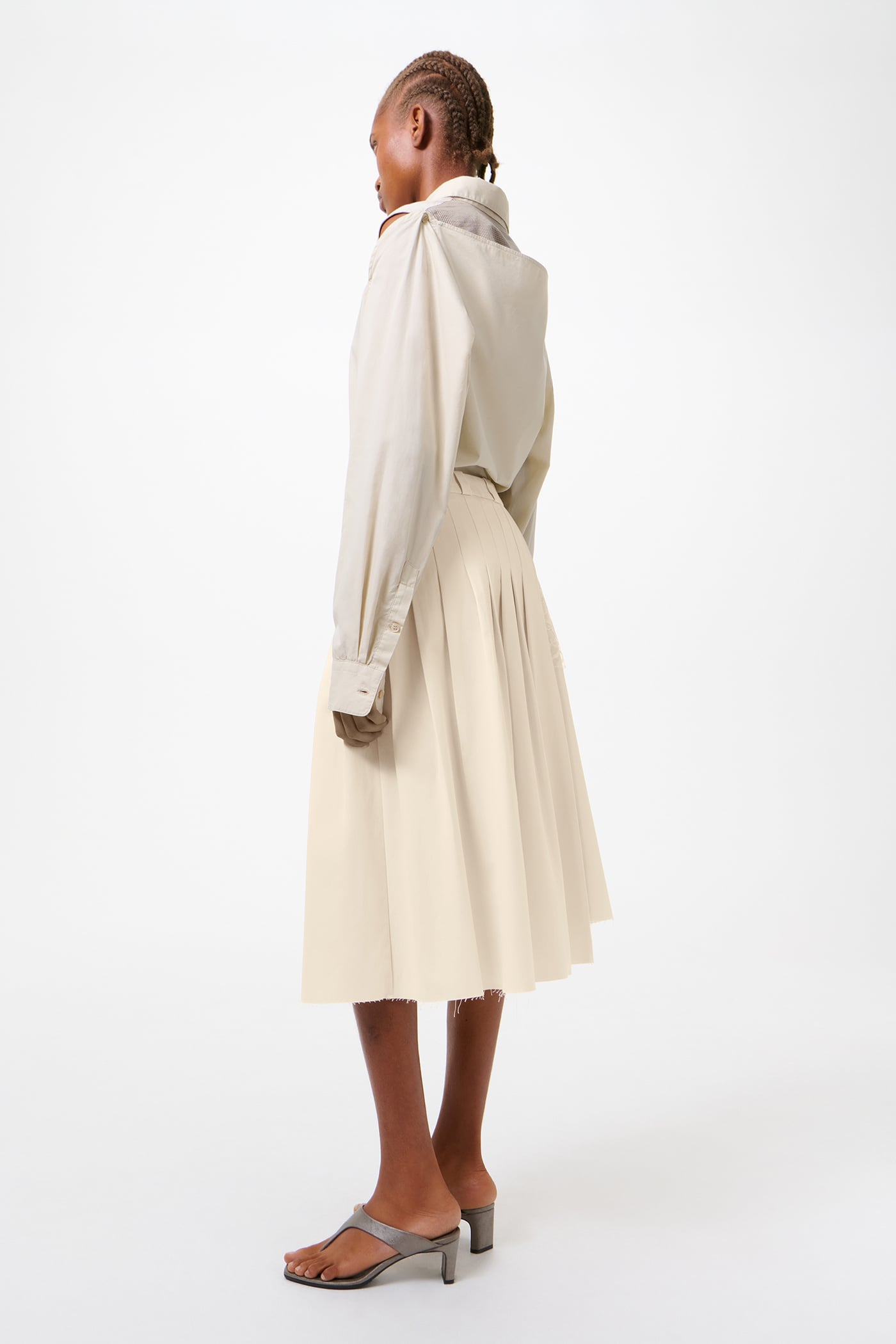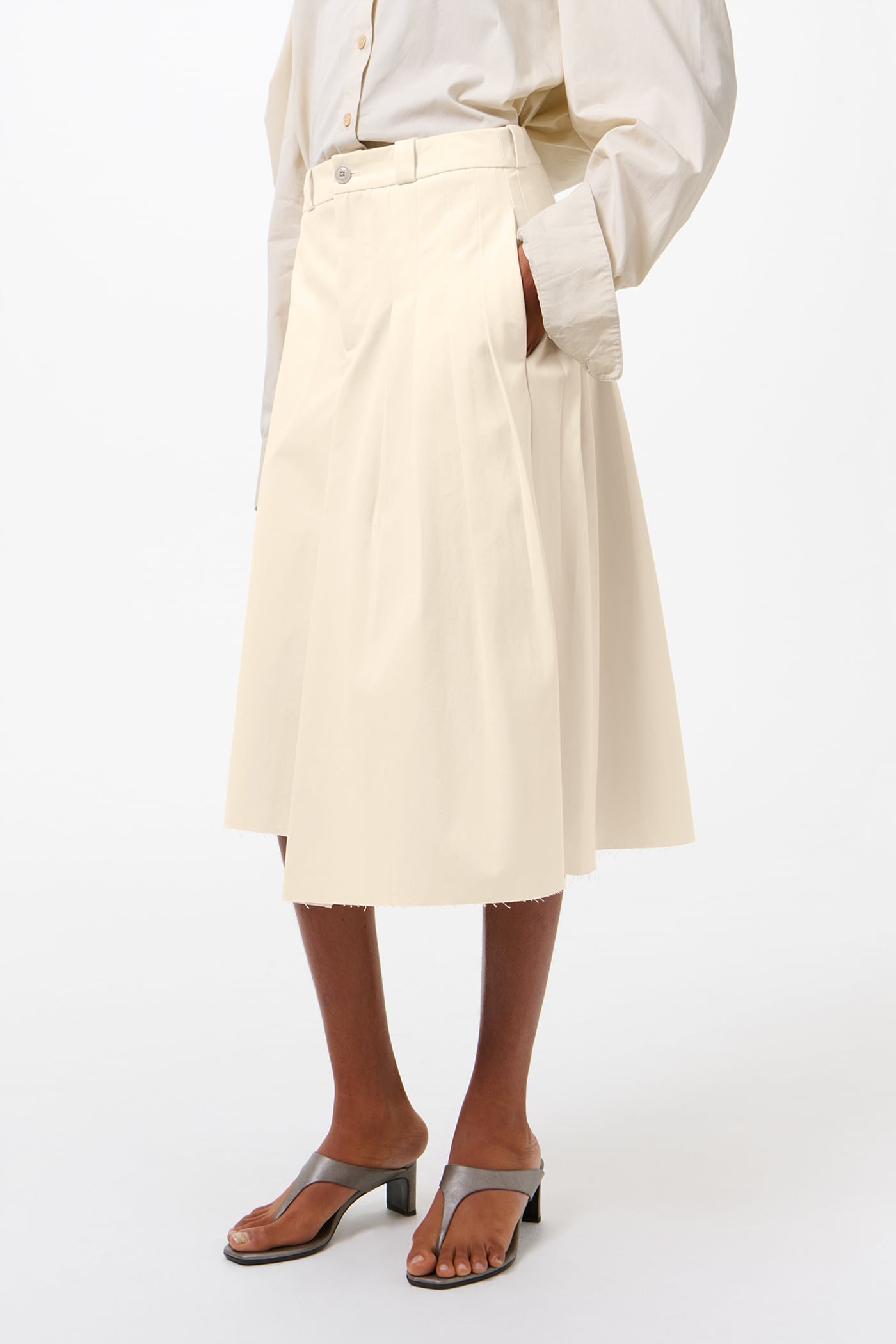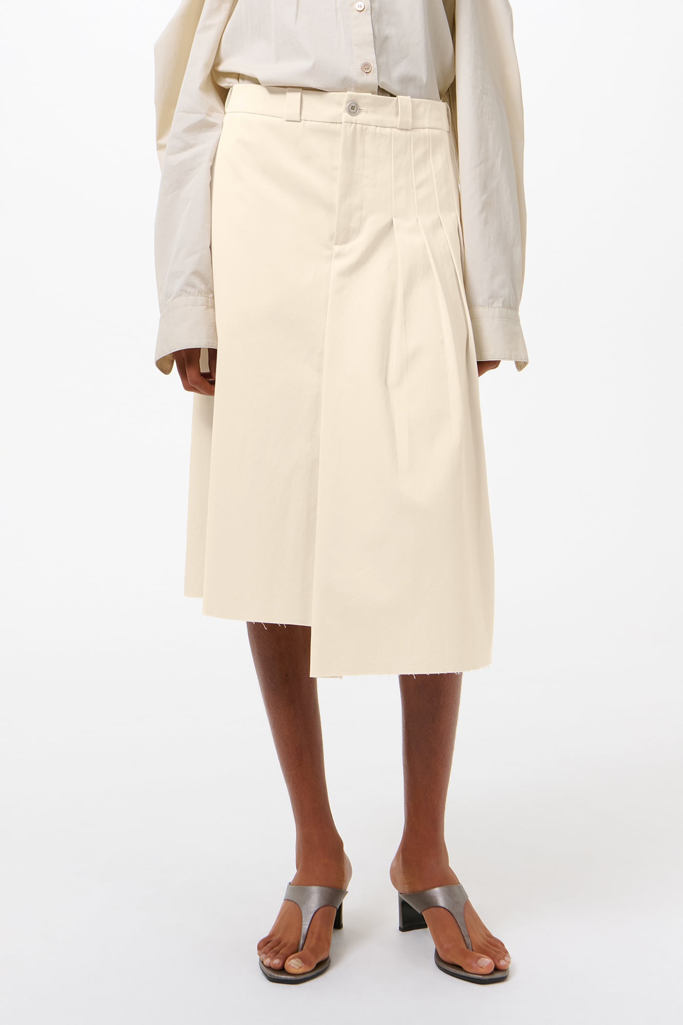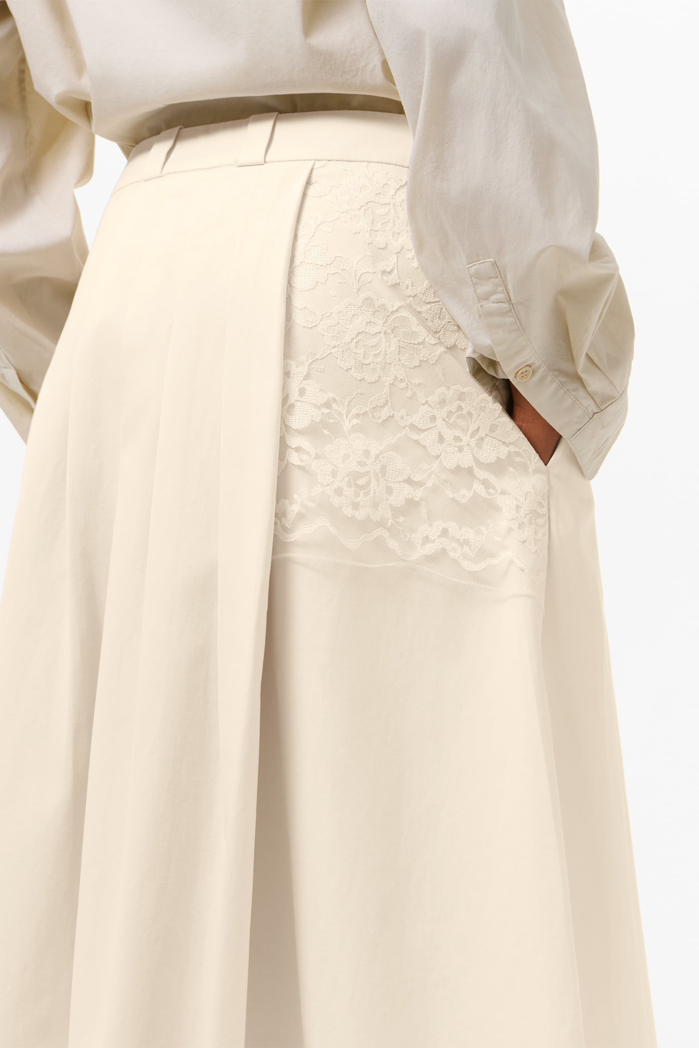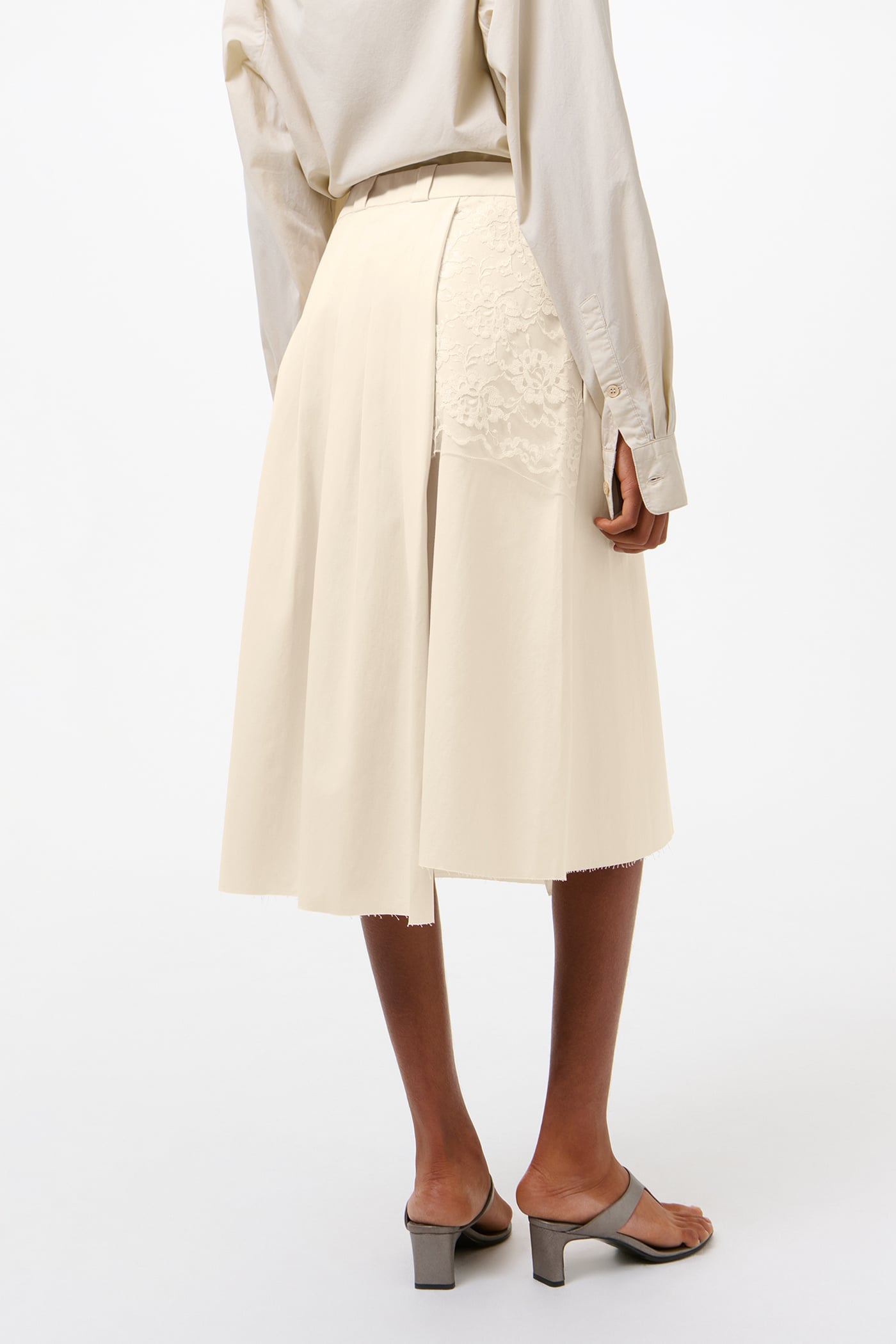 Our Origami Skirt in Soft Ivory Micro Canvas. Produced in Italian cotton micro canvas with a dense, fine weave, the women's Origami Skirt has an A-line silhouette with defined pleats on the left side and back panel and an asymmetrical length, with the left side slightly longer than the right. The skirt features a flower motif lace panel, minimal topstitching with raw hem and belt loop edges, a zip fly with corozo button at the waistband, and a clean bagged out patch pocket at the right back.