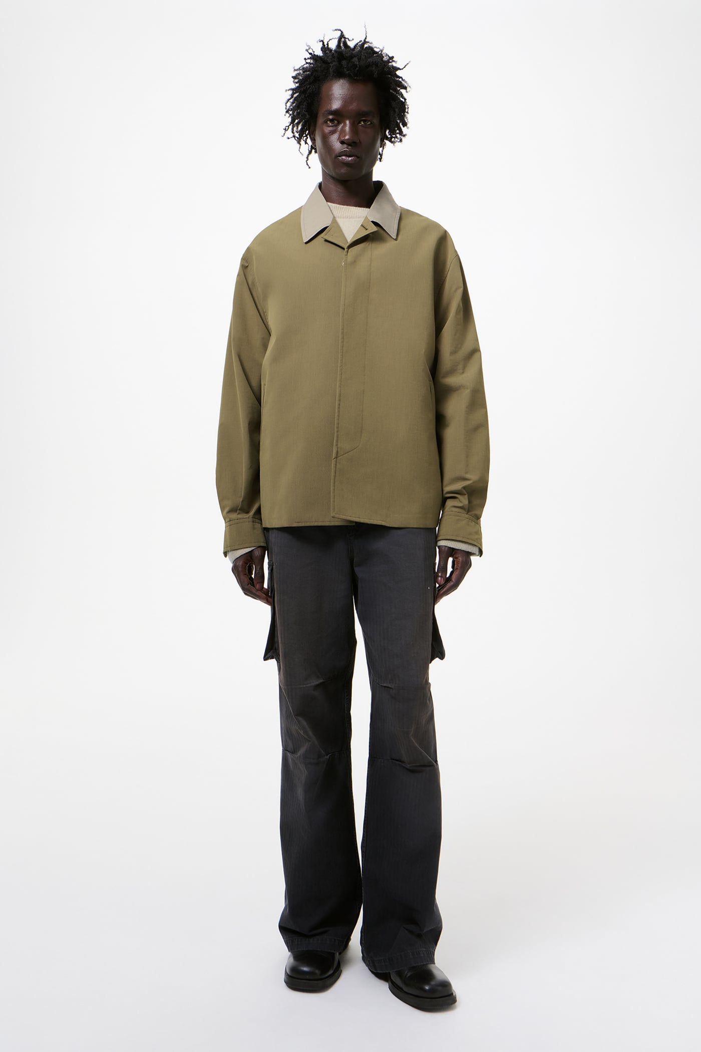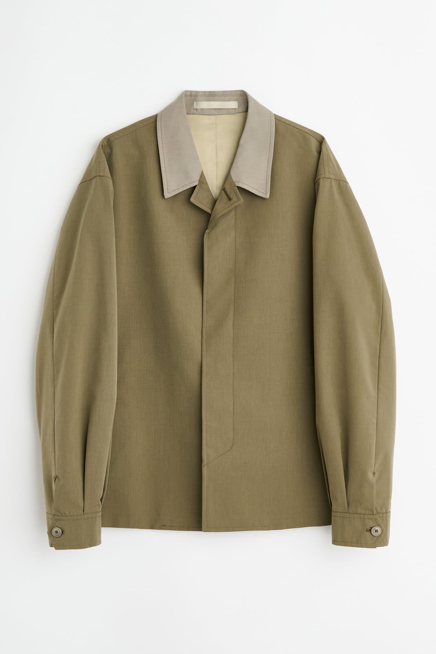 Our Pack Blazer in Dry Leaf Balance Woolcot. Produced in Italian wool and cotton suiting fabric, the style plays into workwear codes with a sharpness influenced by classic tailoring, offering a relaxed fit with a true shoulder line, regular sleeve length, buttoned cuffs, a high break and slanted pockets, plus a clean hidden button placket. Half lined with a floating back lining, the center back split and vent open with movement, letting the slightly contrasting lining glimmer, finished with Corozo buttons, a contrast collar, and a viscose and acetate lining.