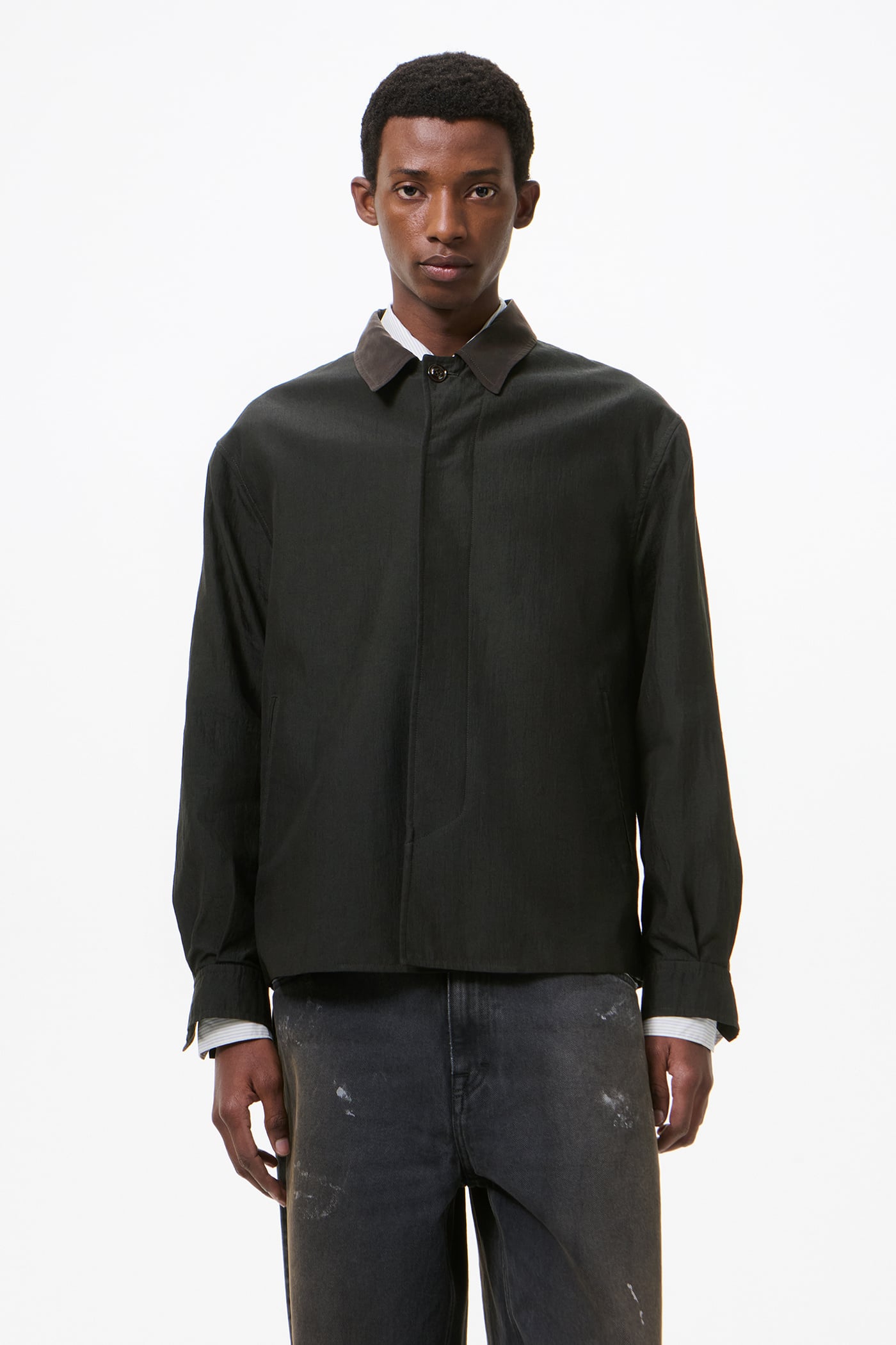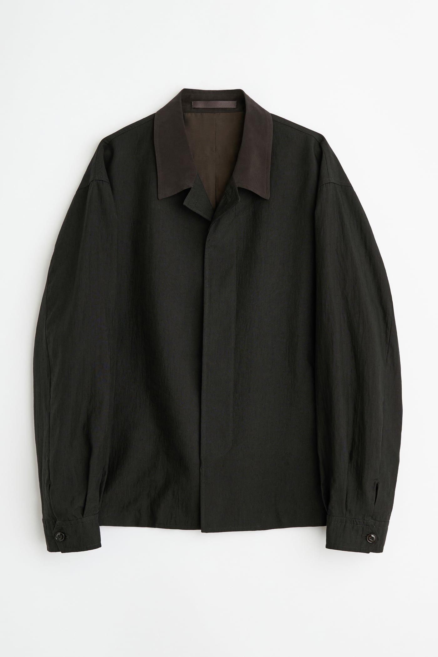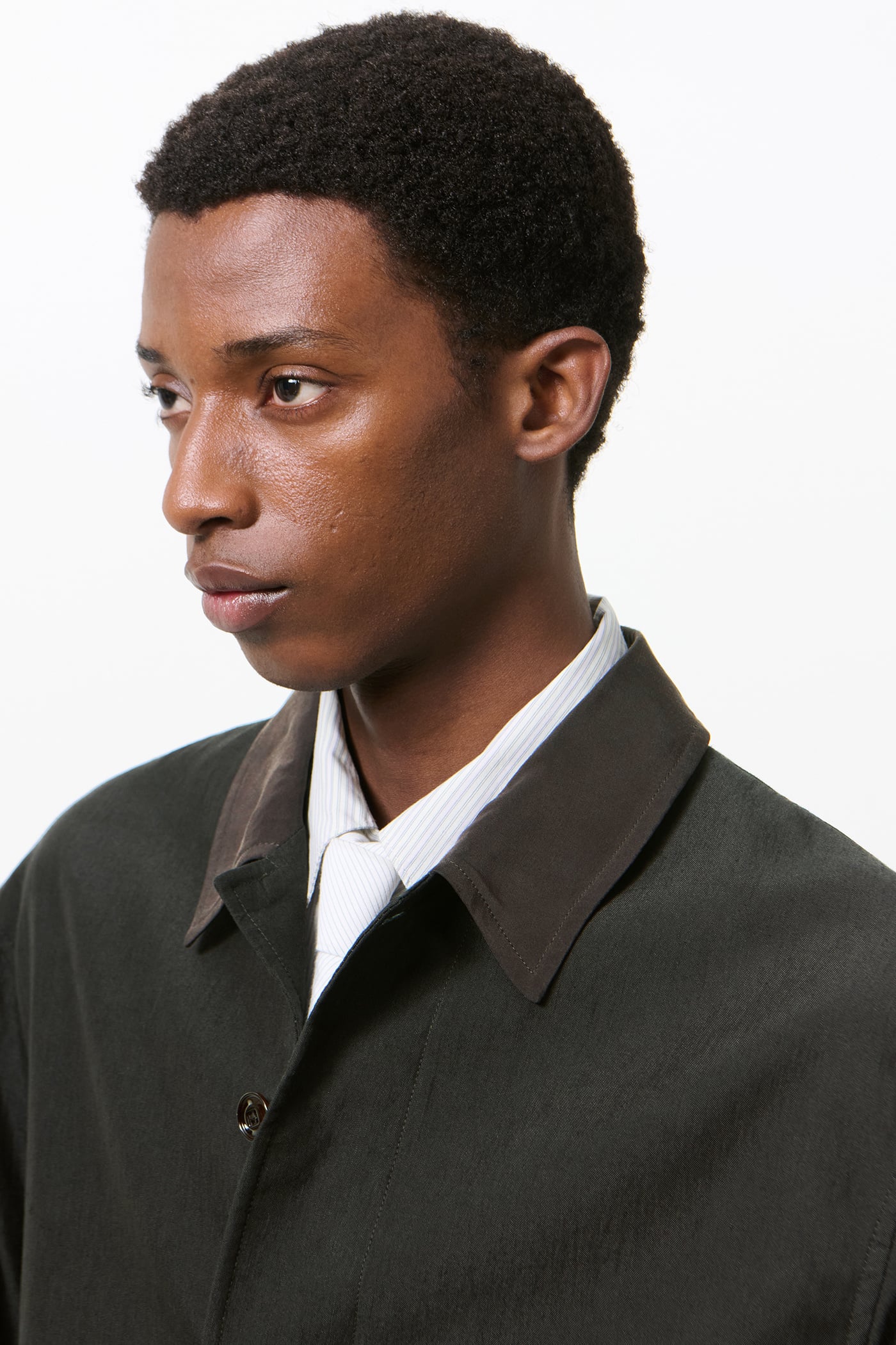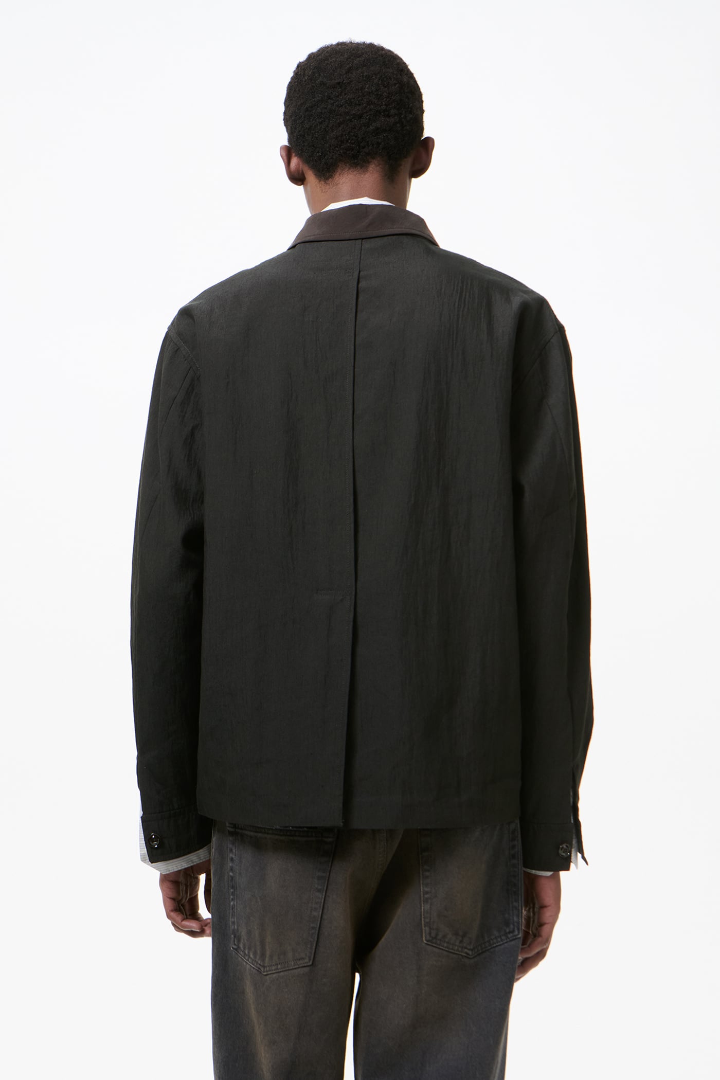 Our Pack Blazer in Soot Black Techflax. Produced in an Italian linen and polyamide blend fabric, piece dyed for a deep soot tone, the style plays into workwear codes with a sharpness influenced by classic tailoring, offering a relaxed fit with a true shoulder line, regular sleeve length, buttoned cuffs, a high break and slanted pockets, plus a clean hidden button placket. Half lined with a floating back lining, the center back split and vent open with movement, letting the slightly contrasting lining glimmer, finished with Corozo buttons, a contrast collar, and a viscose and acetate lining.