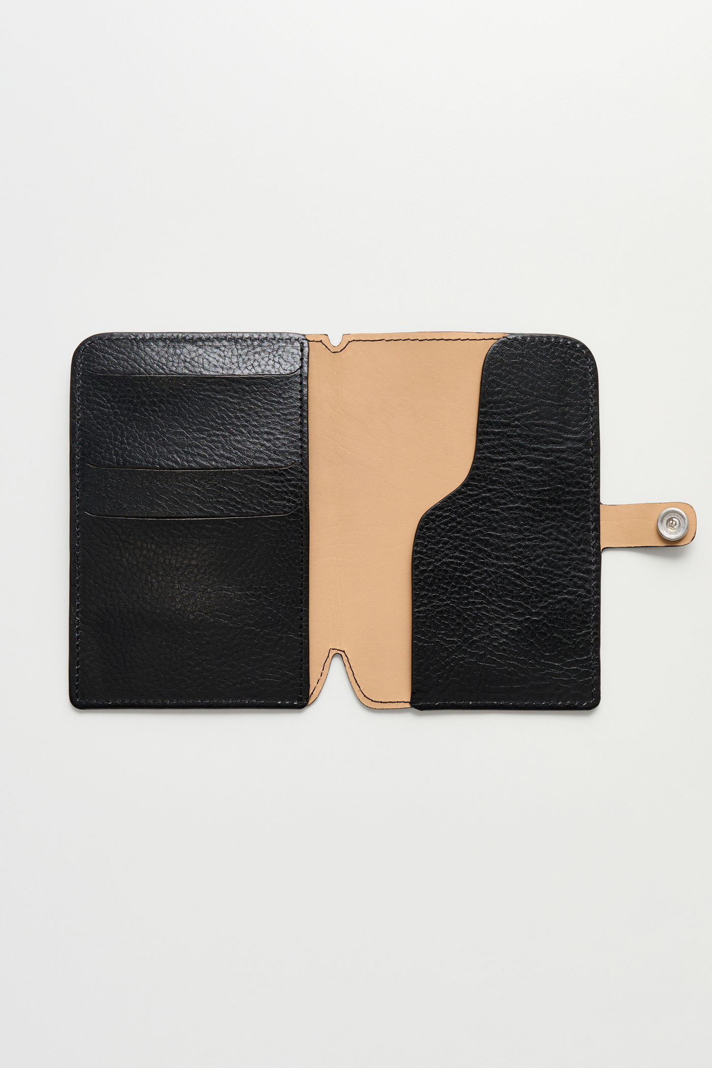 Our Passport Cover in Deep Black Leather. Produced in Italian vegetable-tanned full grain cow leather, the Passport Cover features credit card pockets, a flight ticket pocket and a construction formed by precise folds.