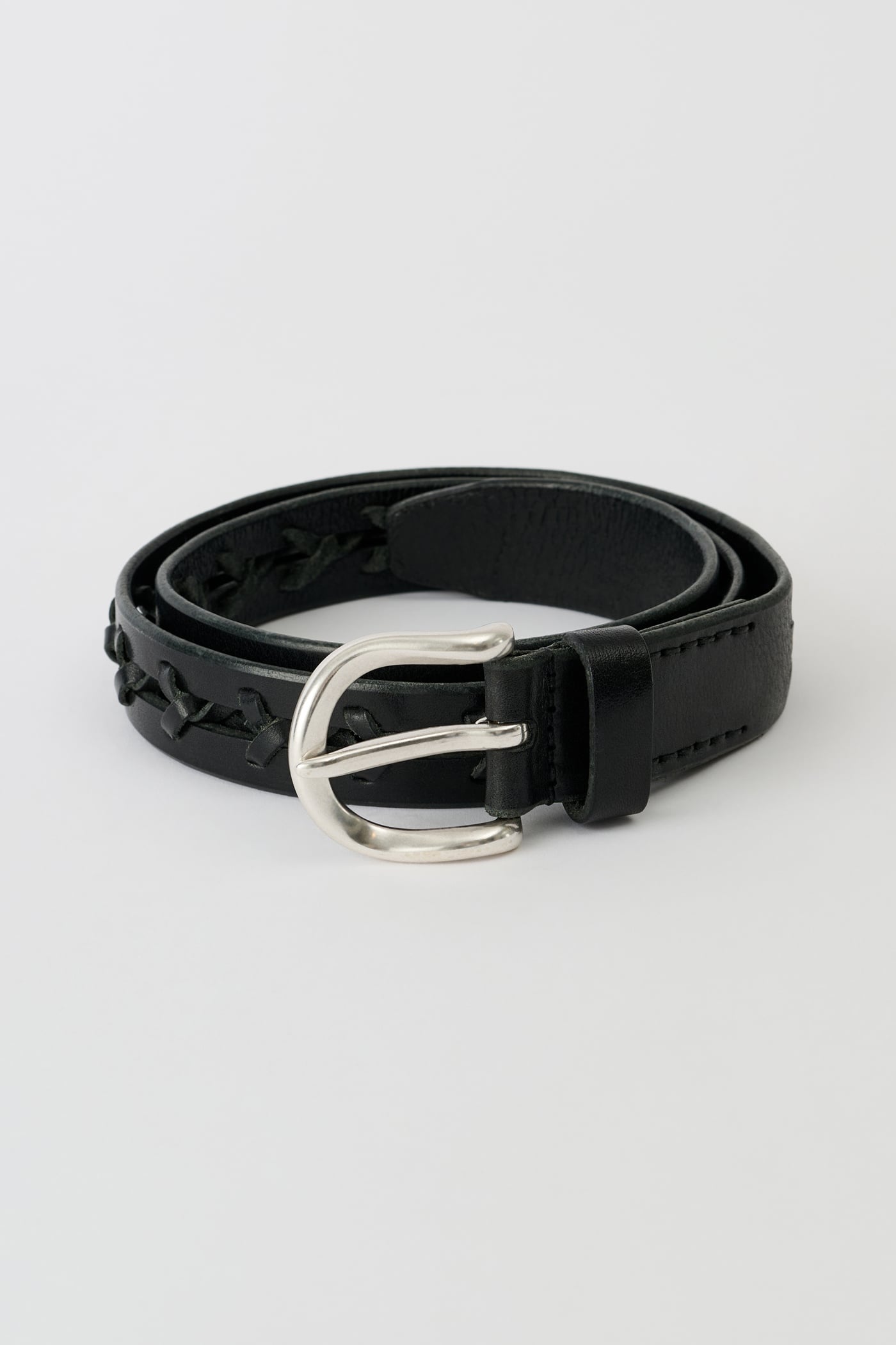 Our Plait Belt in Flecking Black Leather. Produced in an Italian cow leather, the belt features an intricate braid at its center, a metal pin buckle closure, a single keeper, and a metal tip.