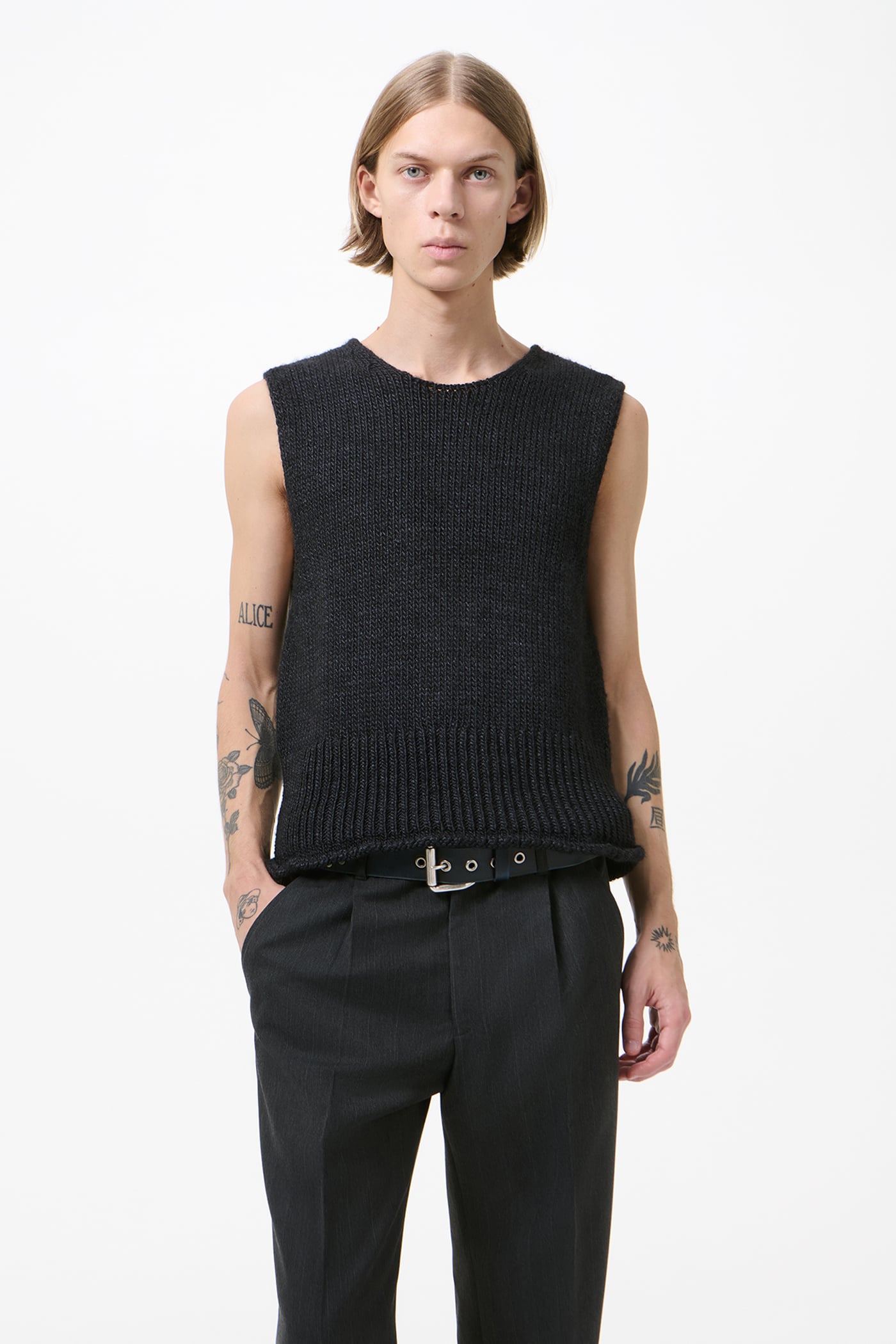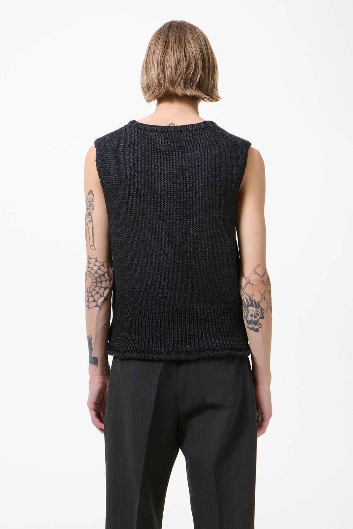 Our Pleaser Tank in Rich Black Rustic Wool Silk. Produced in Italian yarn with plain jersey stitch knit construction, the men's Pleaser Tank has a relaxed, boxy fit and features French shoulders, a rolling hemline and sleeveless design.