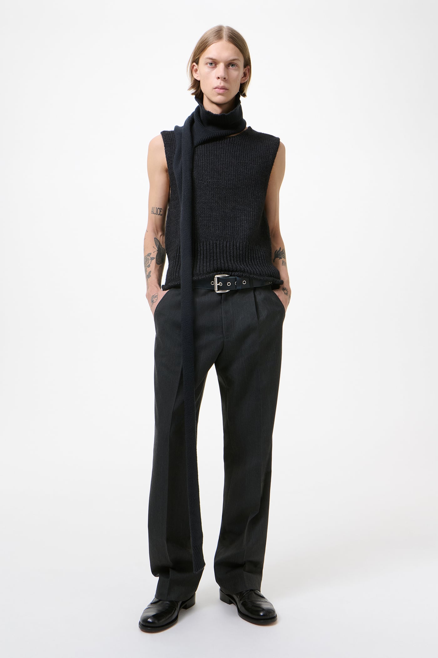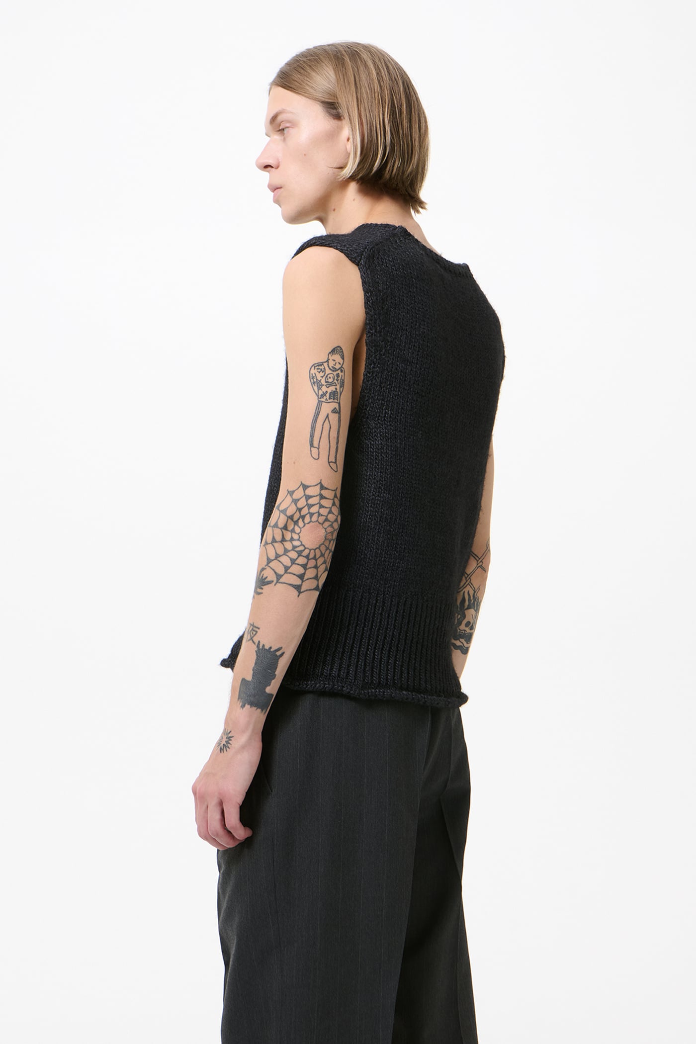 This garment is manufactured using a carefully sourced yarn. The natural characteristics of the yarn, combined with the construction of the knit allows the garment to expand when worn. The garment shall be shaped by its wearer and naturally distress over time to finish the design process.