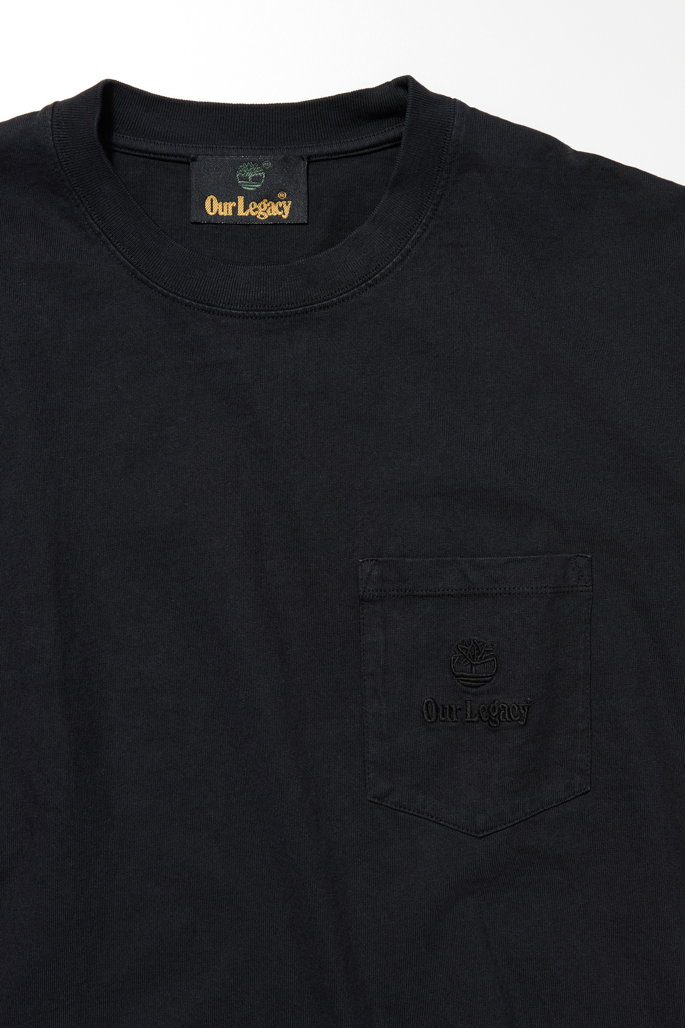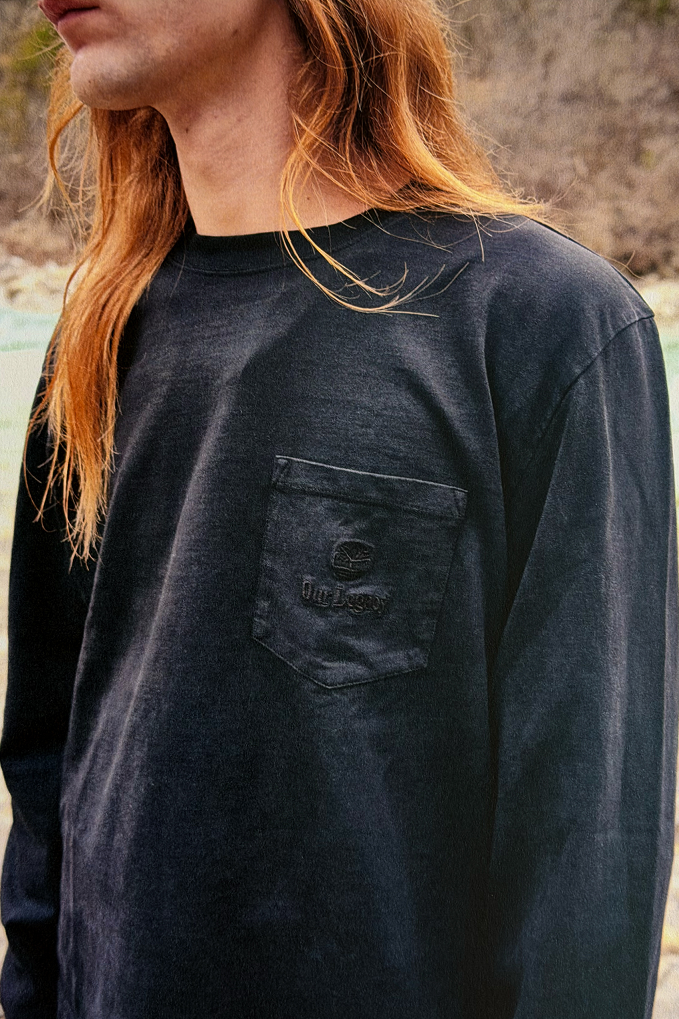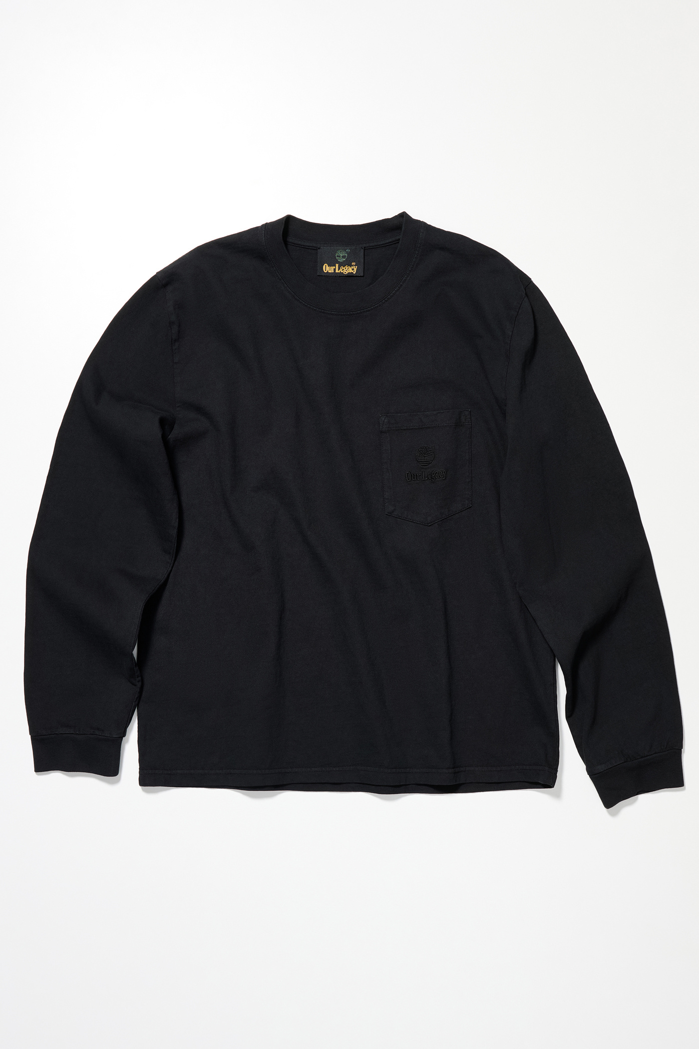 Our Pocket Longsleeve in Washed Black. Produced in Portuguese cotton jersey as part of a WORK SHOP collaboration with Timberland®, the Pocket Longsleeve has a boxy fit and features a ribbed collar and cuffs, a chest pocket with dual branded embroidery, overlocked shoulder seams and a straight, cover stitched hem.