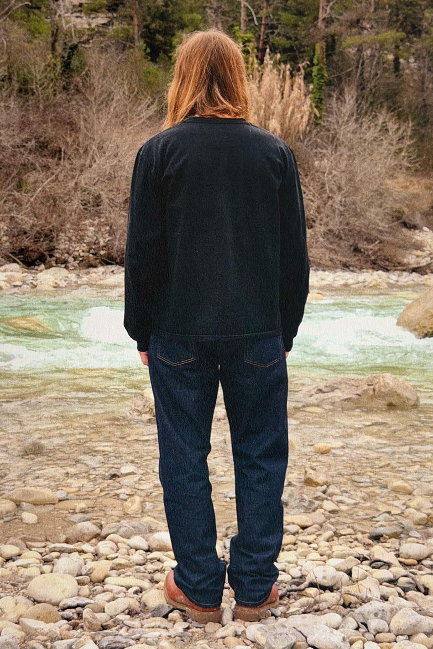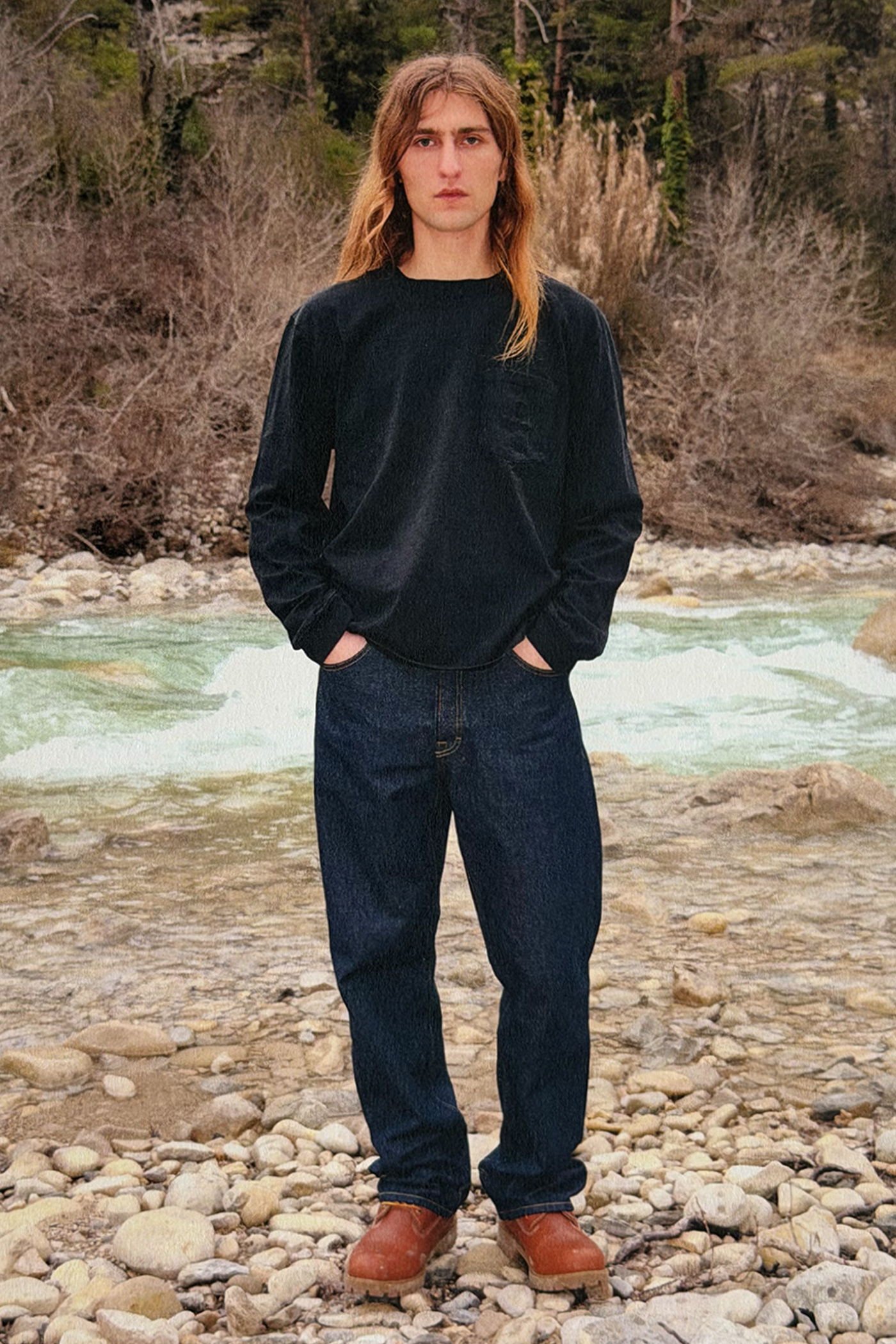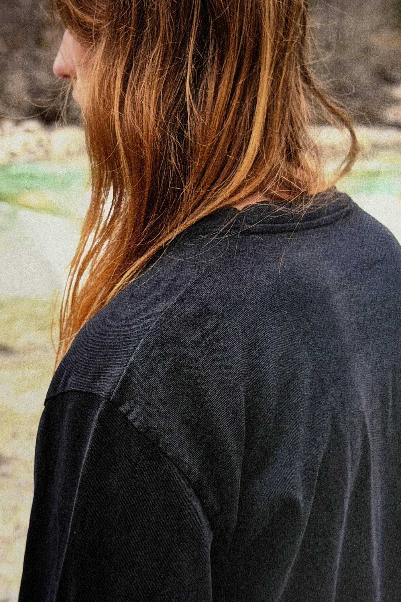 Our Pocket Longsleeve in Washed Black. Produced in Portuguese cotton jersey as part of a WORK SHOP collaboration with Timberland®, the Pocket Longsleeve has a boxy fit and features a ribbed collar and cuffs, a chest pocket with dual branded embroidery, overlocked shoulder seams and a straight, cover stitched hem.