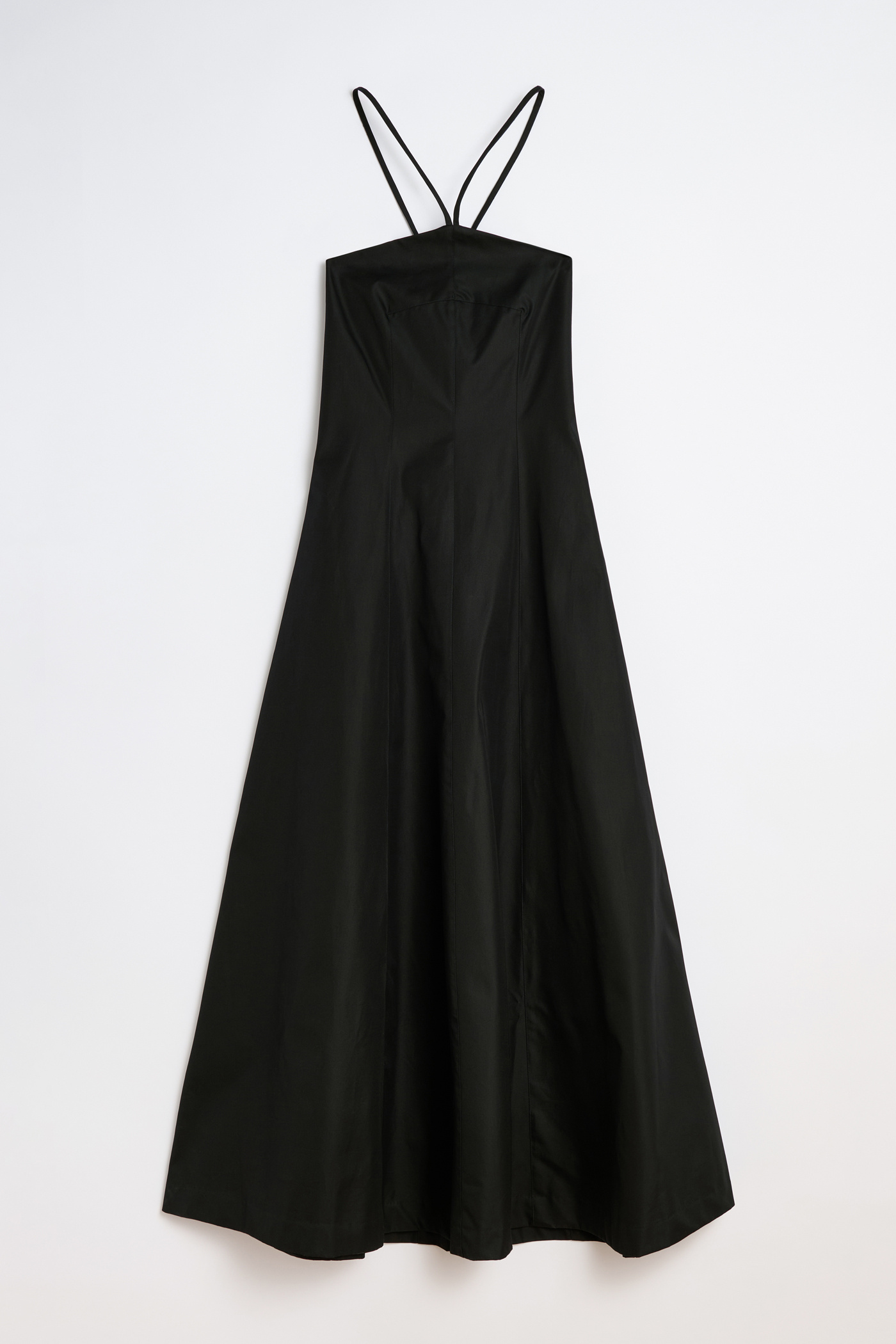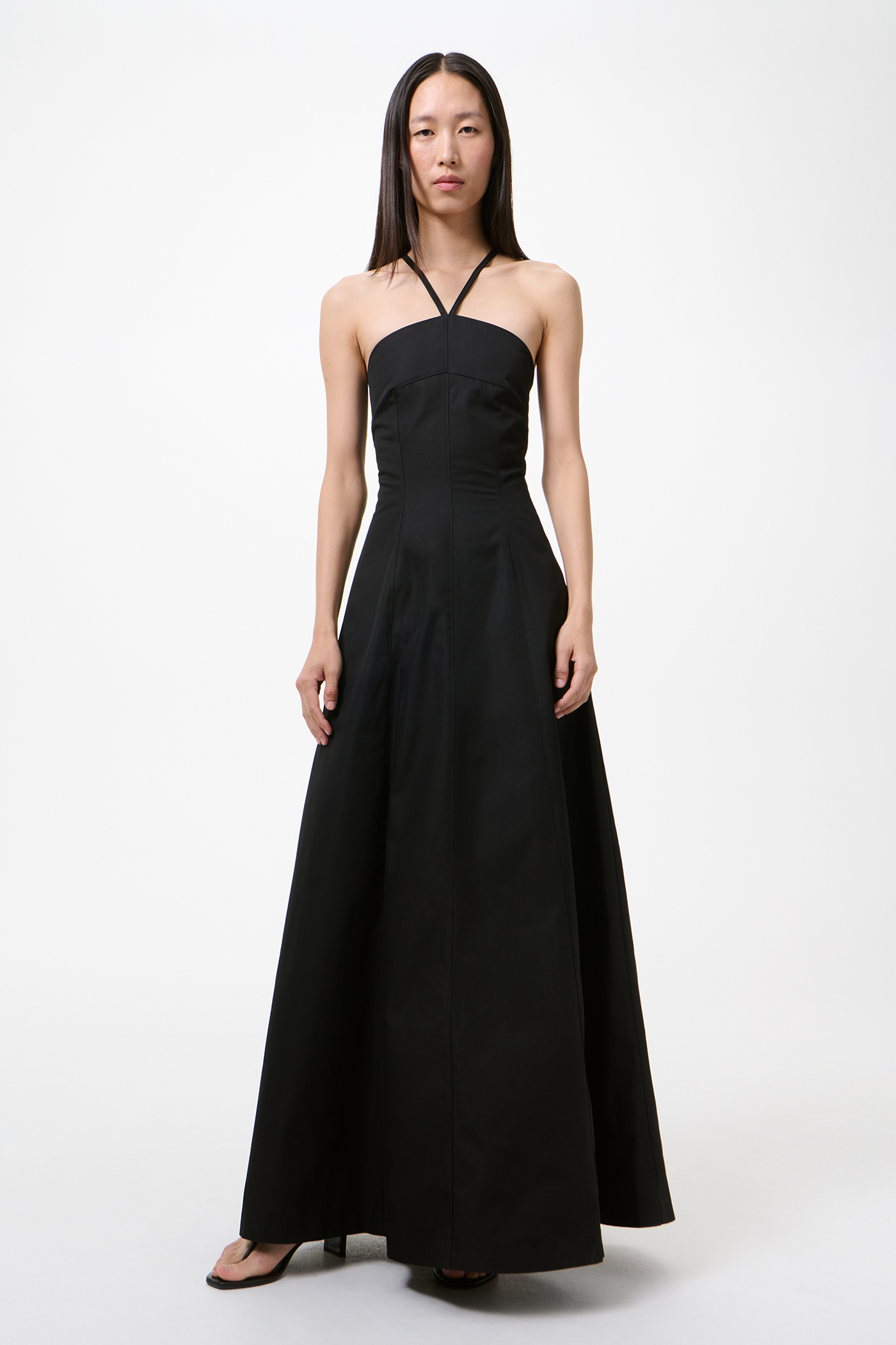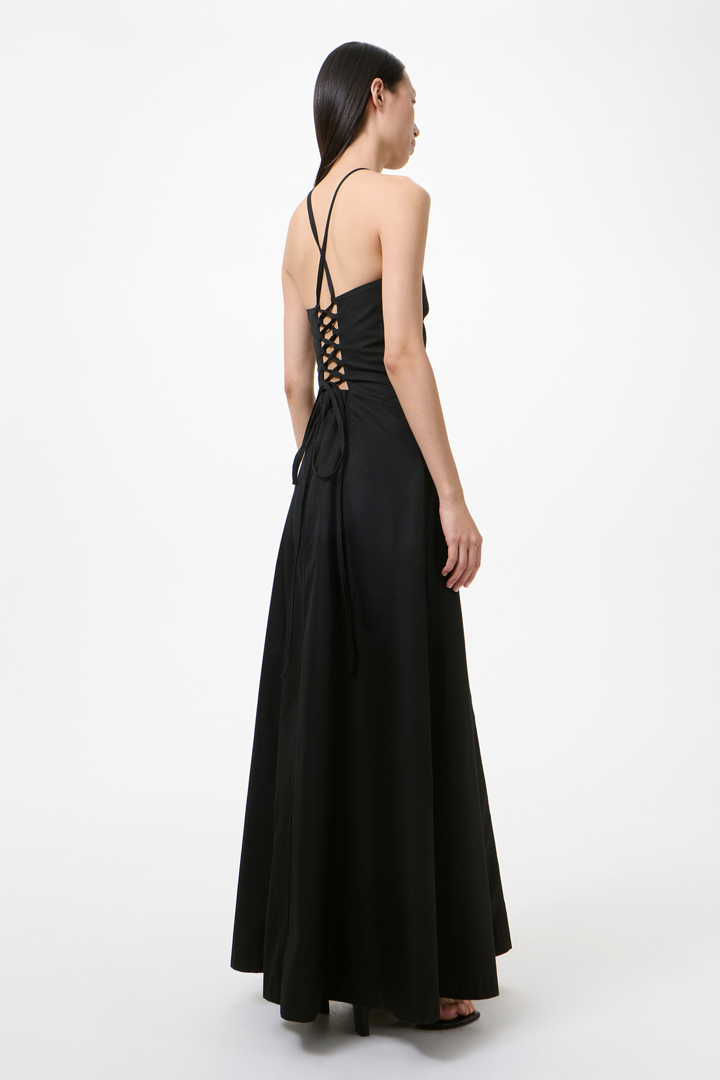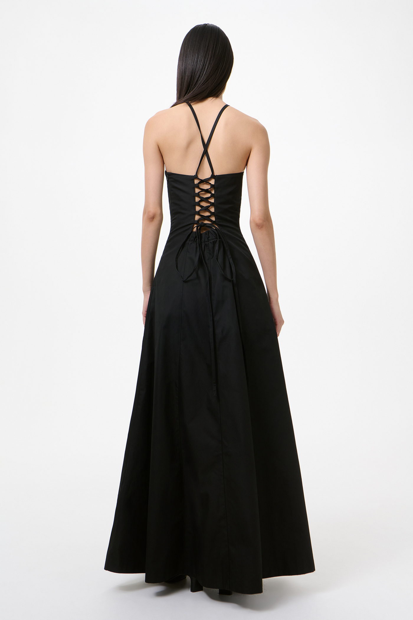 Our Poise Dress in Tasteful Black Megatwist Twill. Produced in Italian cotton fabric, the women's Poise Dress is inspired by vintage ballroom gowns and features a fitted chest and waist with a wide A-line silhouette. The full-length dress includes thin crossover straps at the back, a front panel detail, concealed side zip, and lace corset detail with an elasticated panel for adjustability.