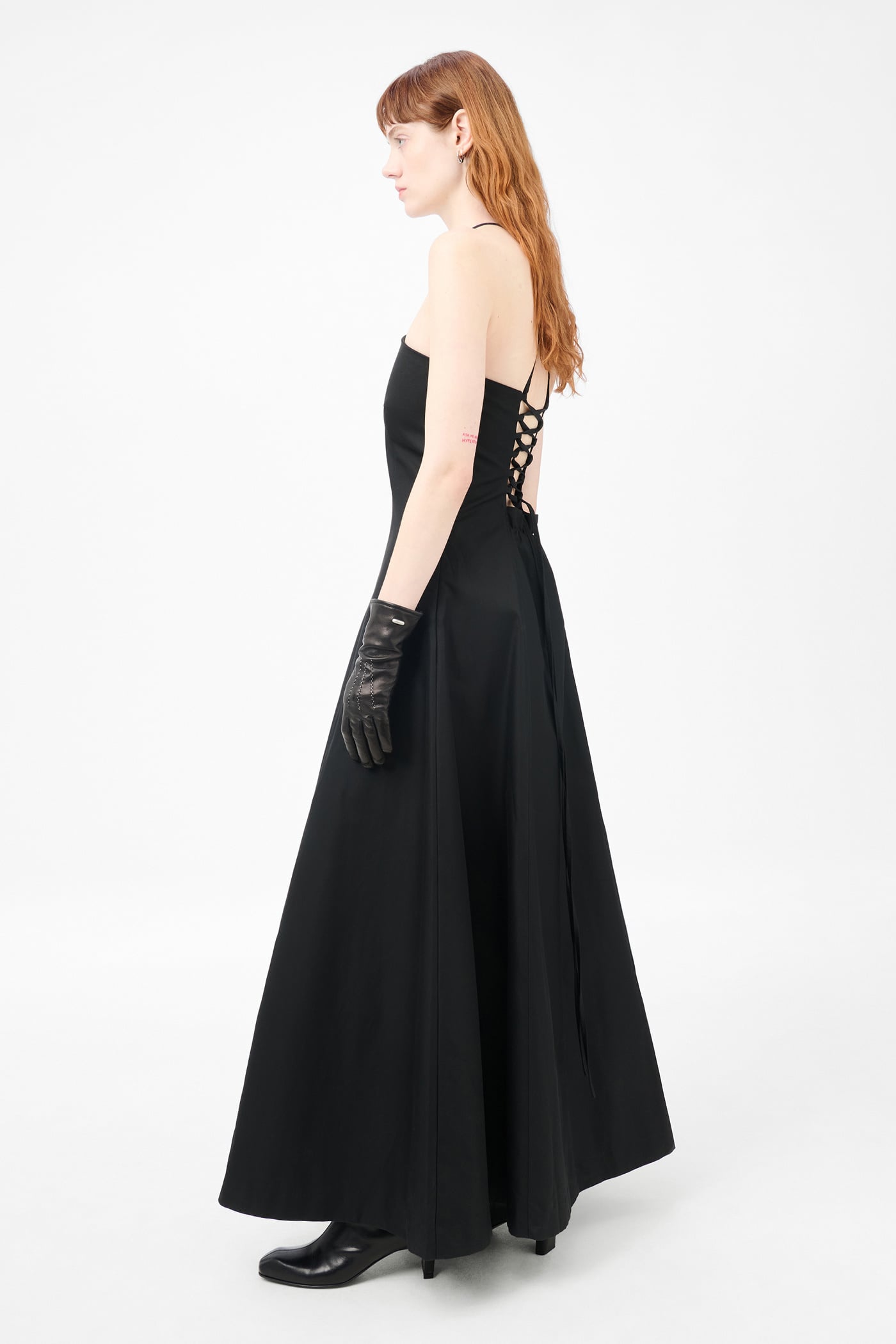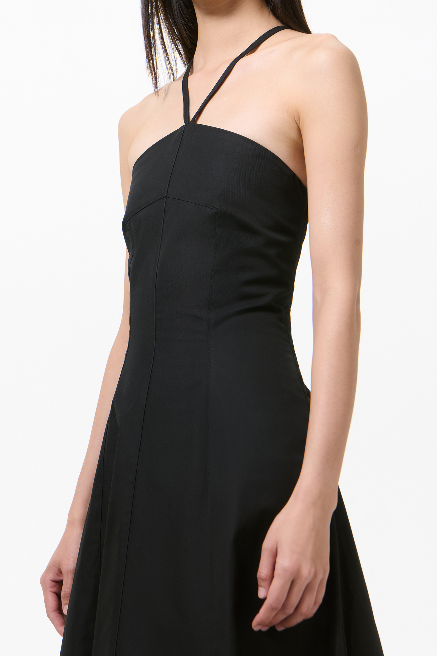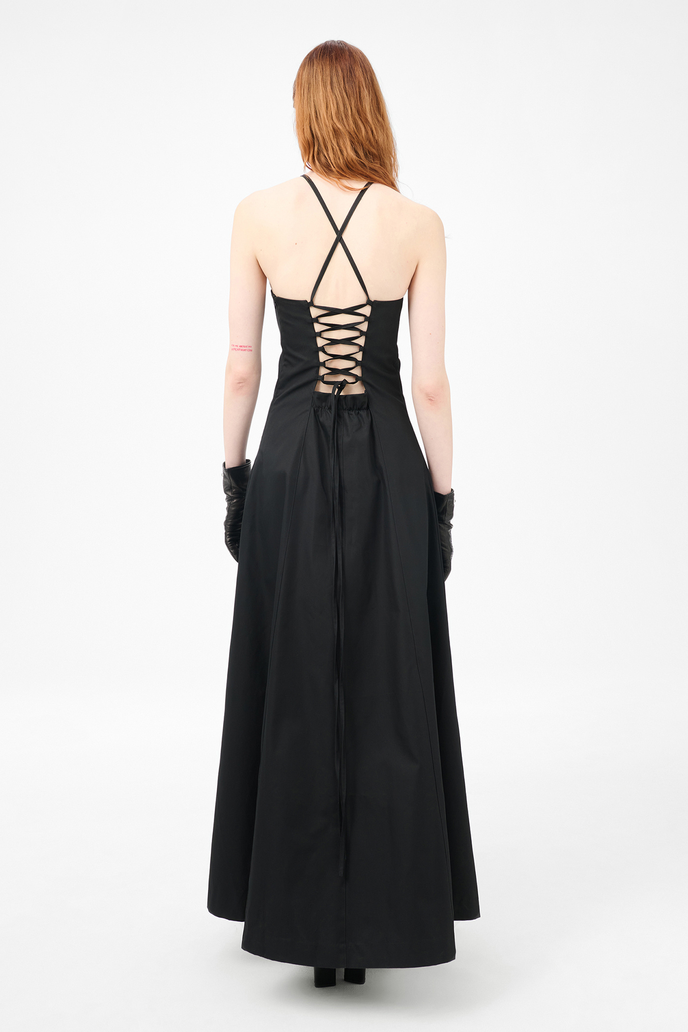 Our Poise Dress in Tasteful Black Megatwist Twill. Produced in Italian cotton fabric, the women's Poise Dress is inspired by vintage ballroom gowns and features a fitted chest and waist with a wide A-line silhouette. The full-length dress includes thin crossover straps at the back, a front panel detail, concealed side zip, and lace corset detail with an elasticated panel for adjustability.
