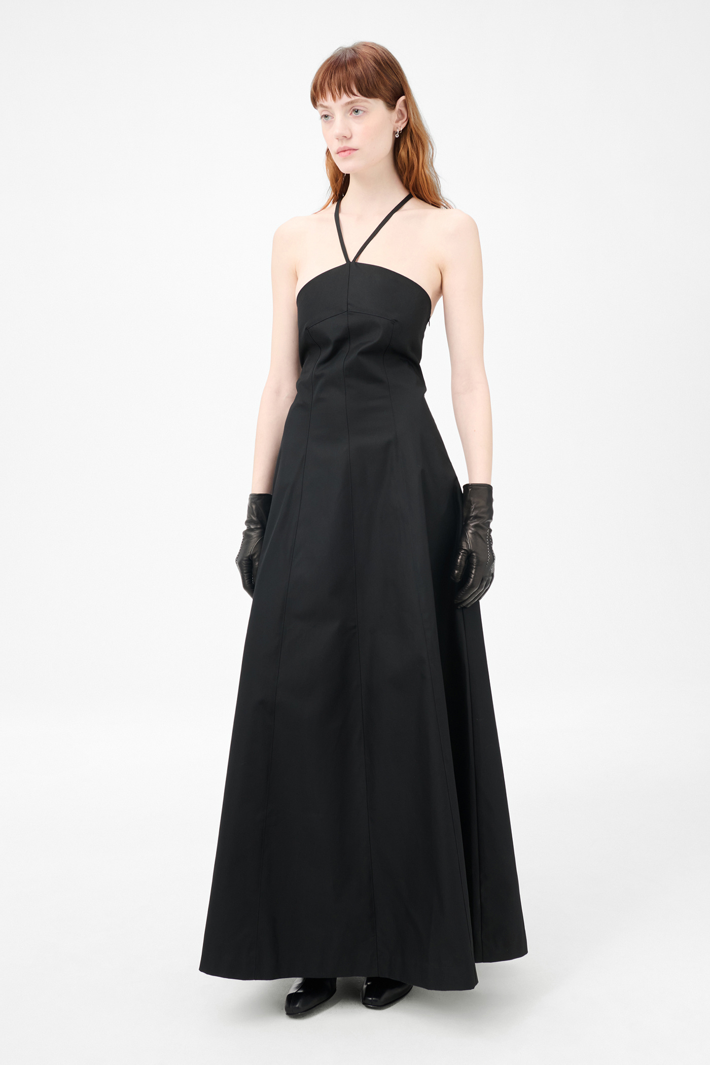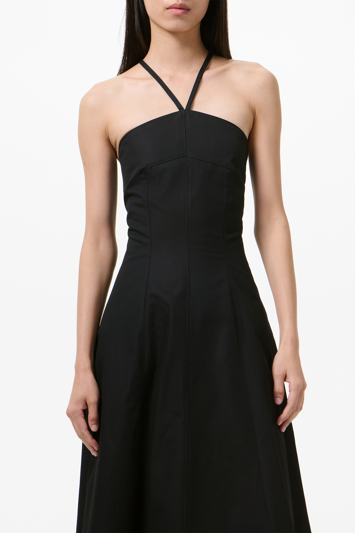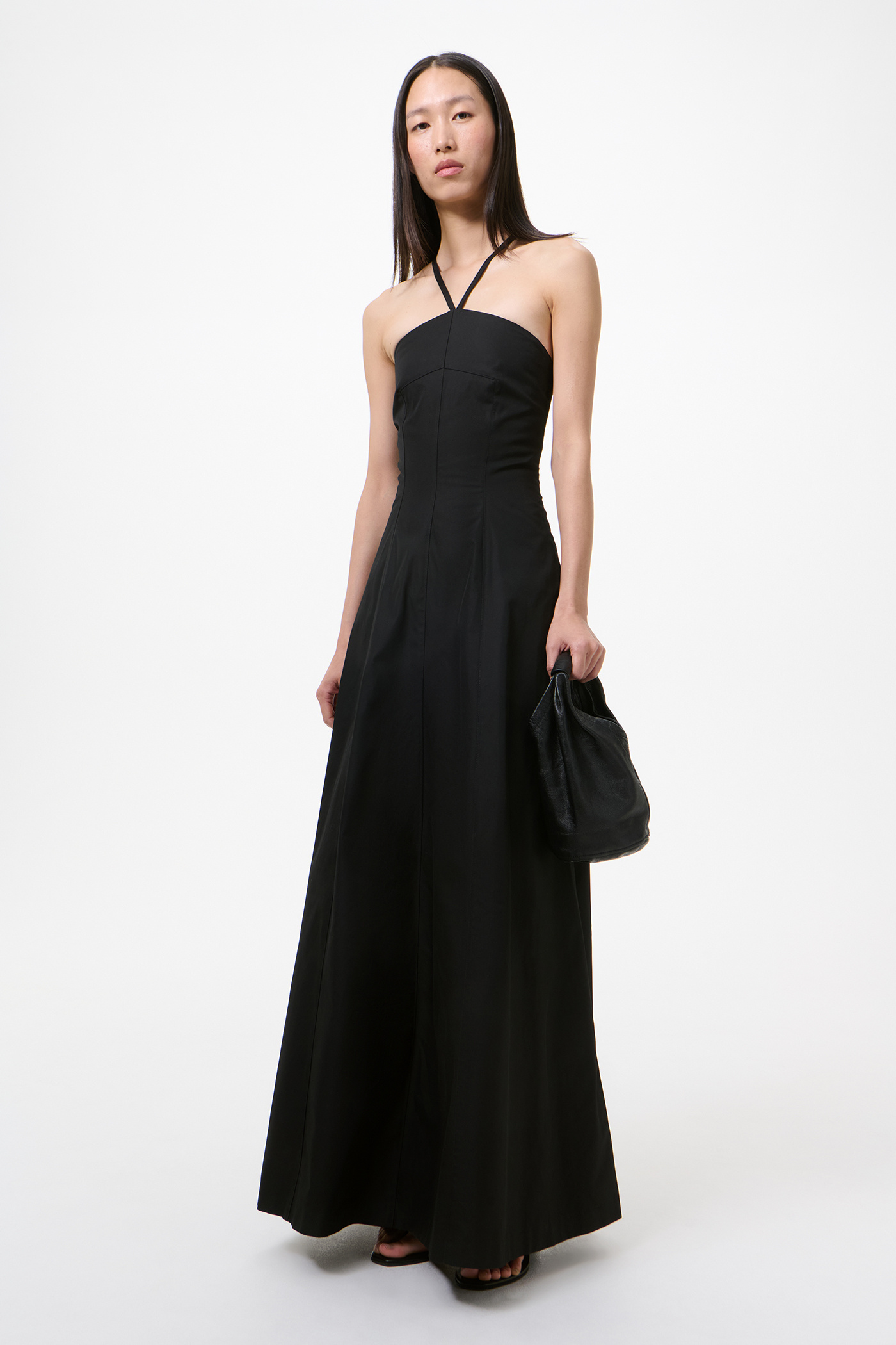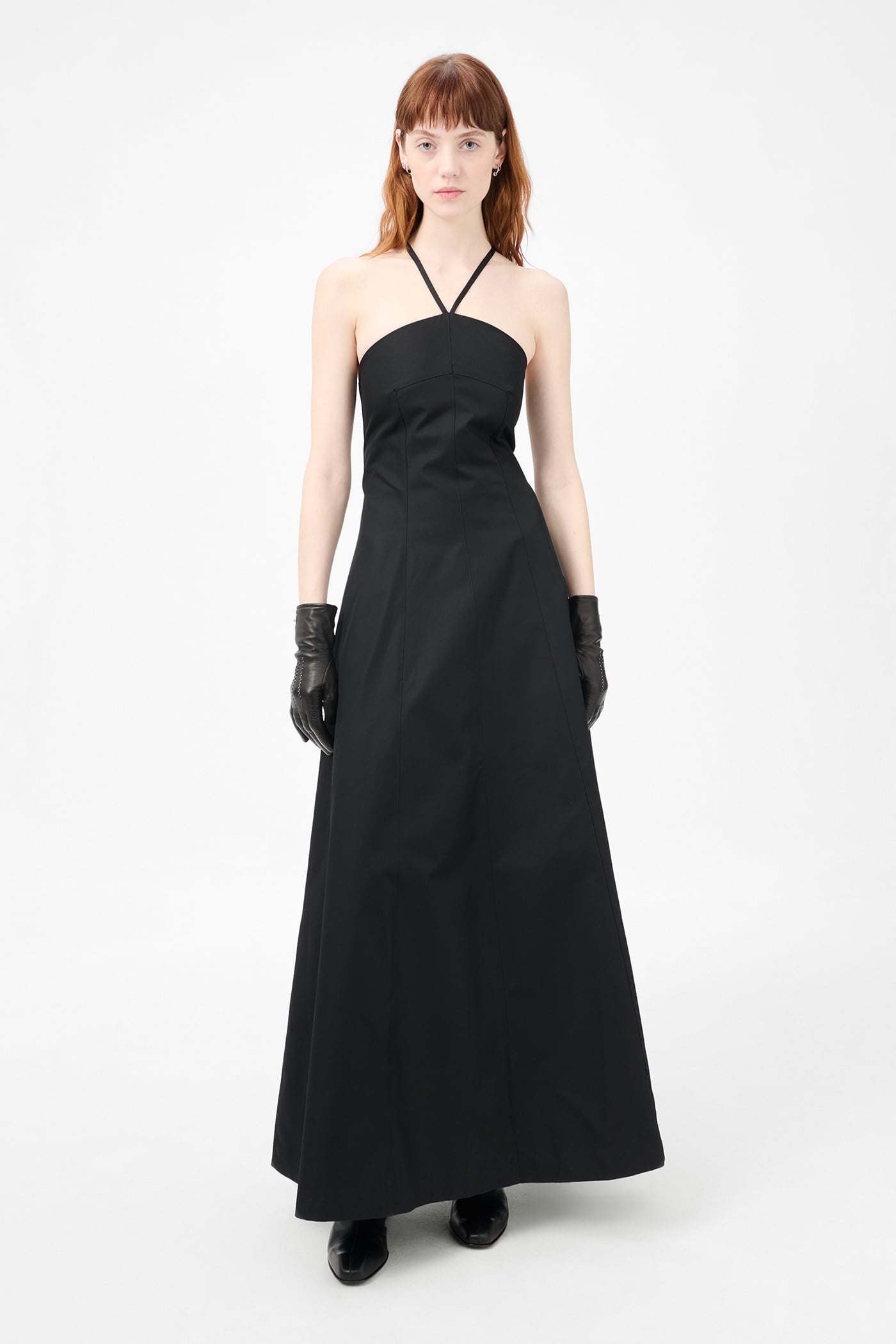 Our Poise Dress in Tasteful Black Megatwist Twill. Produced in Italian cotton fabric, the women's Poise Dress is inspired by vintage ballroom gowns and features a fitted chest and waist with a wide A-line silhouette. The full-length dress includes thin crossover straps at the back, a front panel detail, concealed side zip, and lace corset detail with an elasticated panel for adjustability.