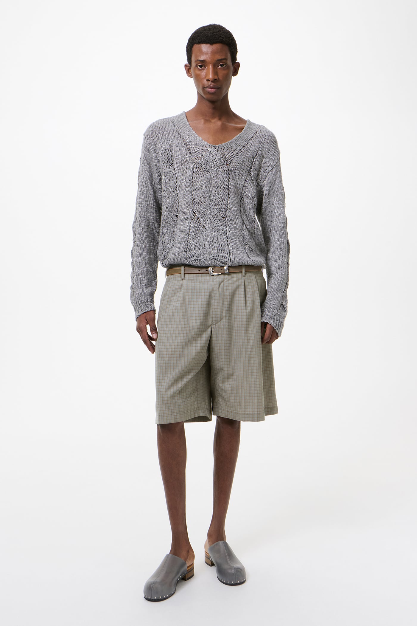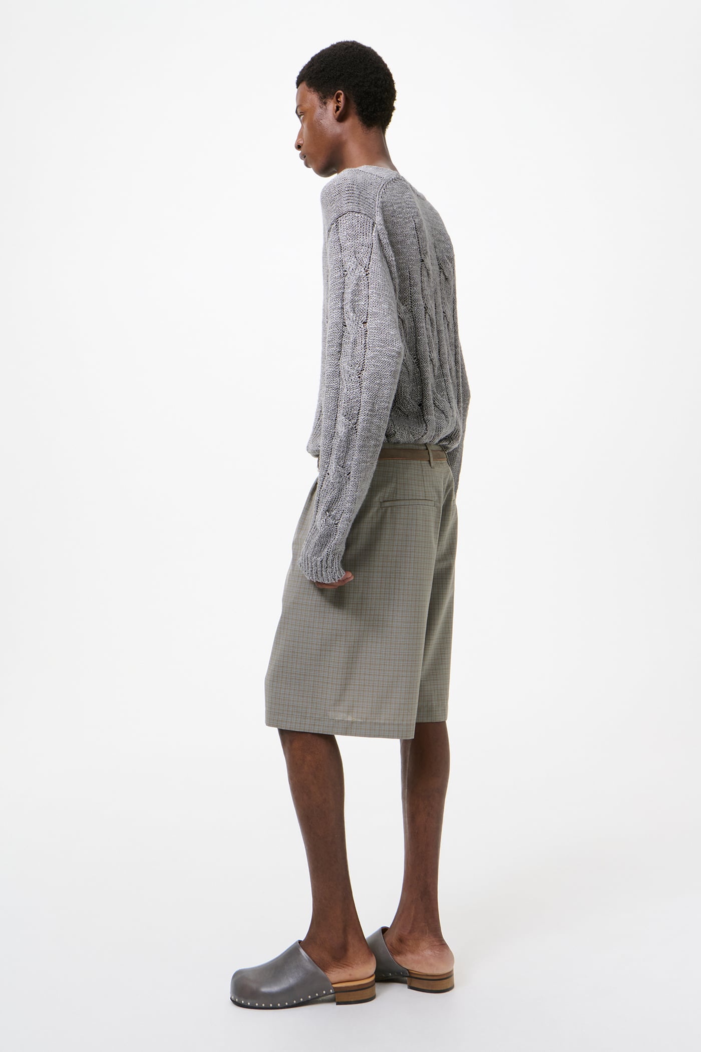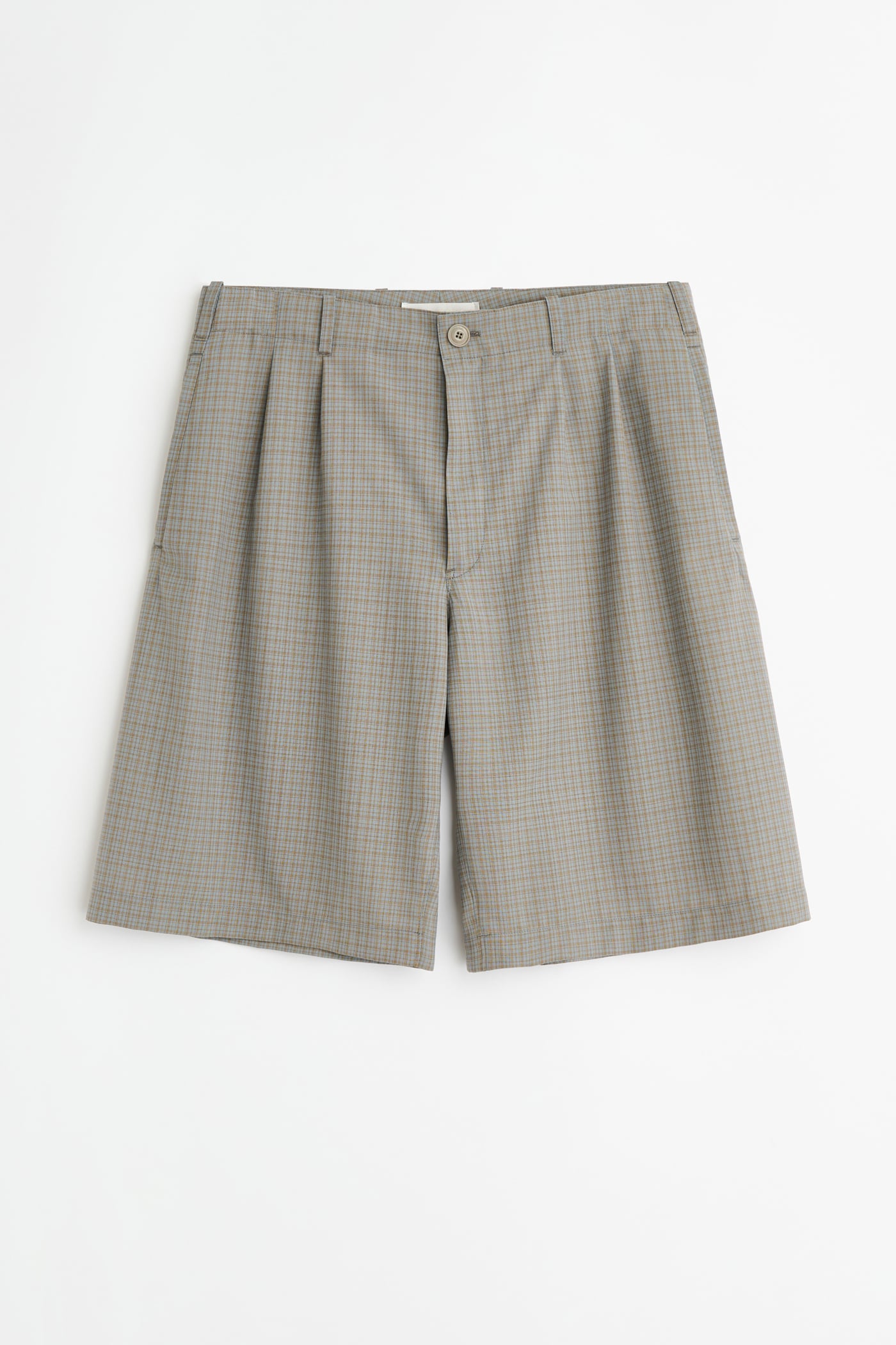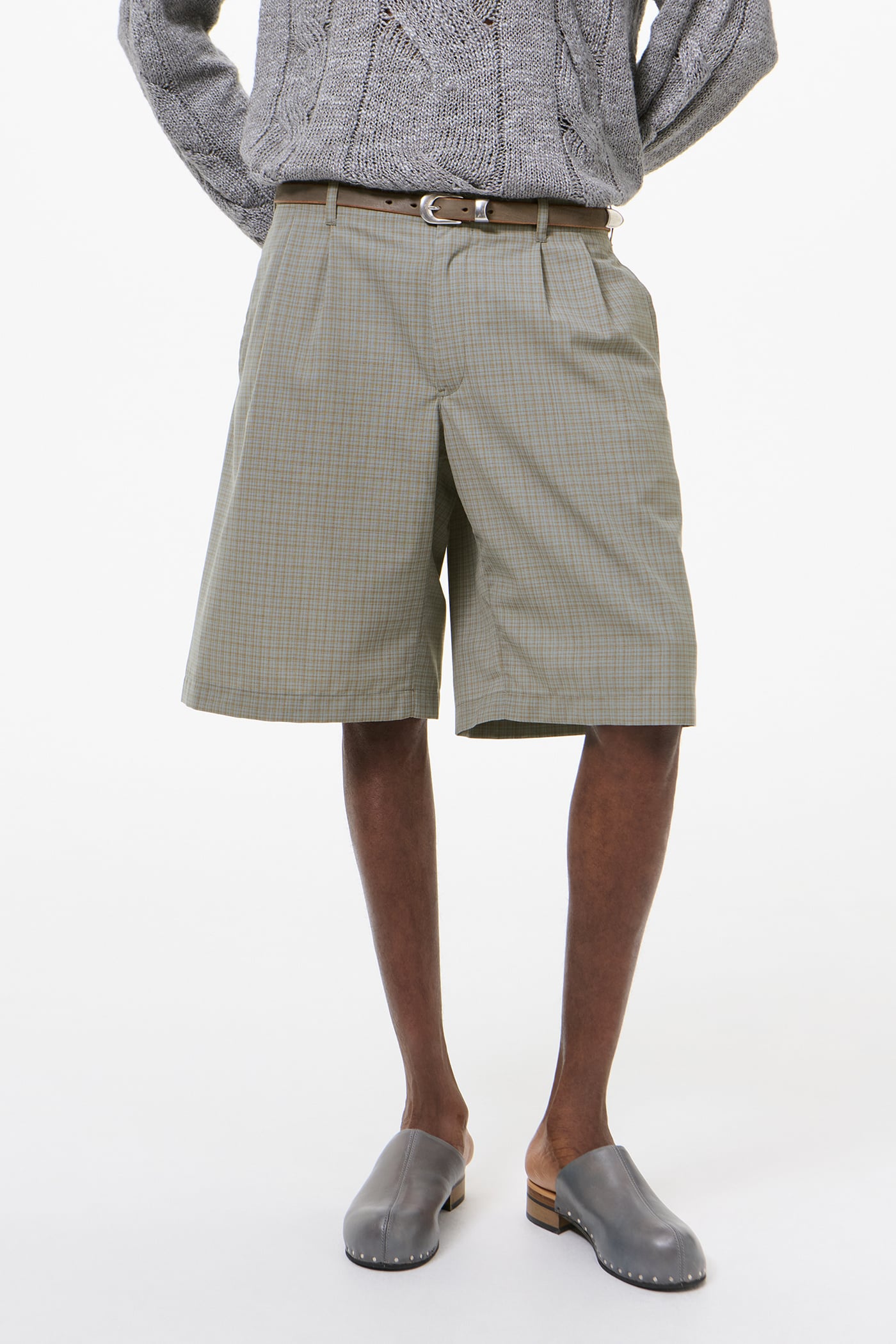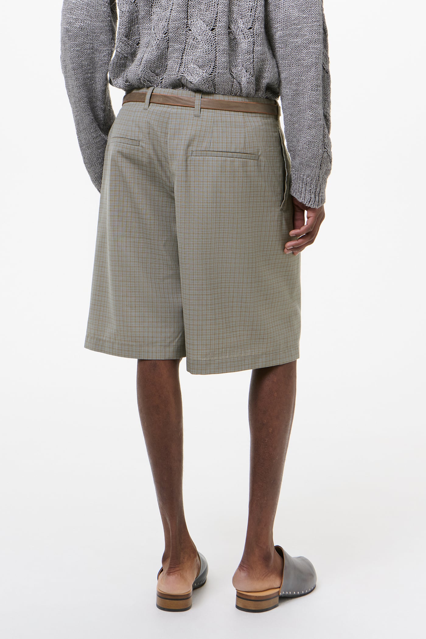 Our Ponte Shorts in Frosted Moss Check Nexwool. Produced in a Portuguese polyester and wool blend with a dense fine weave, the men's Ponte Shorts have a relaxed fit and feature a YKK zip fly, front welt pockets, corozo buttons, darts for shape, and welt back pockets.