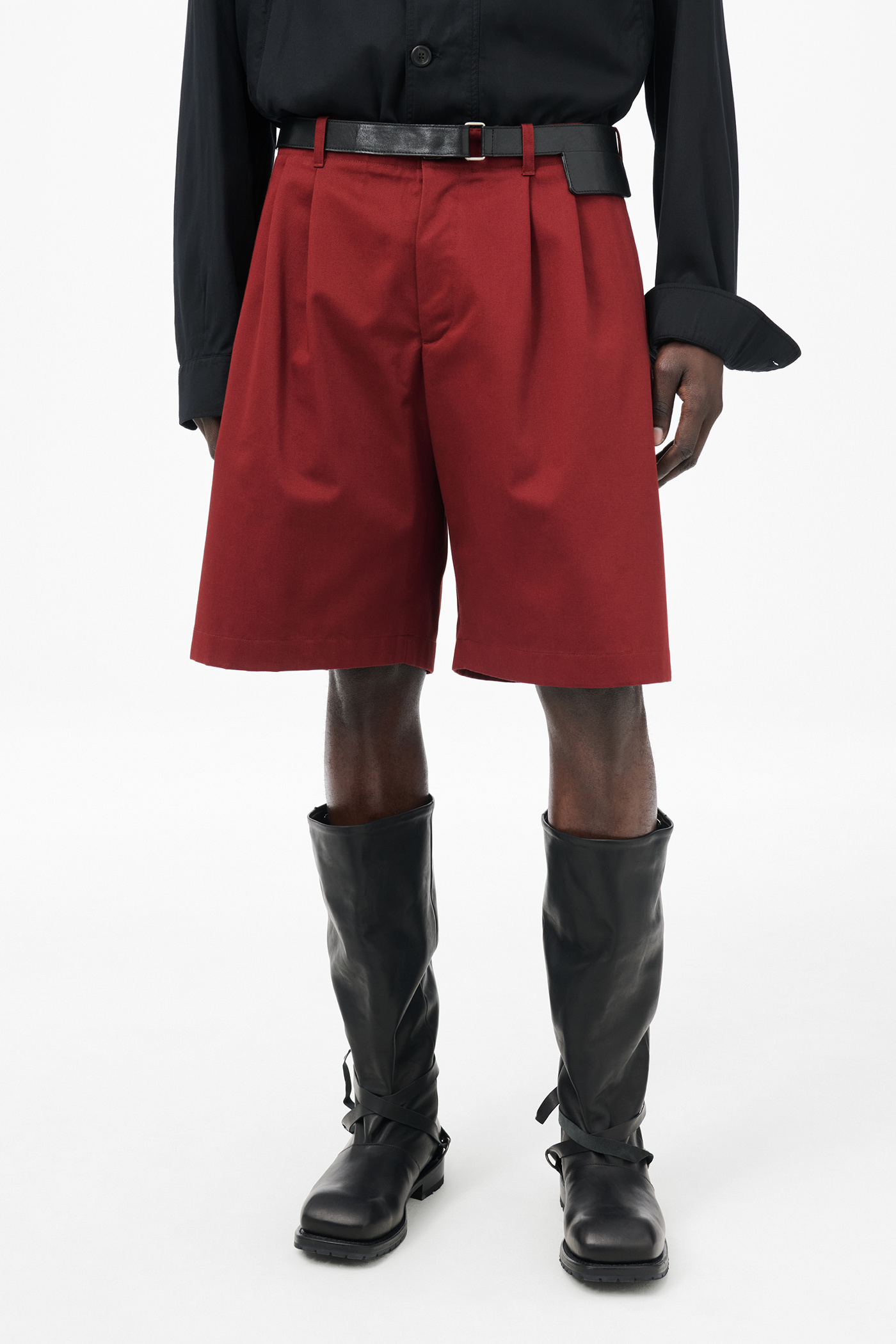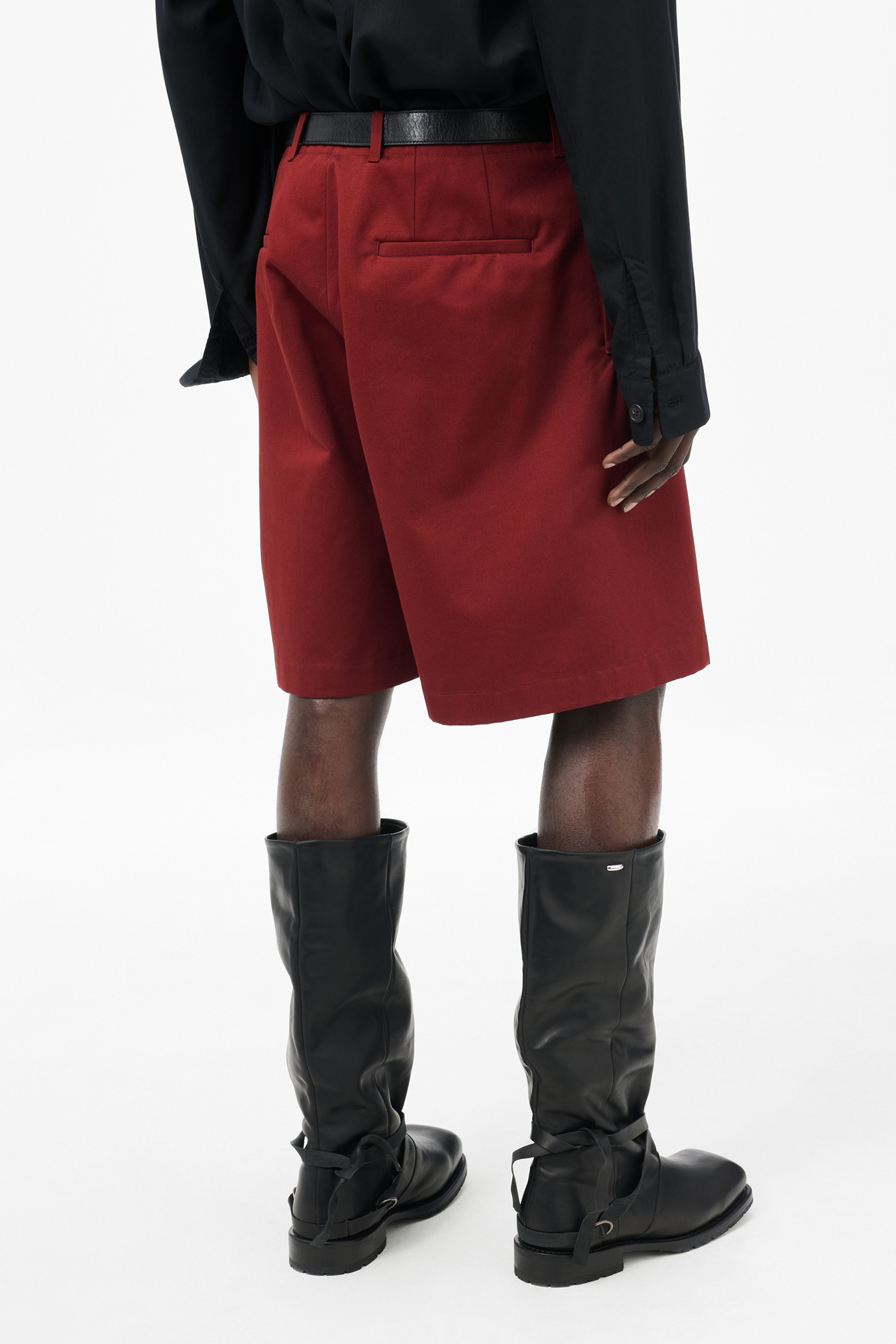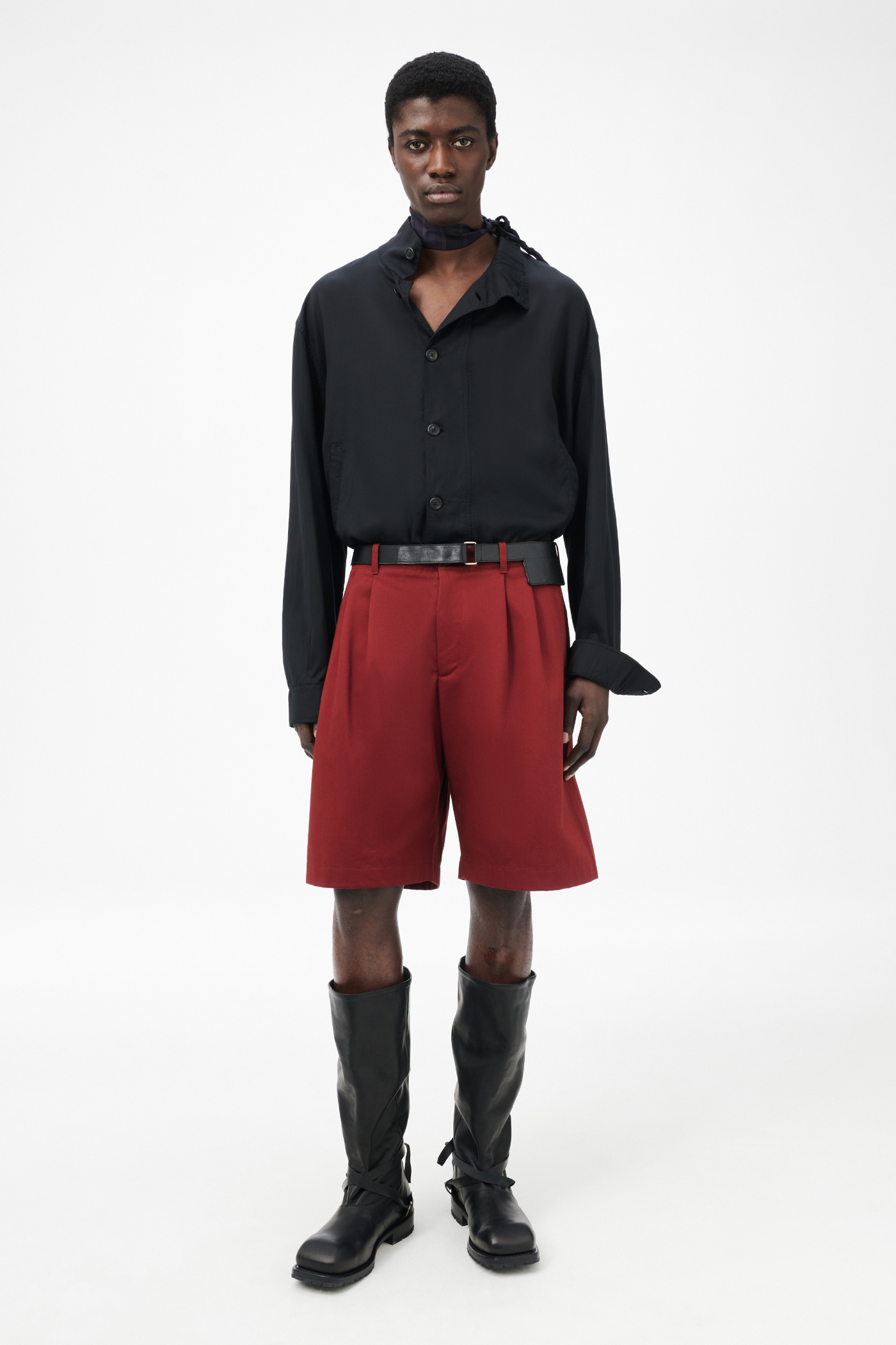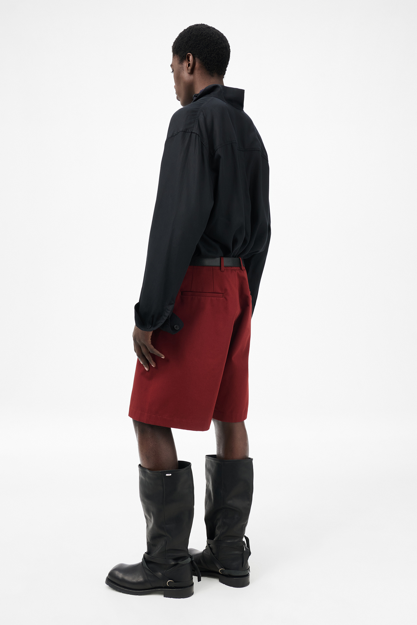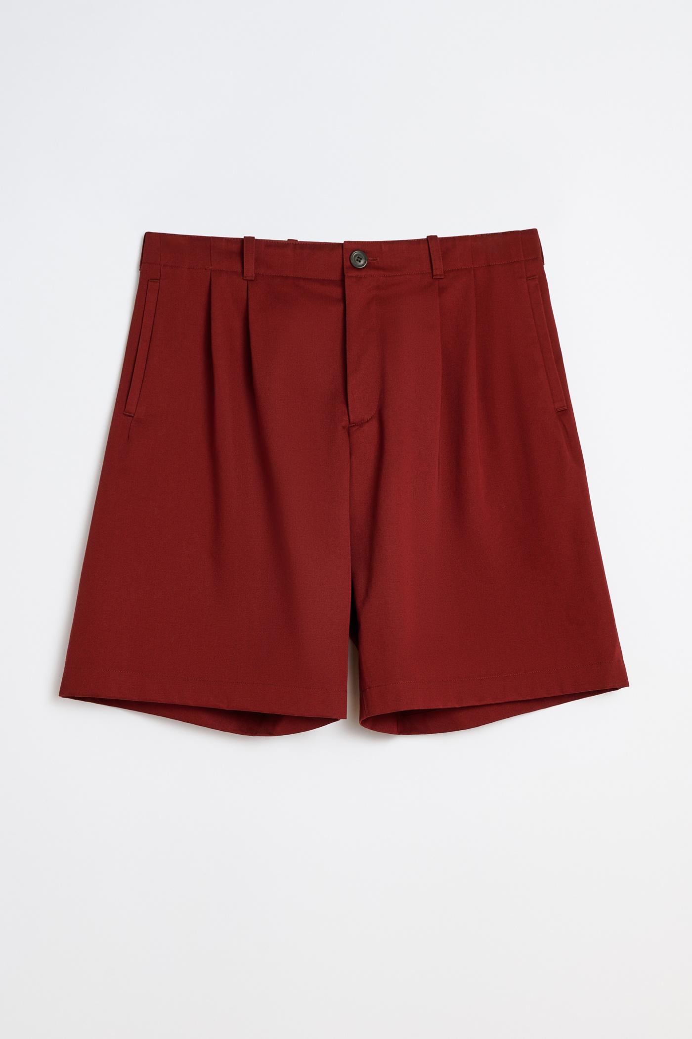 Our Ponte Shorts in Profound Red Megatwist Twill. Produced in Italian cotton twill fabric with a subtle sheen finish, the men's Ponte Shorts have a relaxed, wide fit with double pleats into the waist and no side seam, creating a generous silhouette that finishes at the knee. Features include a YKK zip fly, front welt pockets, horn buttons, darted construction for shape, and welt back pockets.
