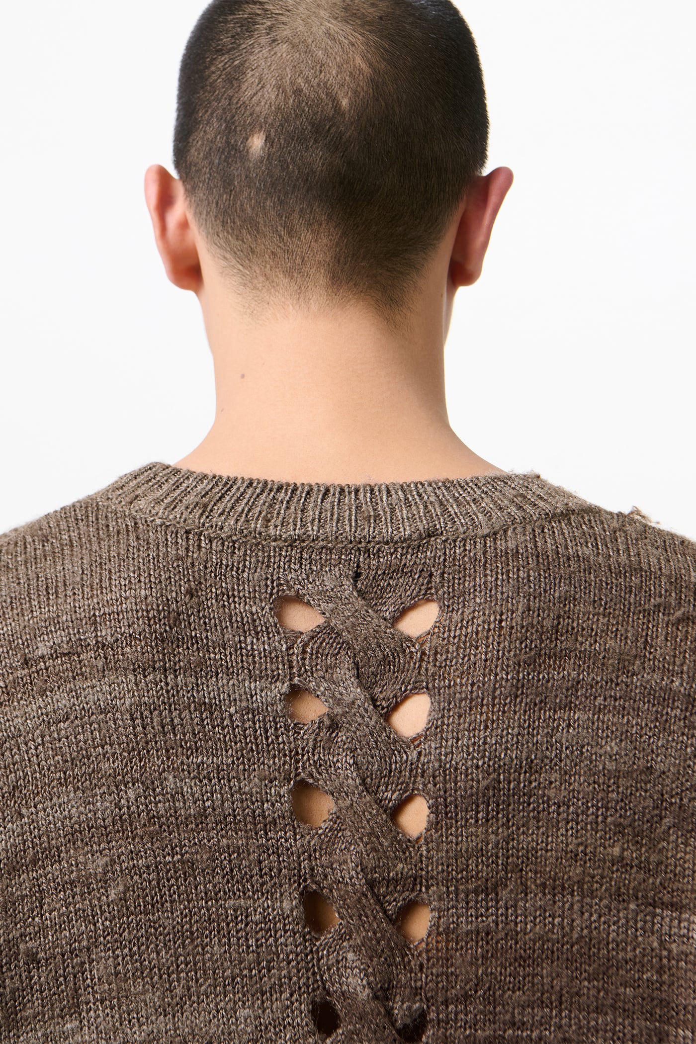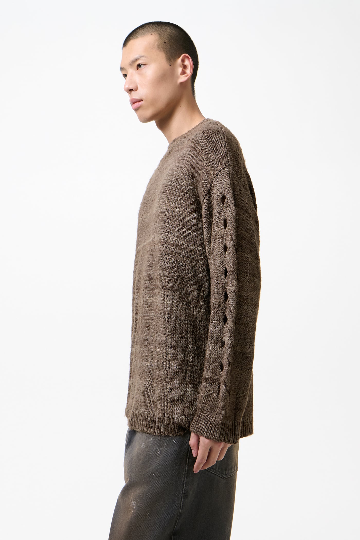 Our Popover Roundneck in Wathered Earth Handspun Silk. Produced in Italian handspun silk yarn, the hand spinning imparts an irregular color and twist, creating a neppy, lightly pilled surface. this knit has a relaxed fit with dropped shoulders and features a ribbed collar, fine rib cuffs and hem. A loose cable design runs down each sleeve and along the centre back, subtly mimicking a spine.