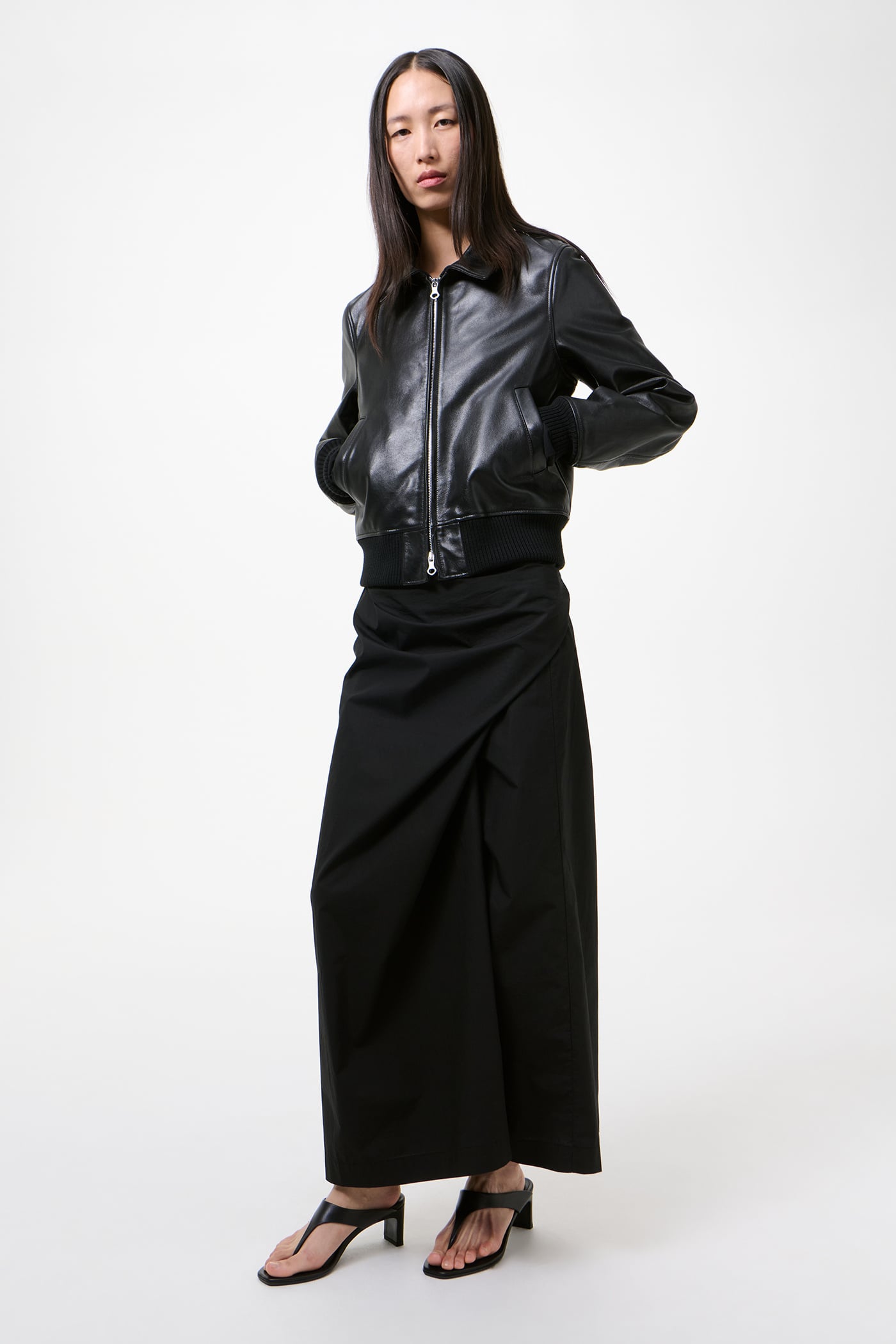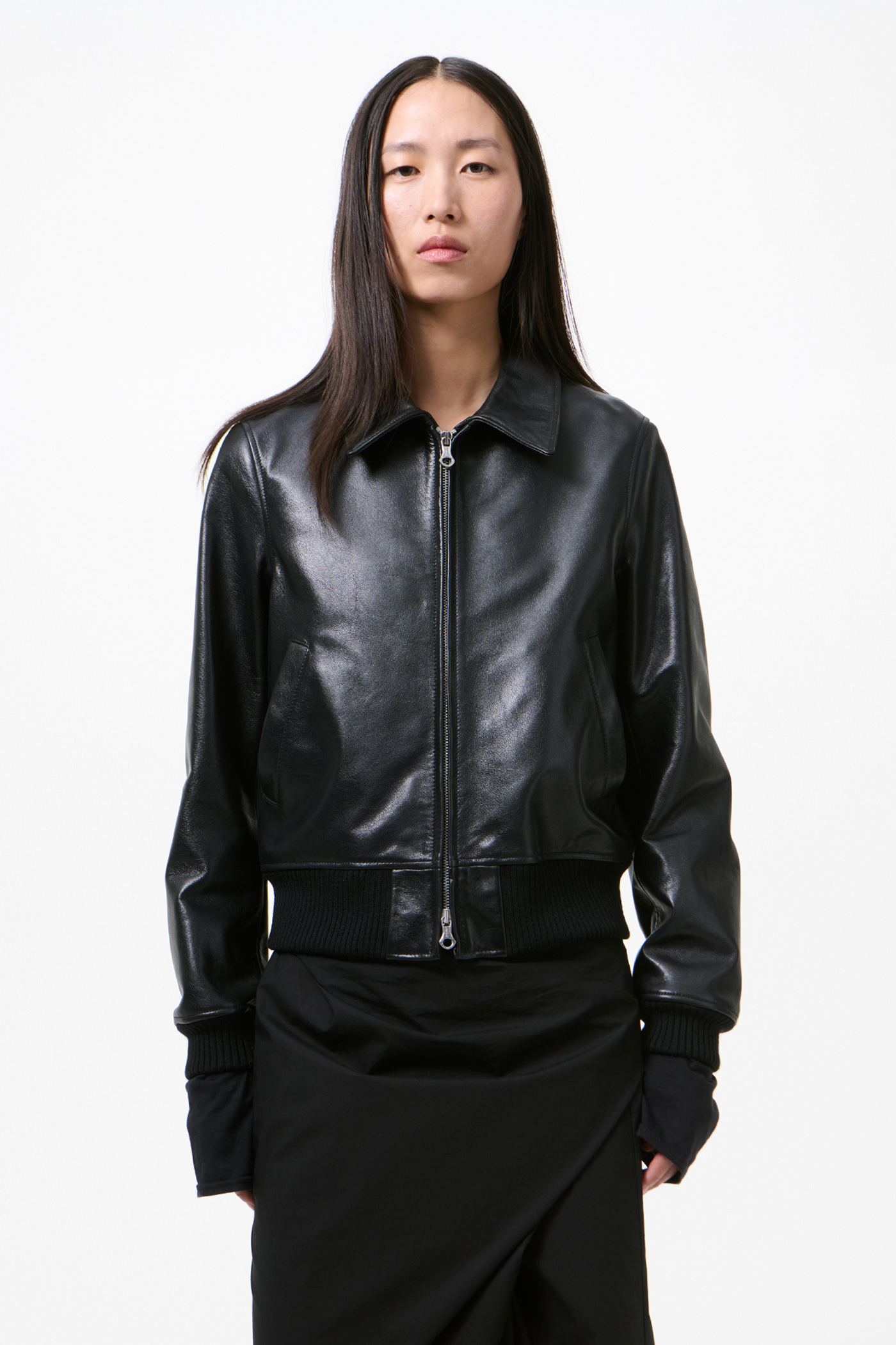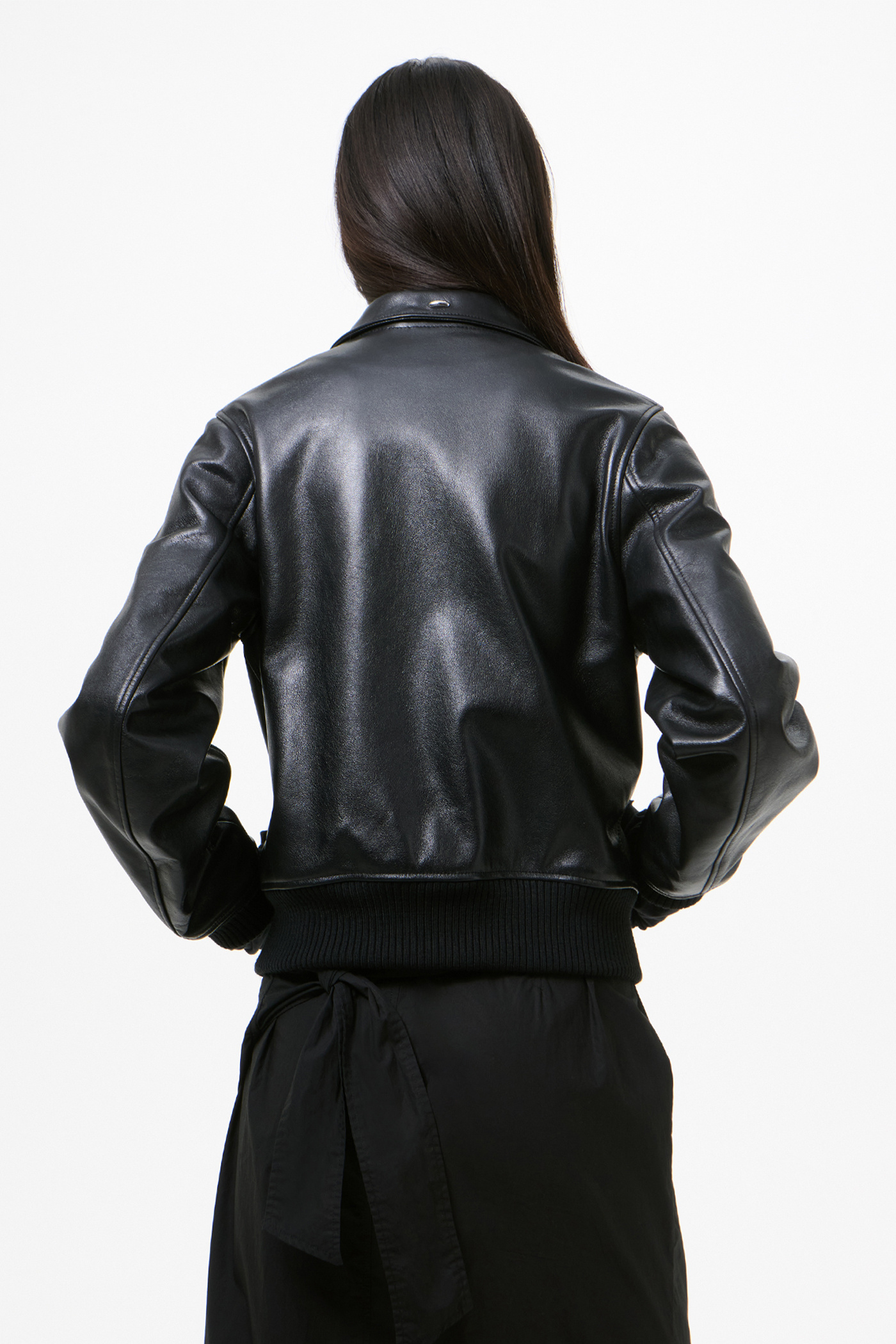 Our Radar Bomber is crafted in Malleable Black Bull Hide. Produced from Italian bull leather, the women's Radar Bomber has a sleek and shaped fit and features a detachable rib collar that attaches to the inner collar stand, a cotton and viscose lining, ribbed cuffs and hem, a welt pocket on the inside placket and two front welt pockets with hidden snap closure.