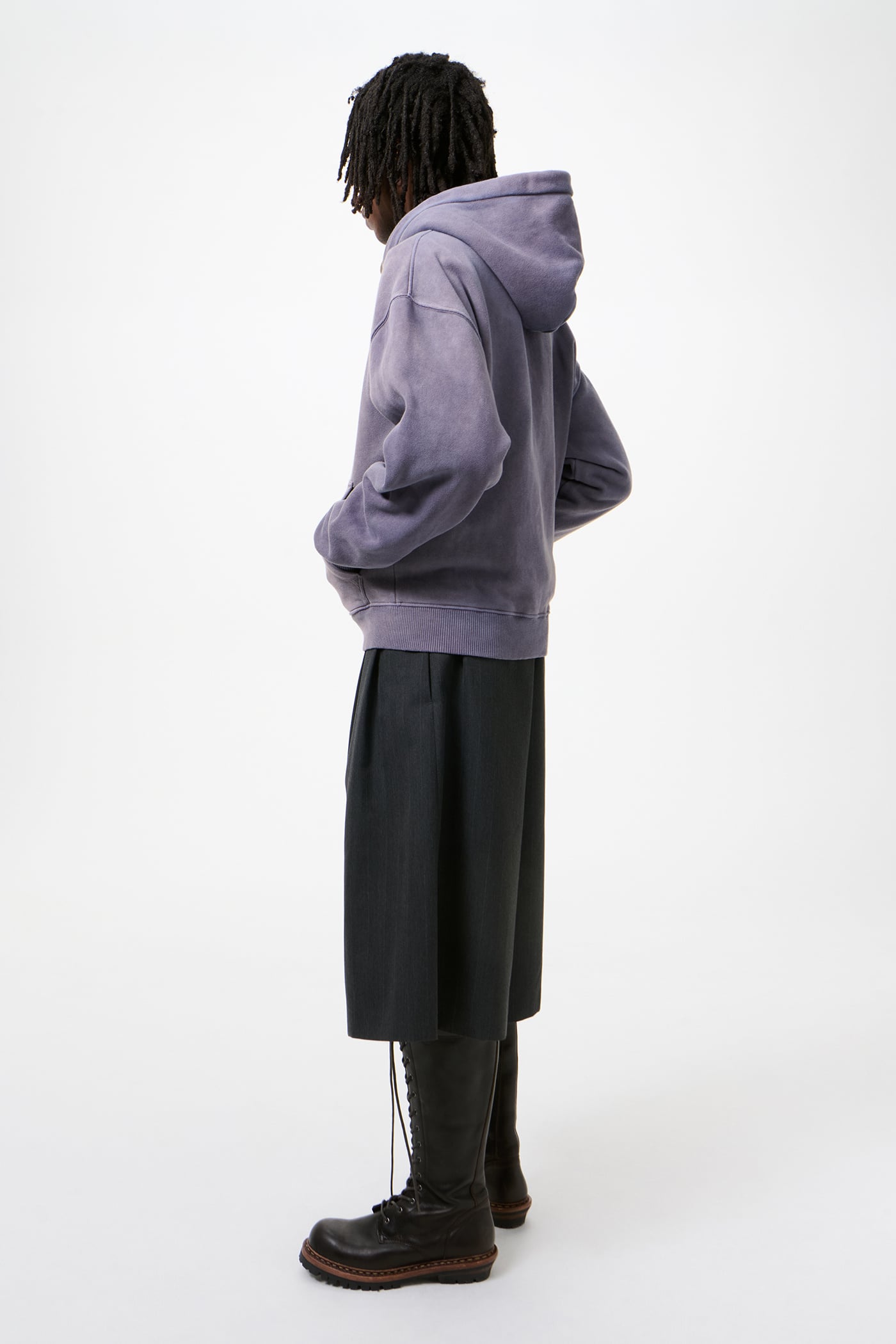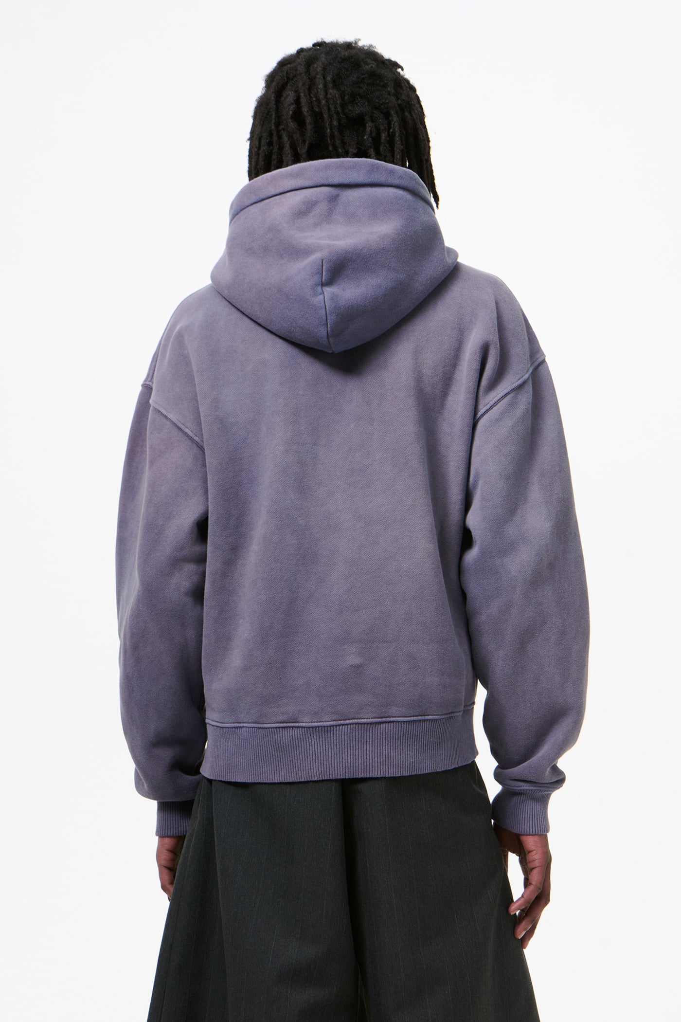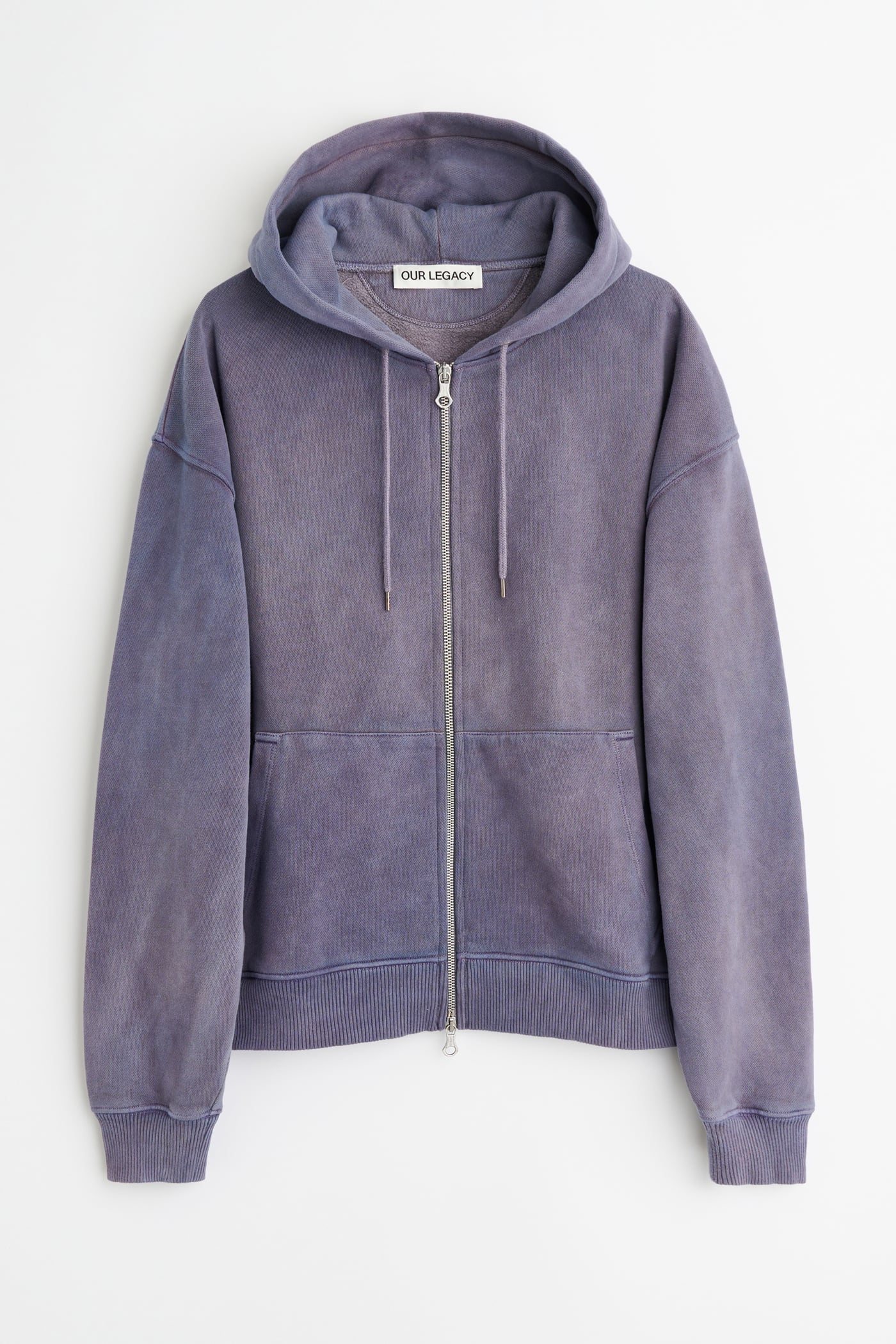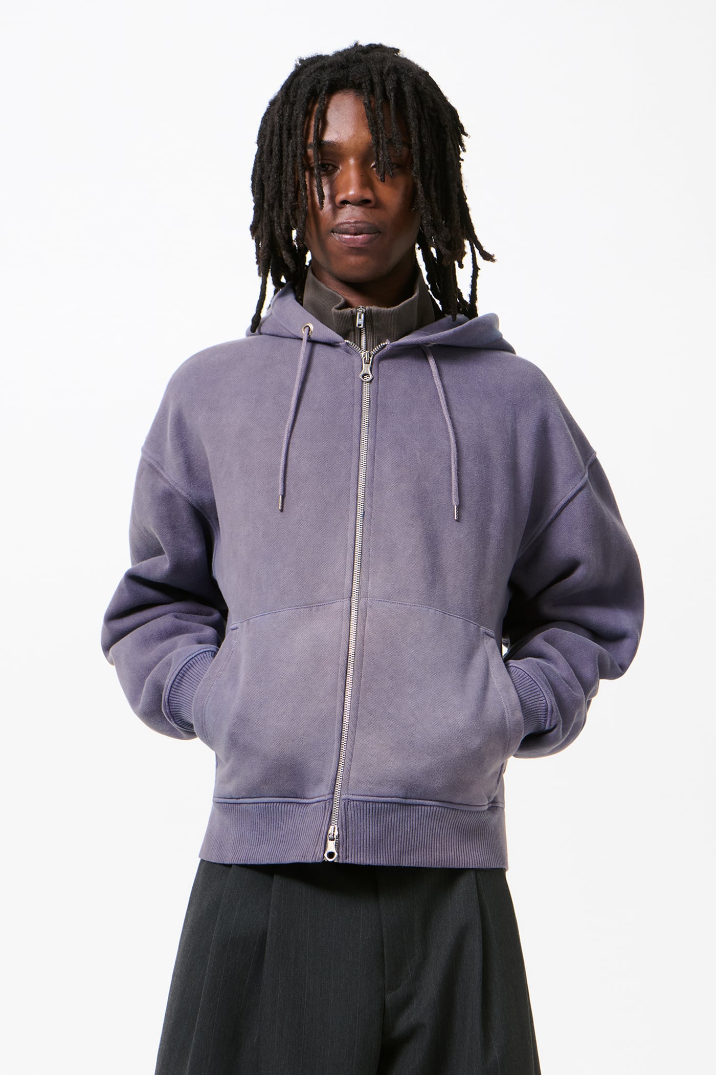 Our Rascal Hood in Antique Amethyst Star Fleece. Produced in a Portuguese heavyweight organic cotton jersey, pigment dyed and finished with specialized treatments, the fleece offers a dense, soft hand with warm, comfortable wear. The vintage-inspired, lived-in character gives each piece depth and uniqueness, while the knit construction provides insulation and breathability. The Rascal Hood has a boxy, cropped fit with dropped shoulders and features a drawstring hood, a two-way Lampo zip, a kangaroo pocket, and ribbed cuffs and hem.