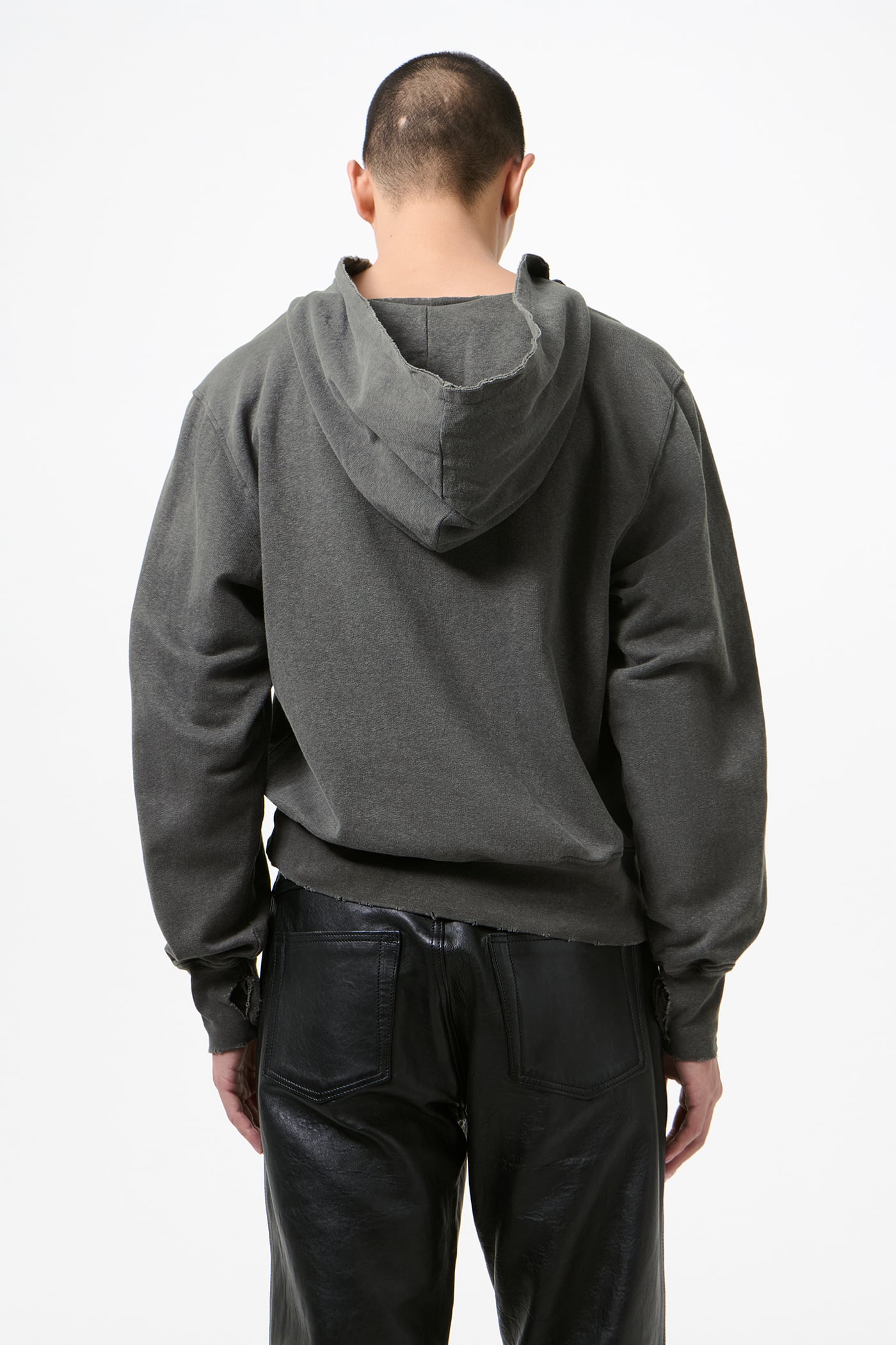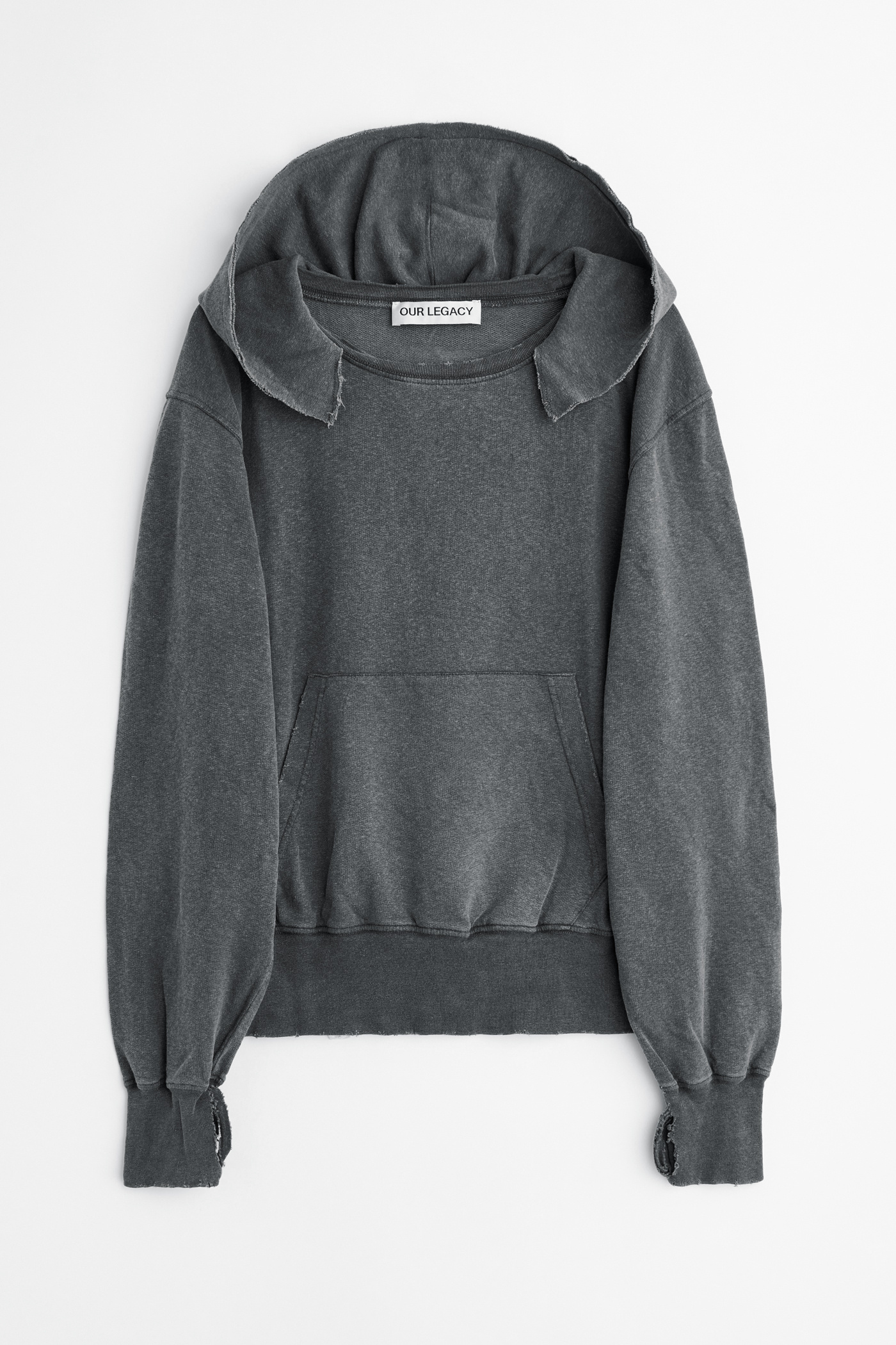 Our Relic Hoodie in Washed Black Rogue Loopback. Produced in an Italian loopback fabric woven from cotton, linen and elastane, the Relic Hoodie has a boxy fit and features pigment dyeing, distressed details, a wide ribbed neckline, an open hood with raw edges, ribbed hem and cuffs, distressed thumb openings and a kangaroo pocket.