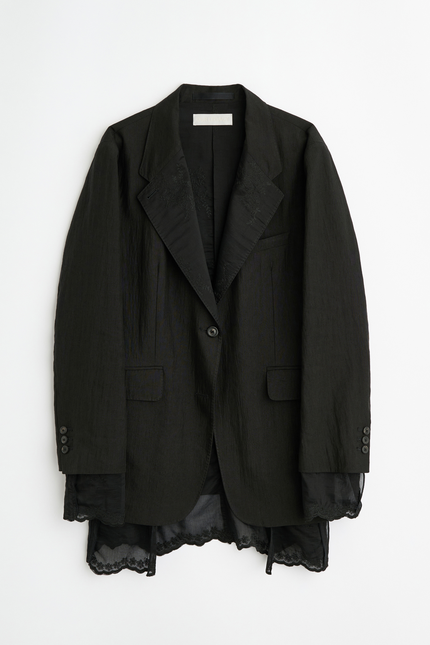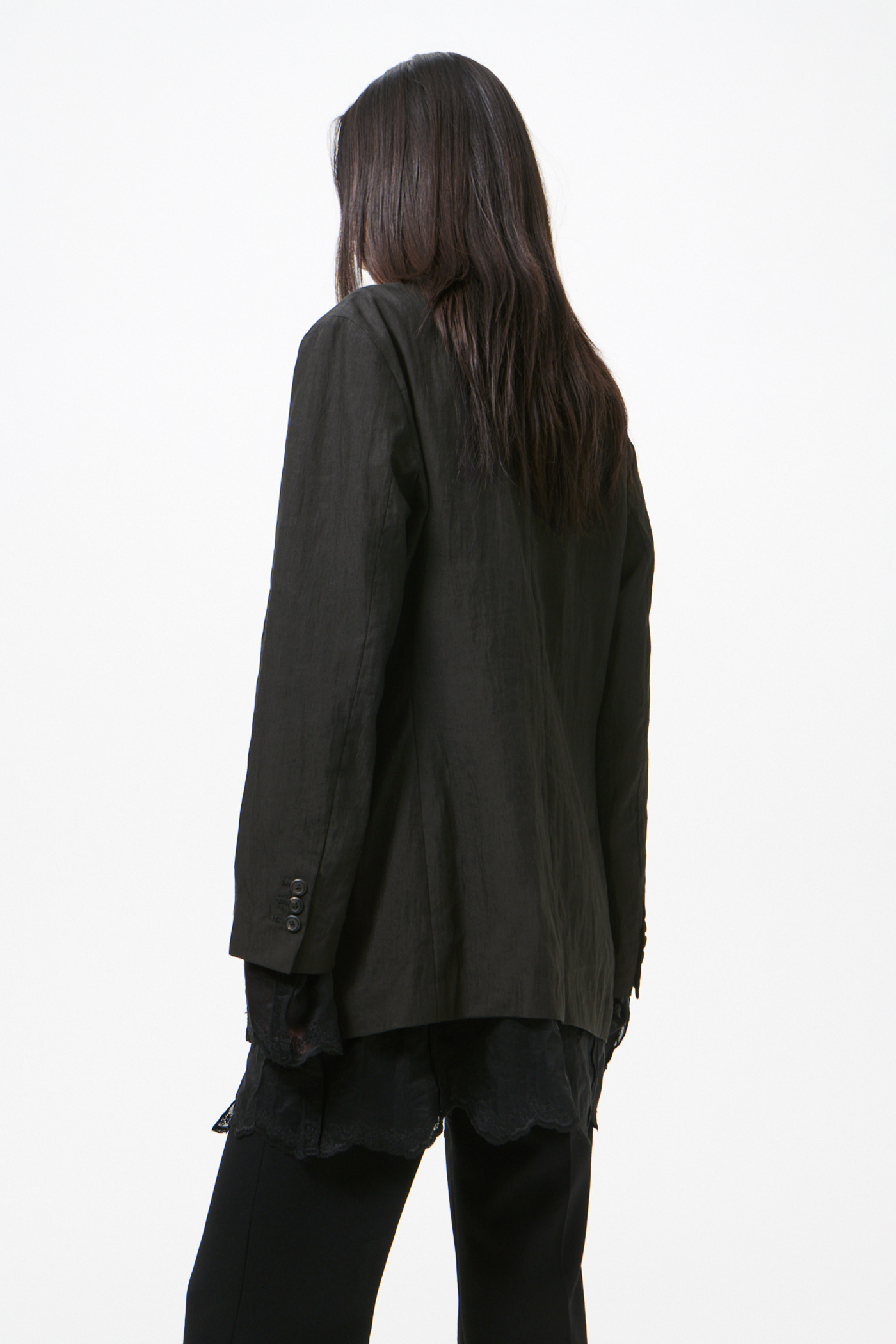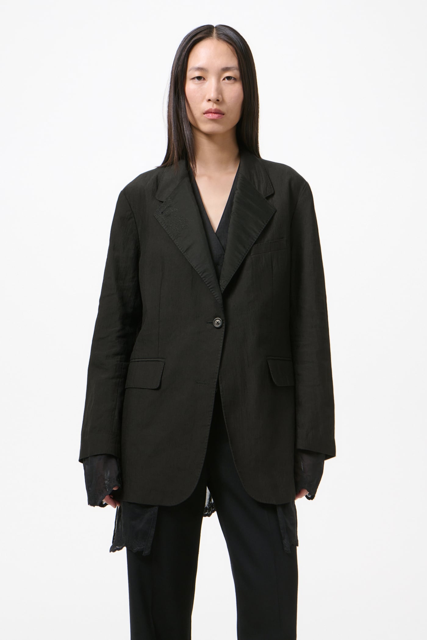 Our Reversible Drip Blazer in Soot Black Techflax. Produced in an Italian linen and polyamide blend fabric that has been piece dyed, this slightly oversized single-breasted blazer is unconstructed with a soft, collapsing drape. Designed with elongated proportions, its special lining extends beyond the shell at the body and sleeve hems, revealing a finished embroidered edge.