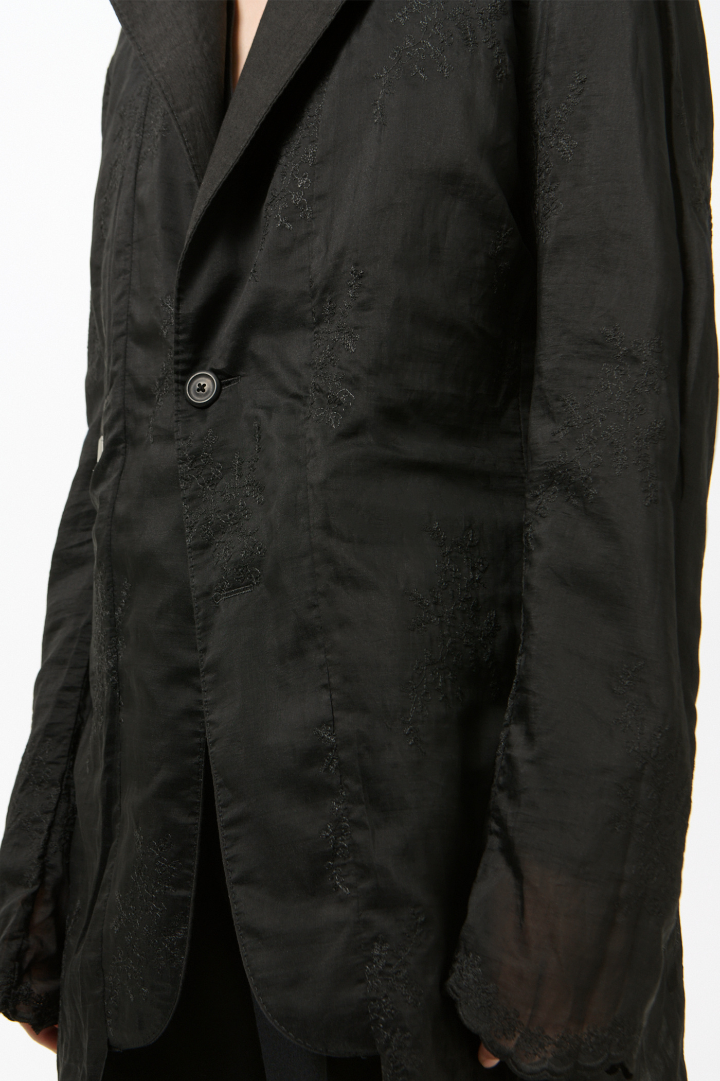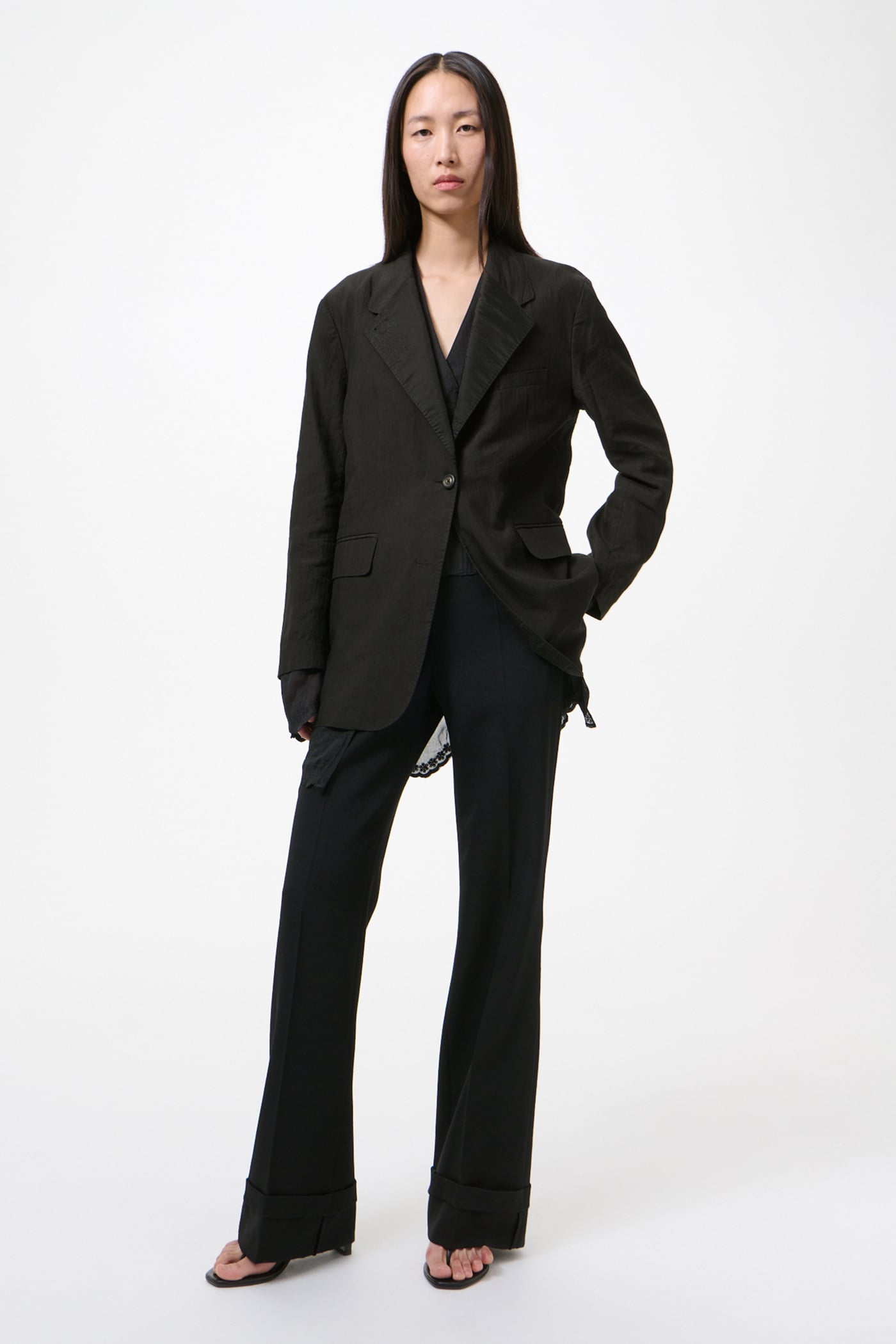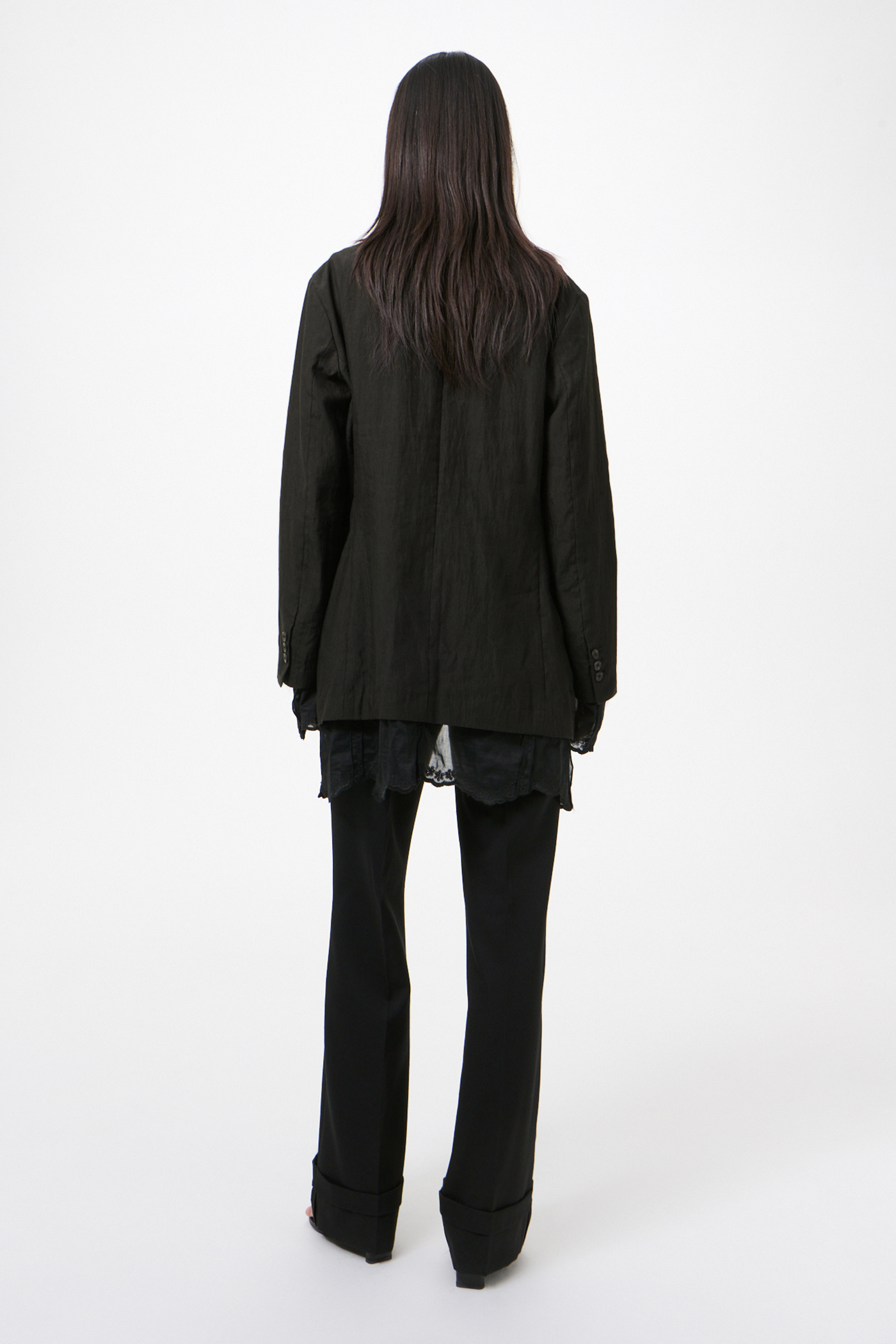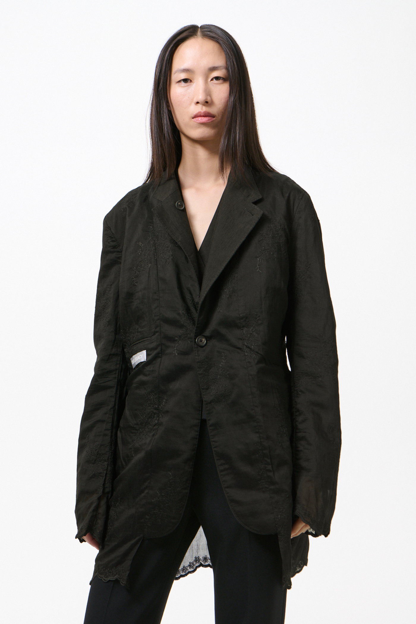 Our Reversible Drip Blazer in Soot Black Techflax. Produced in an Italian linen and polyamide blend fabric that has been piece dyed, this slightly oversized single-breasted blazer is unconstructed with a soft, collapsing drape. Designed with elongated proportions, its special lining extends beyond the shell at the body and sleeve hems, revealing a finished embroidered edge.
