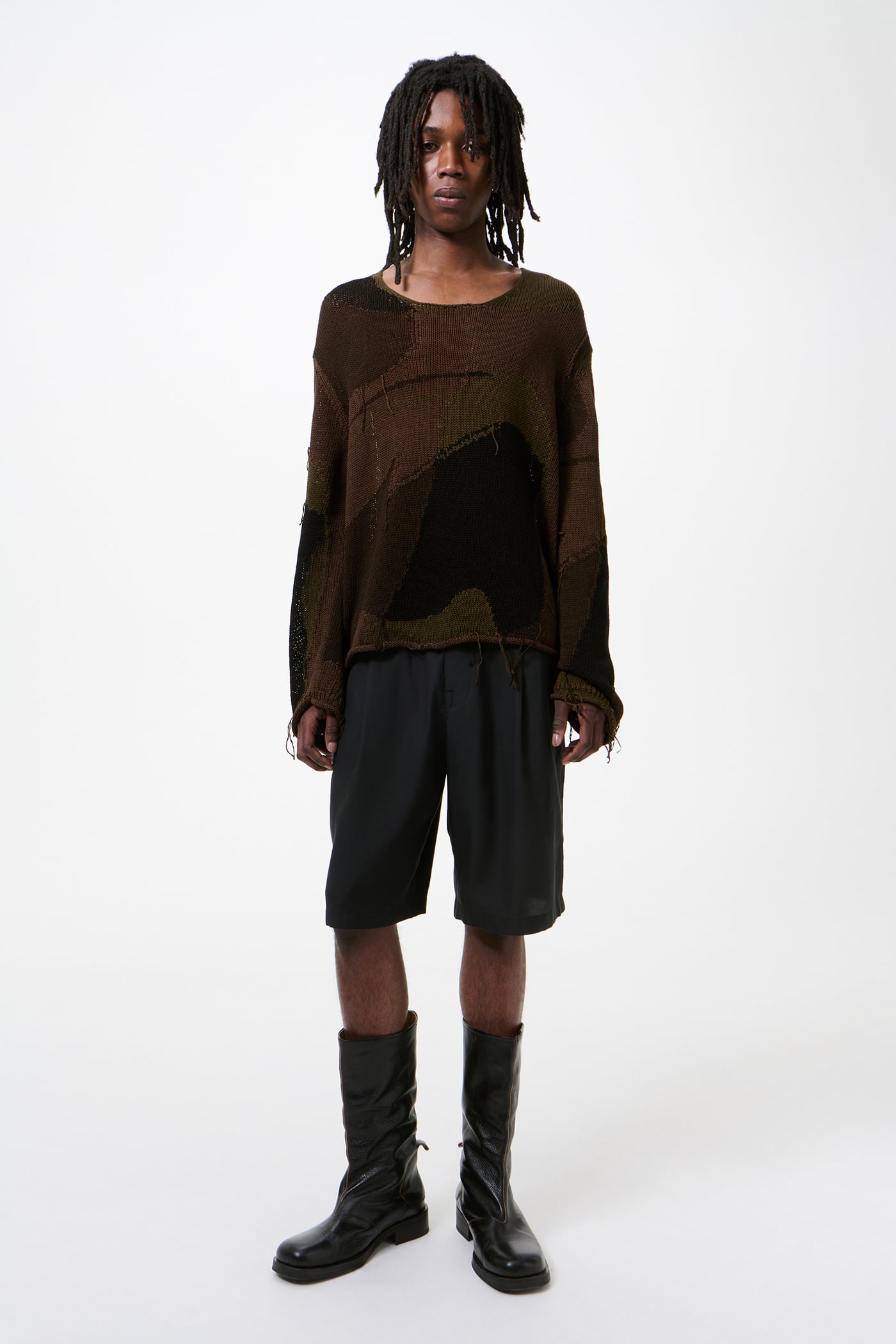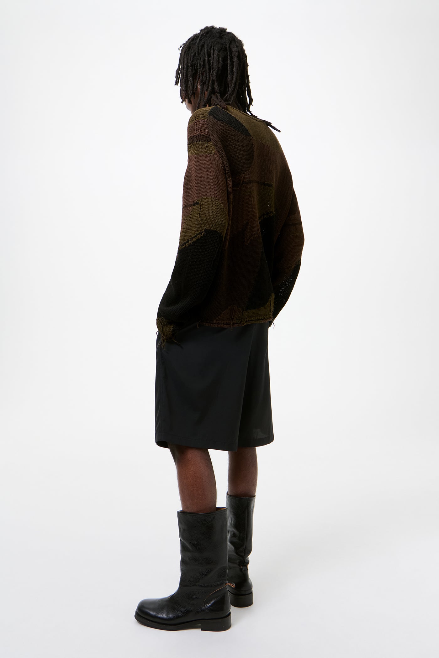 Our Rigid in Camo Cotton Rafia. Produced using Italian organic cotton raffia yarn spun with a technique inspired by natural raffia fibers, delivering a lightweight, ribbon-like structure with an airy yet structured feel, a slightly coarse texture and subtle sheen. It has a relaxed fit and features a fashioned neckline with a rolling edge, French shoulders, reverse stitch detail at the side seams, and rolling cuffs and hem.