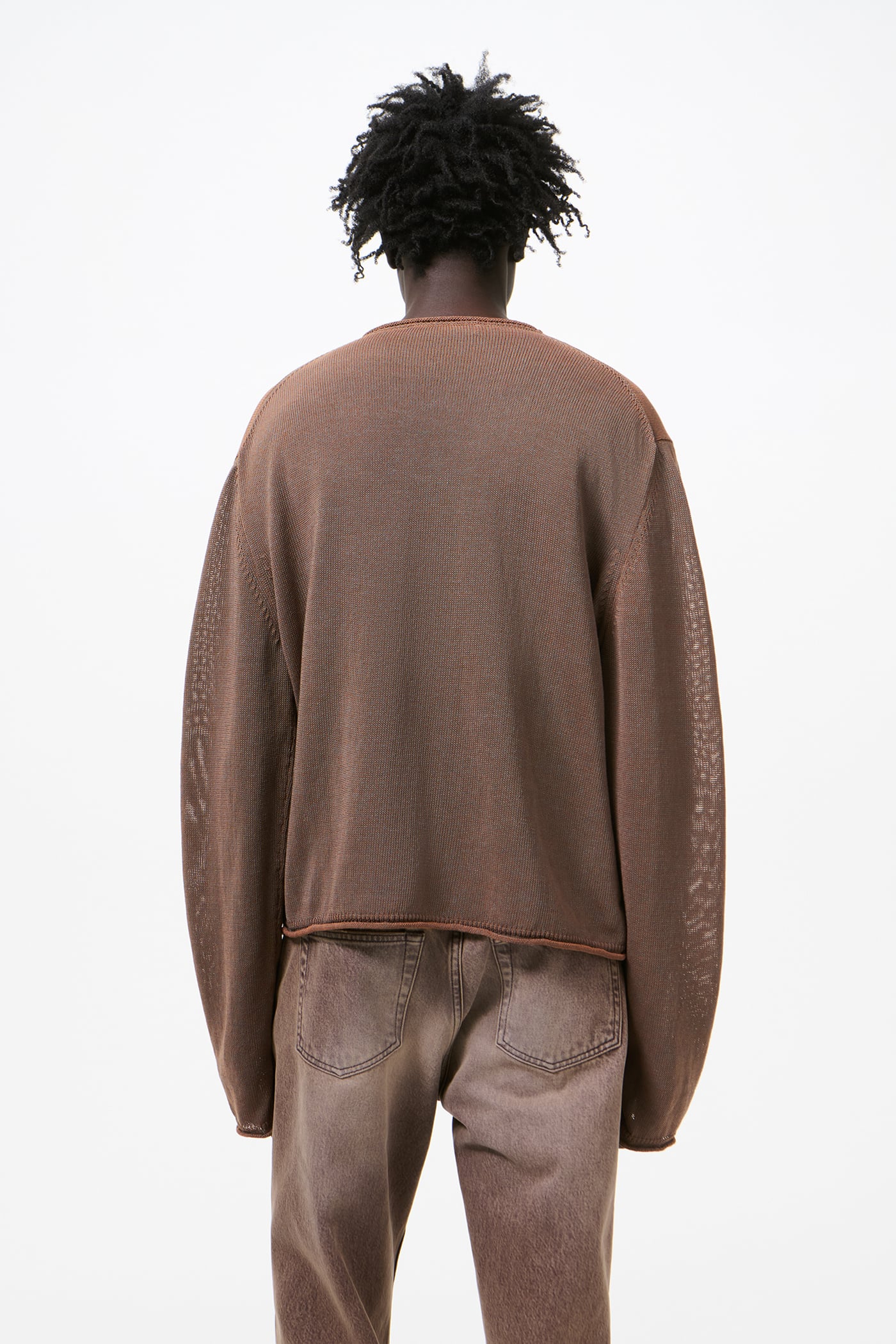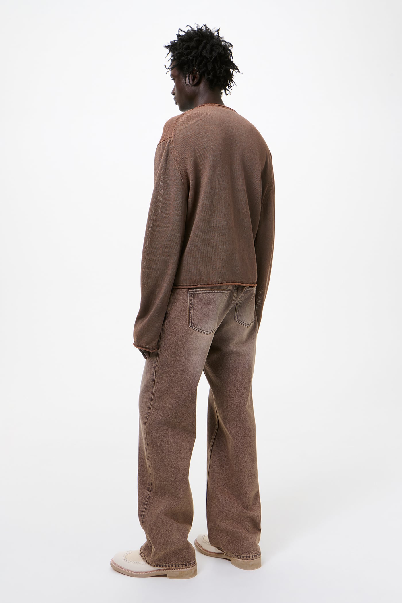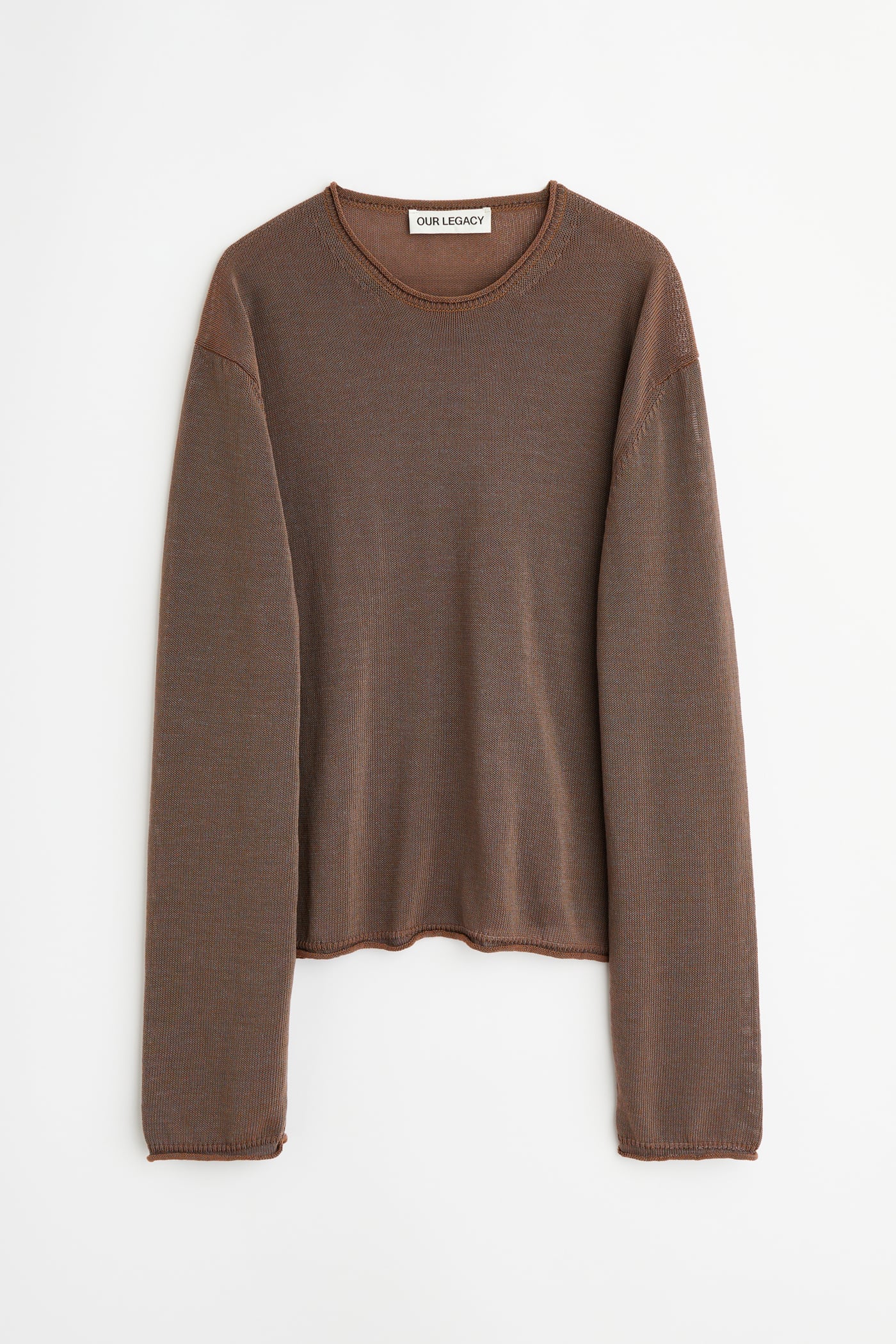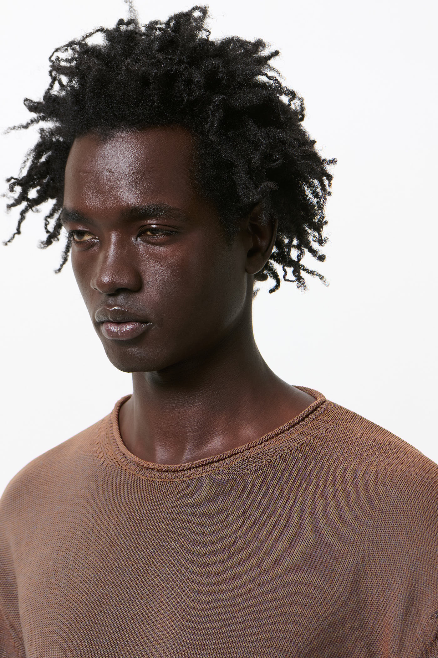 This garment is manufactured using a carefully sourced yarn. The natural characteristics of the yarn, combined with the construction of the knit allows the garment to expand when worn. The garment shall be shaped by its wearer and naturally distress over time to finish the design process. To help keep the integrity of the garment please store the garment folded.