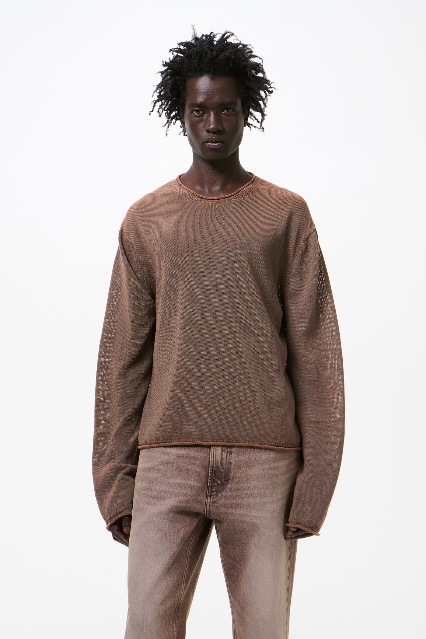 Our Rigid Popover in Cangiante Copper Tech Cotton. Produced in an Italian yarn blending organic cotton and linen, this knit popover showcases a cangiante effect that shifts tone with movement. It features a fashioned neckline with a rolling edge, French shoulders, reverse stitch detailing at the side seams, and rolling cuffs and hem, with a relaxed fit.