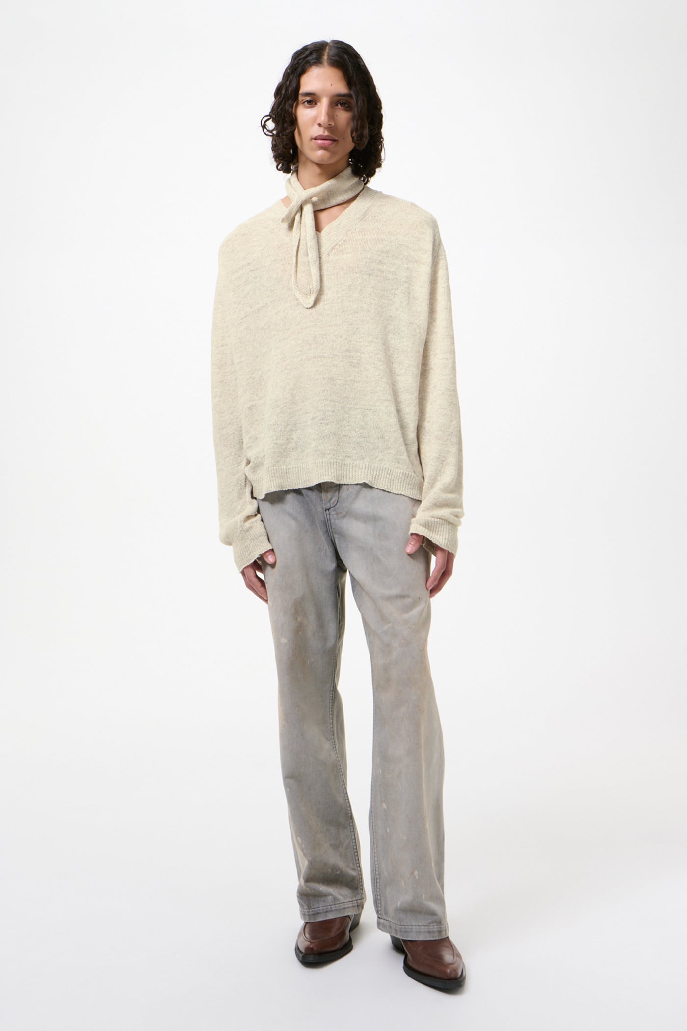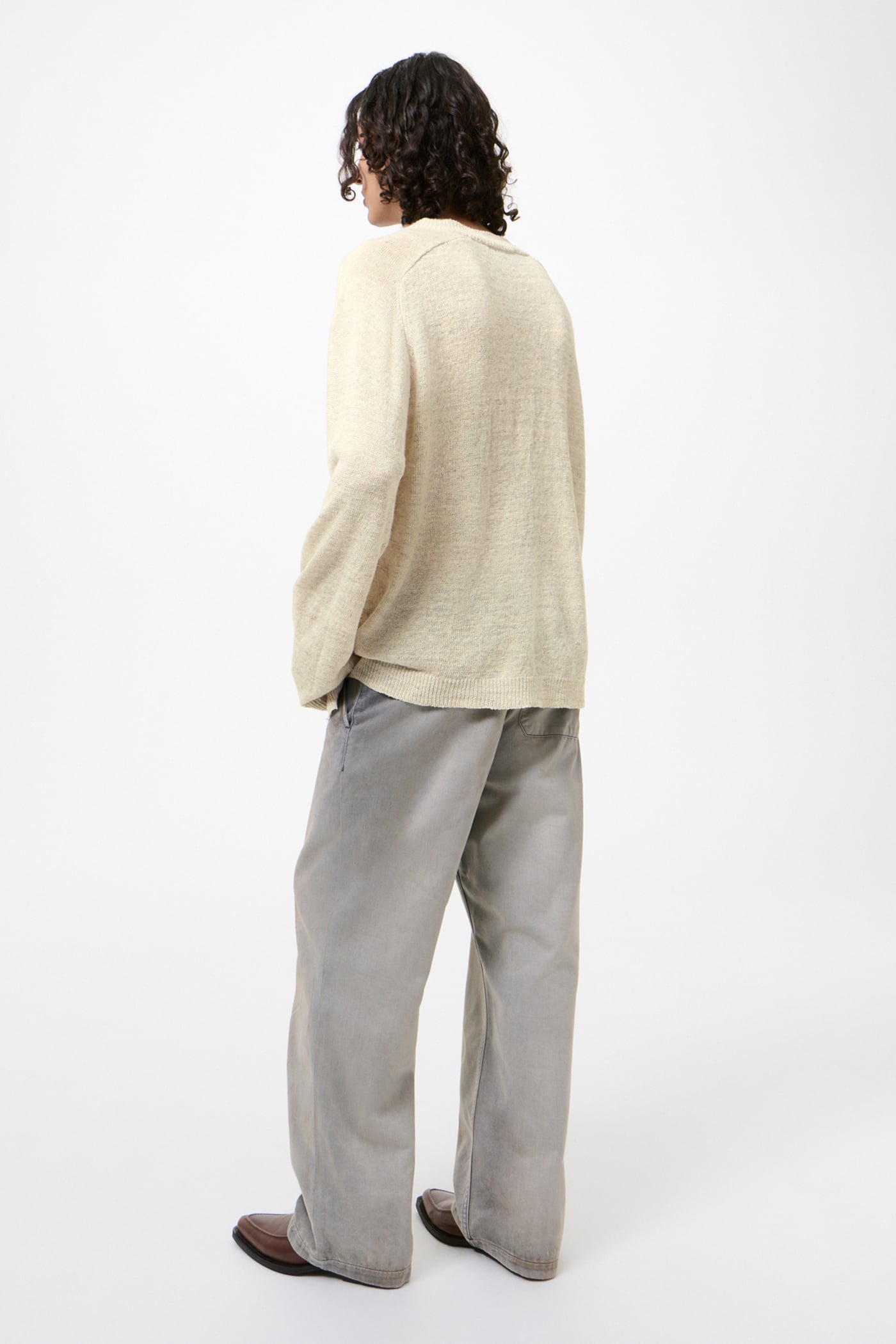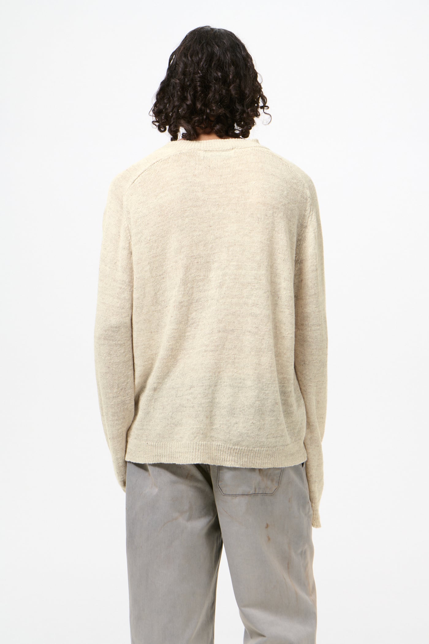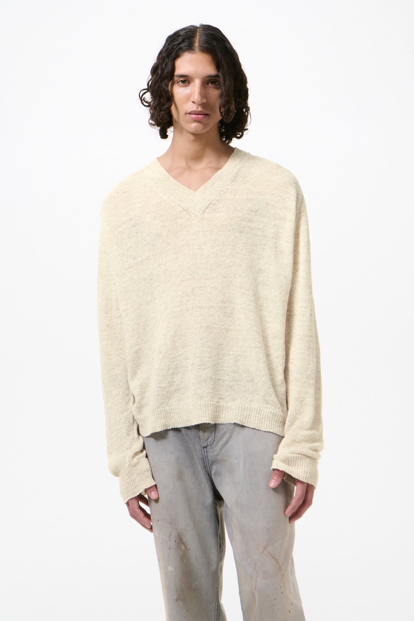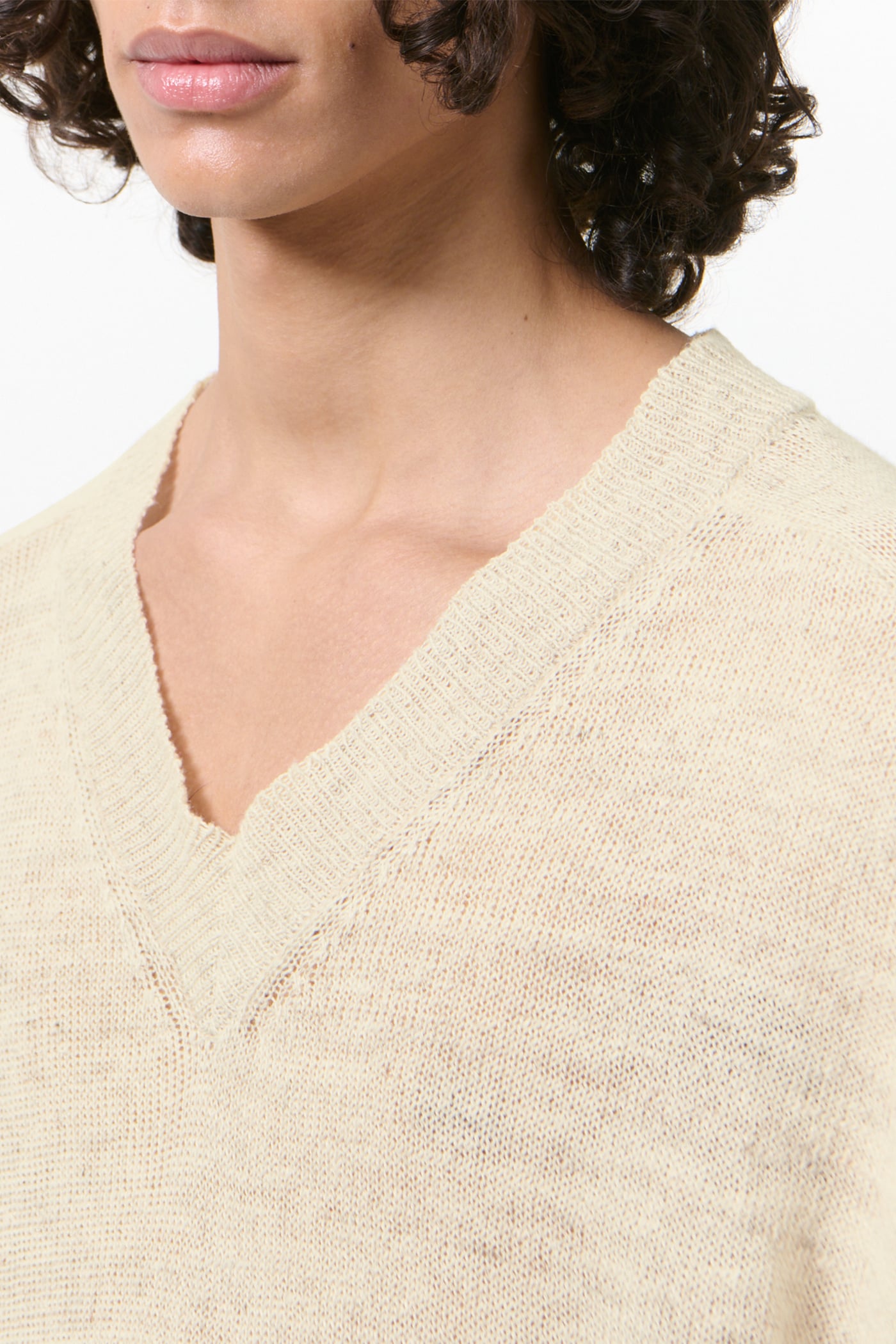 Our Rue V-Neck in Soft Ecru Cyclone Linen. Produced in an Italian yarn of linen and organic cotton, this airy plain-knit piece features a ribbed V-neck collar, saddle sleeves, ribbed cuffs and hem, and a relaxed, boxy fit.