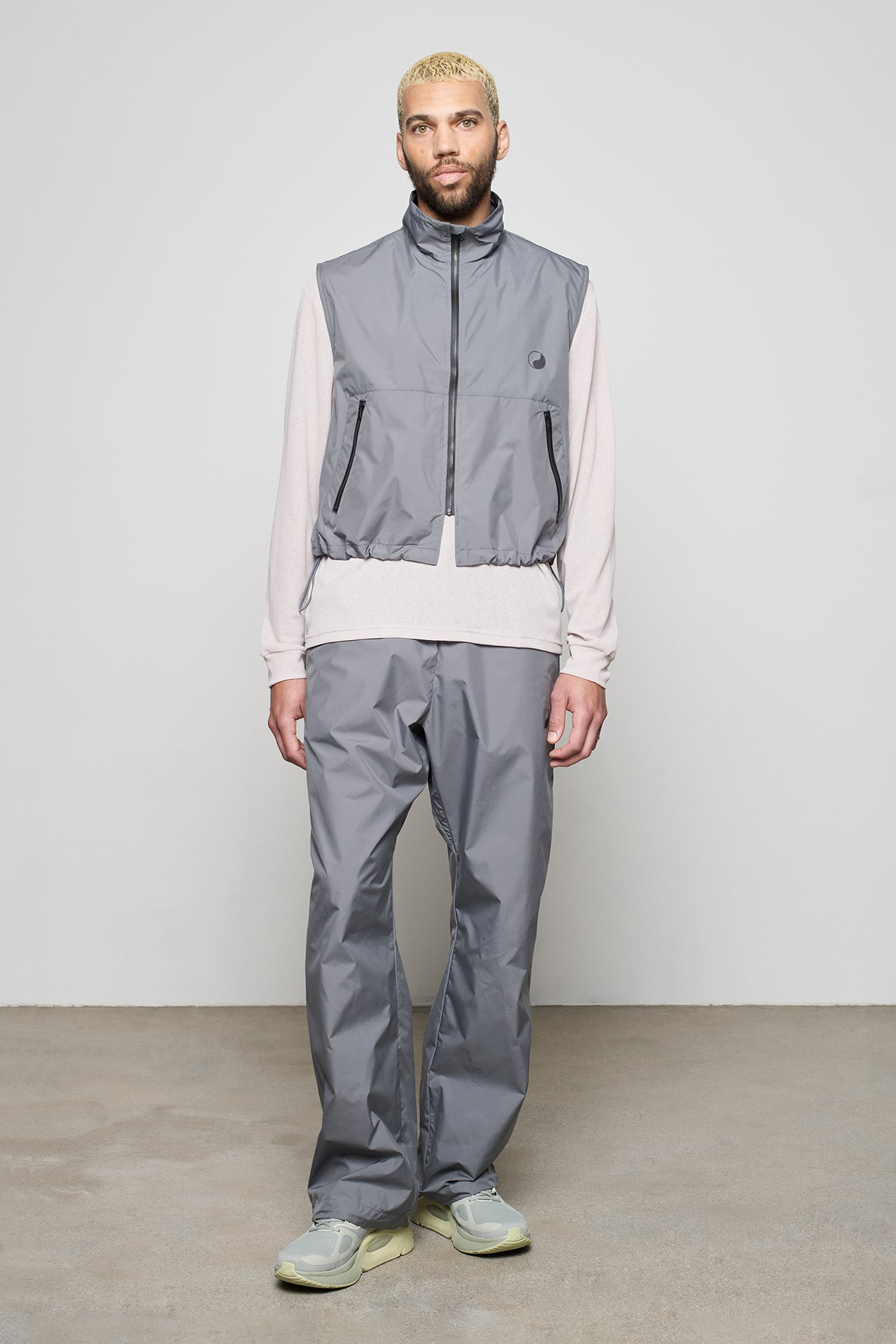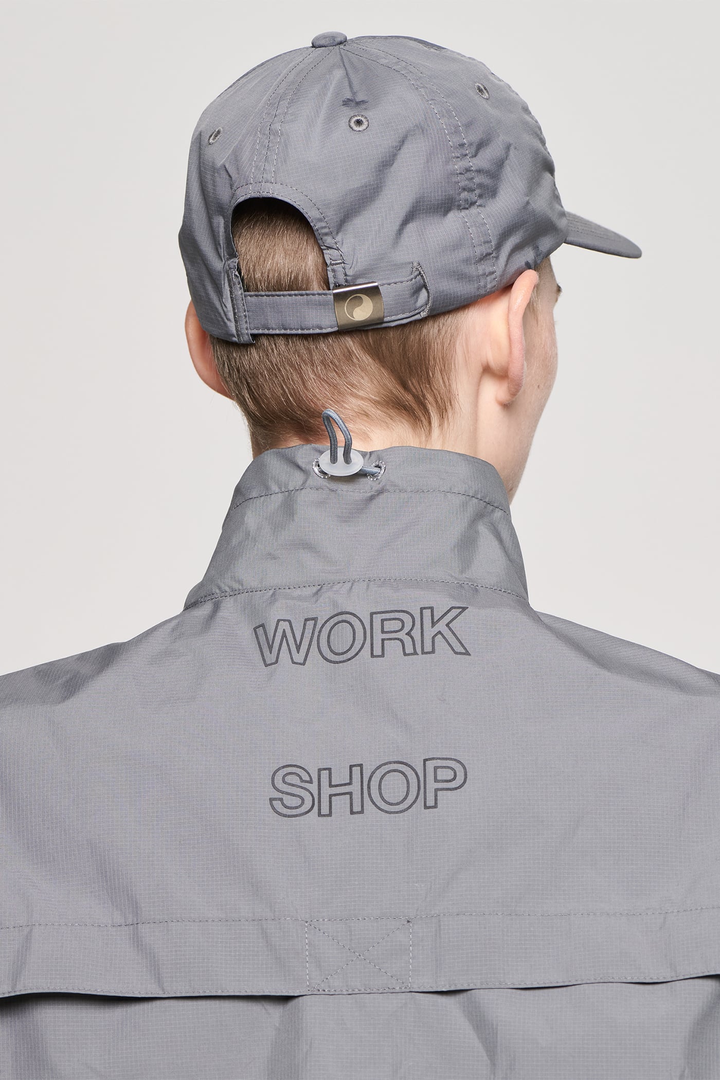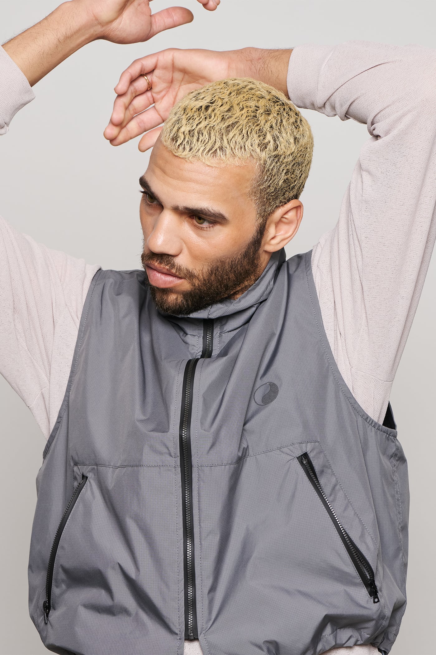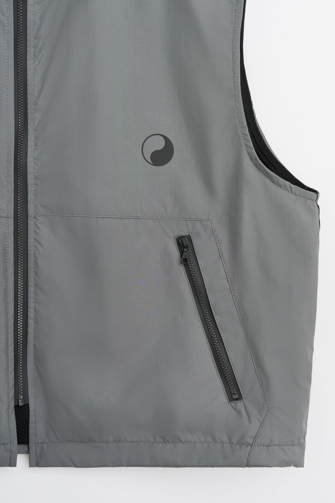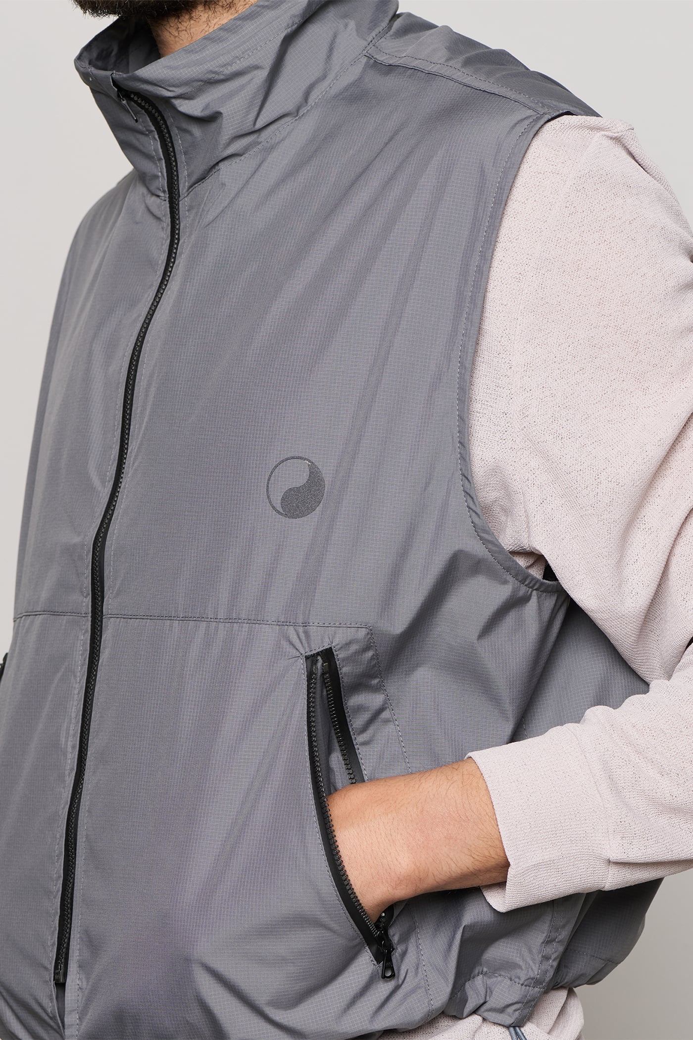 Our Running Gilet in Grey. Produced in Italian recycled polyester with resin coating, the Running Gilet features wind resistant and water repellent properties and is fully lined in mesh. The gilet has a drawstring neckline and hem, plastic RiRi zip closure, two front zip pockets and an inner zip pocket. Details include a reflective Yin Yang chest print, back vent and reflective WORK SHOP back print.