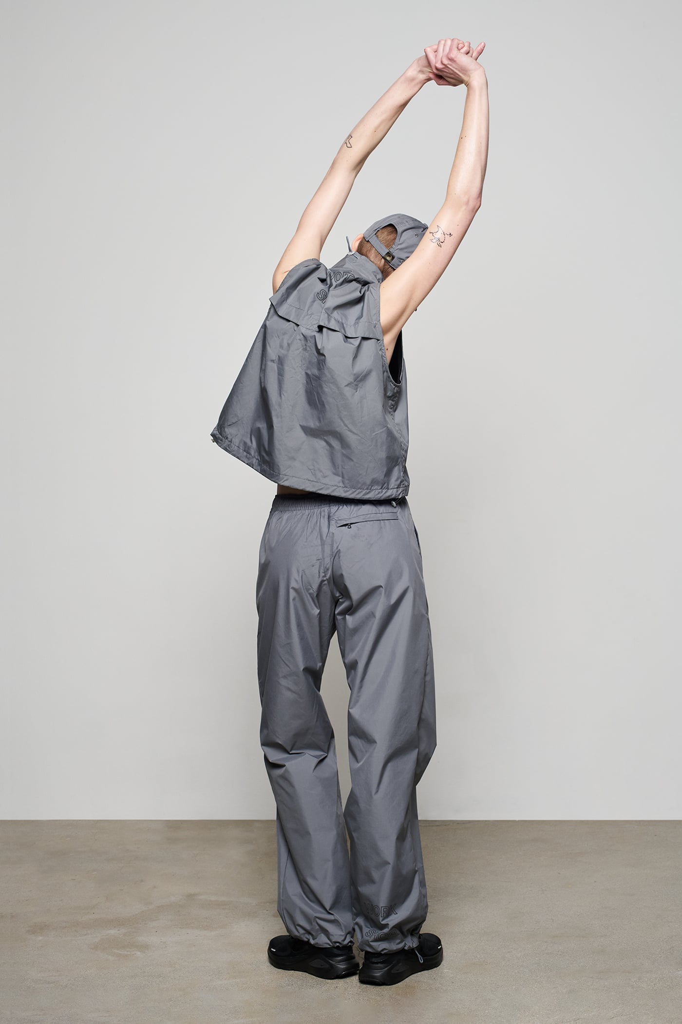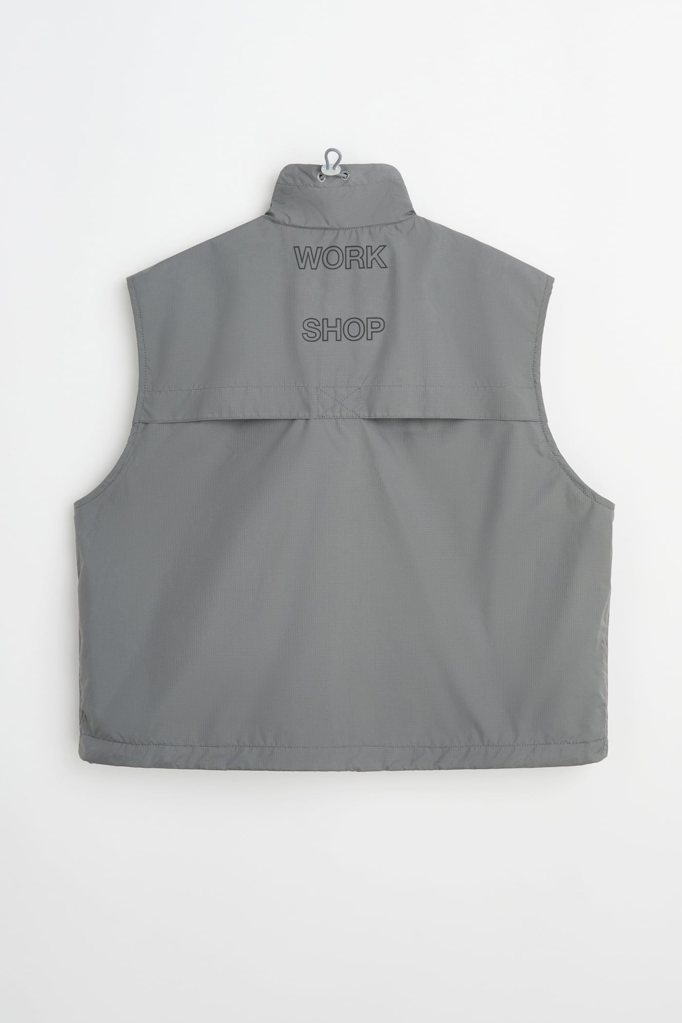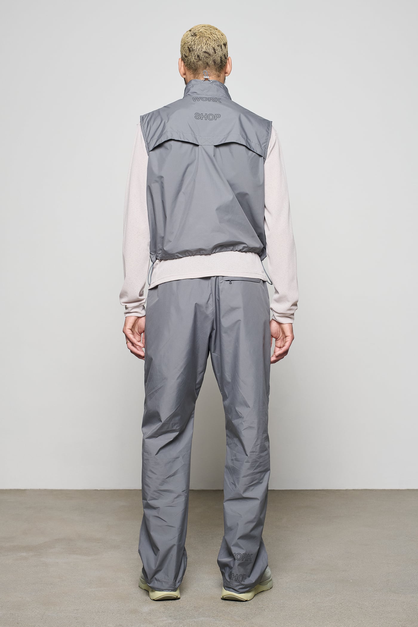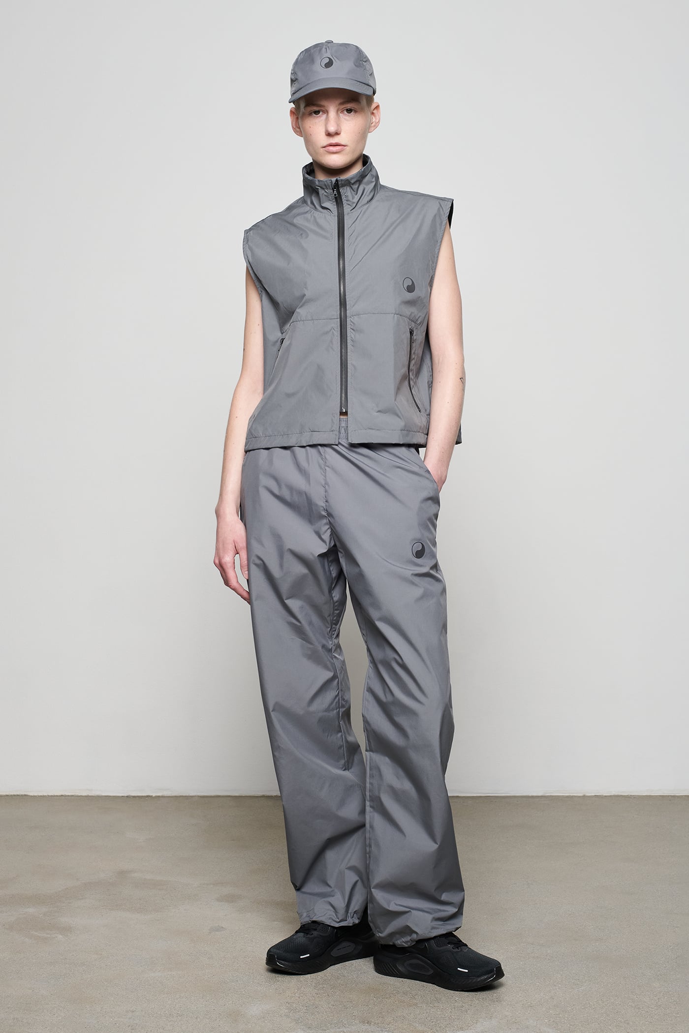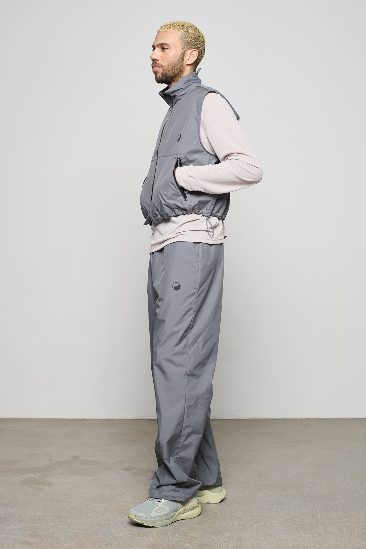 Our Running Gilet in Grey. Produced in Italian recycled polyester with resin coating, the Running Gilet features wind resistant and water repellent properties and is fully lined in mesh. The gilet has a drawstring neckline and hem, plastic RiRi zip closure, two front zip pockets and an inner zip pocket. Details include a reflective Yin Yang chest print, back vent and reflective WORK SHOP back print.