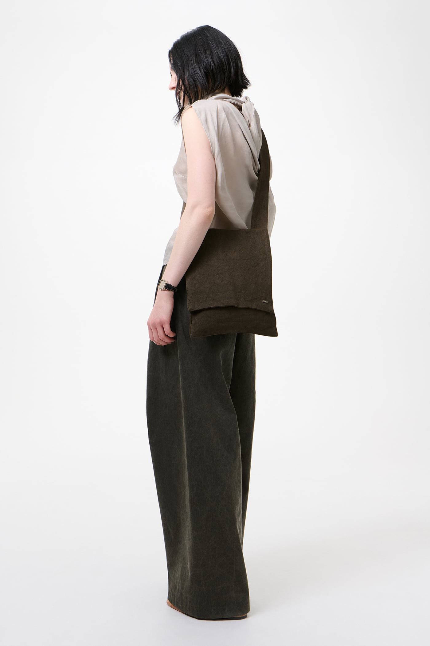 Our Slack Bag in Dry Olive Airy Linen. Produced in a Japanese linen fabric, the Slack Bag is a smaller, flat crossbody bag with a flap closure and a shoulder strap secured to the back panel, where you also find a zipped pocket. Finished with an inside welt pocket.