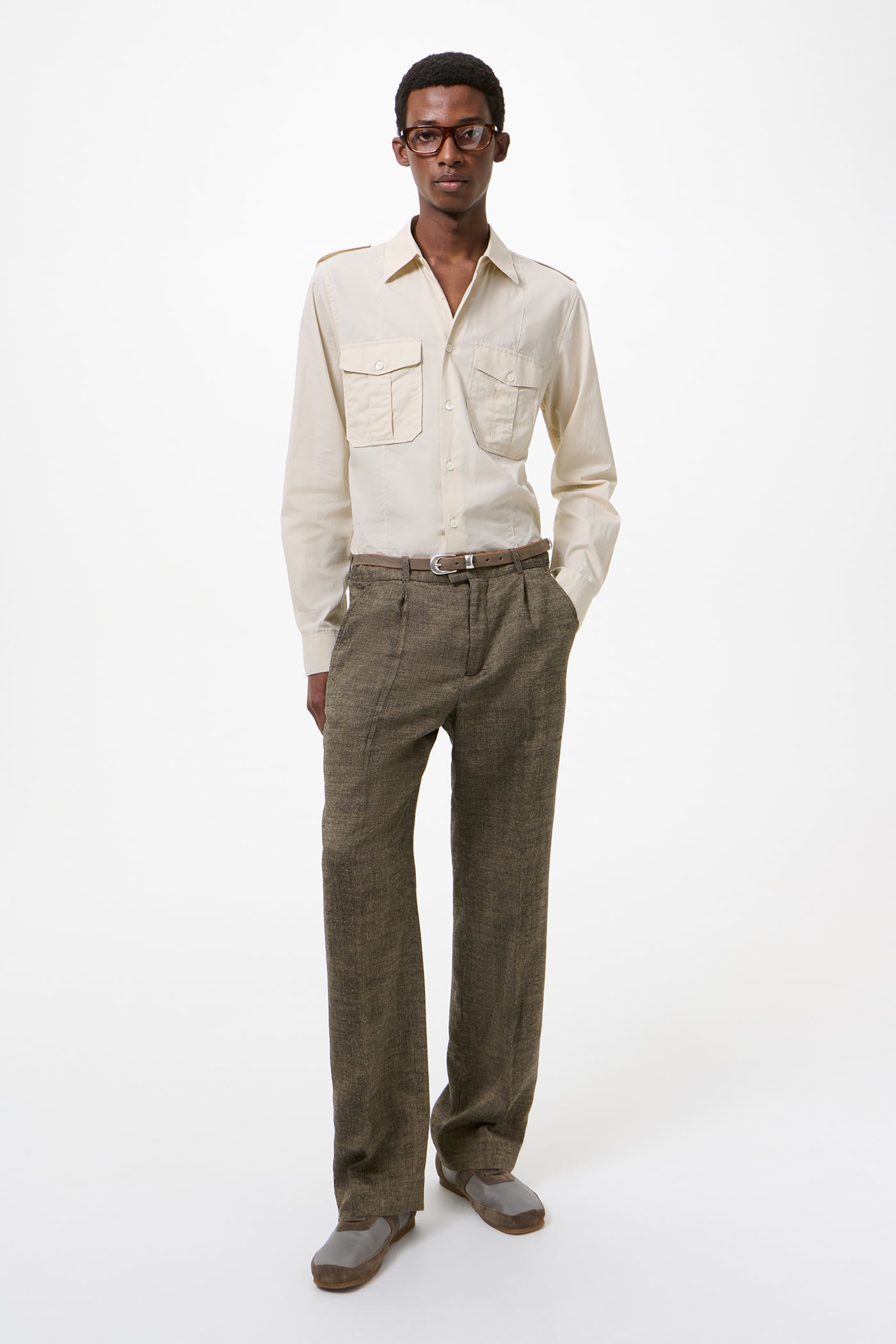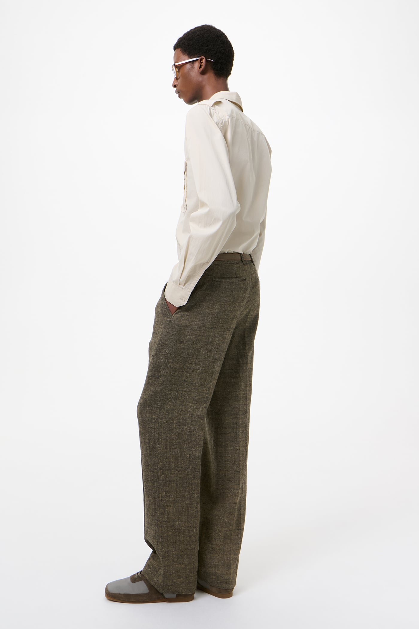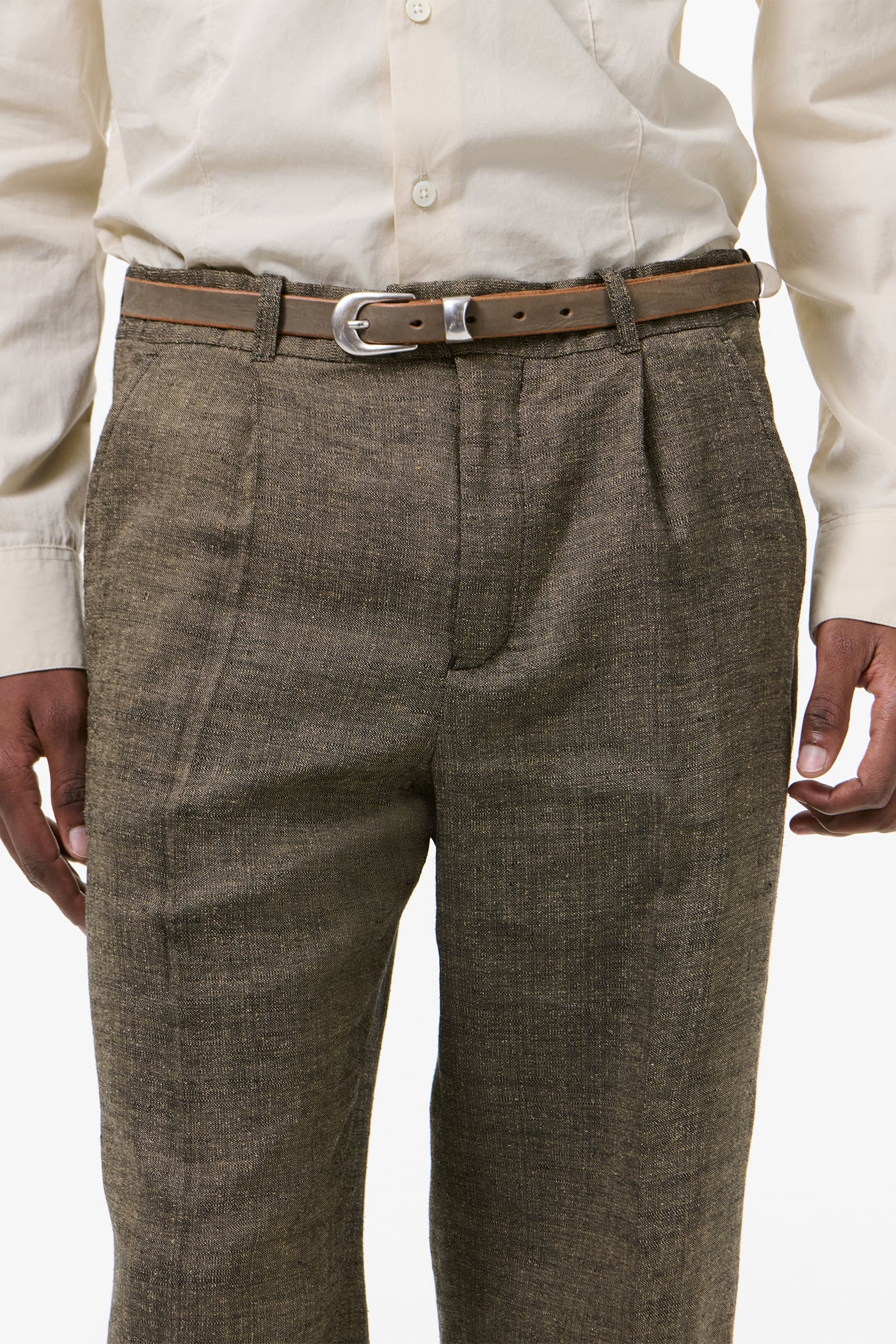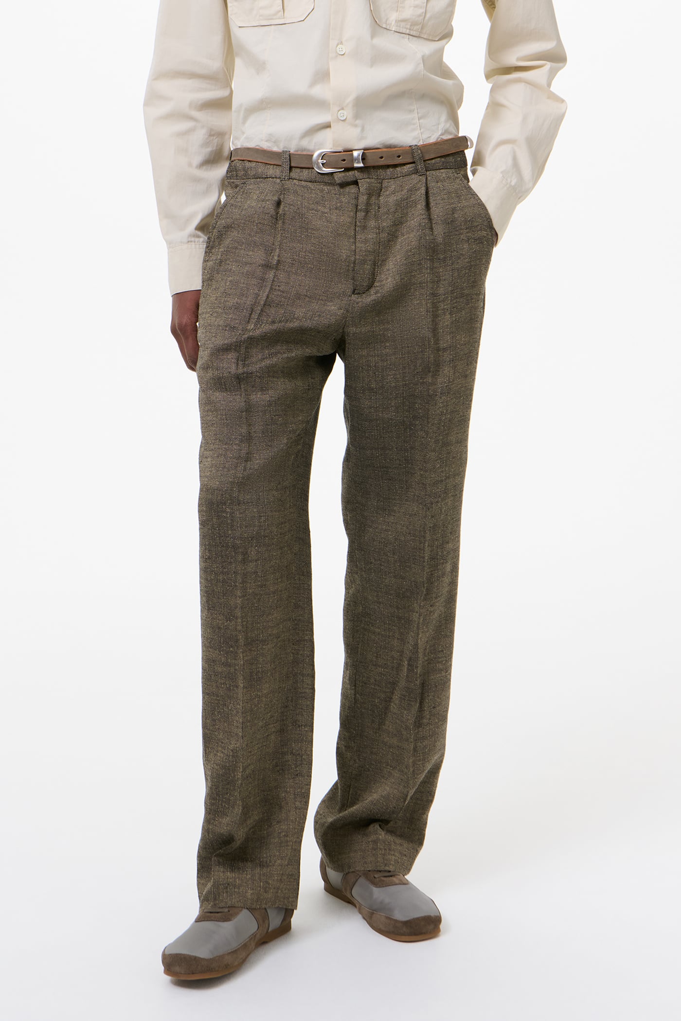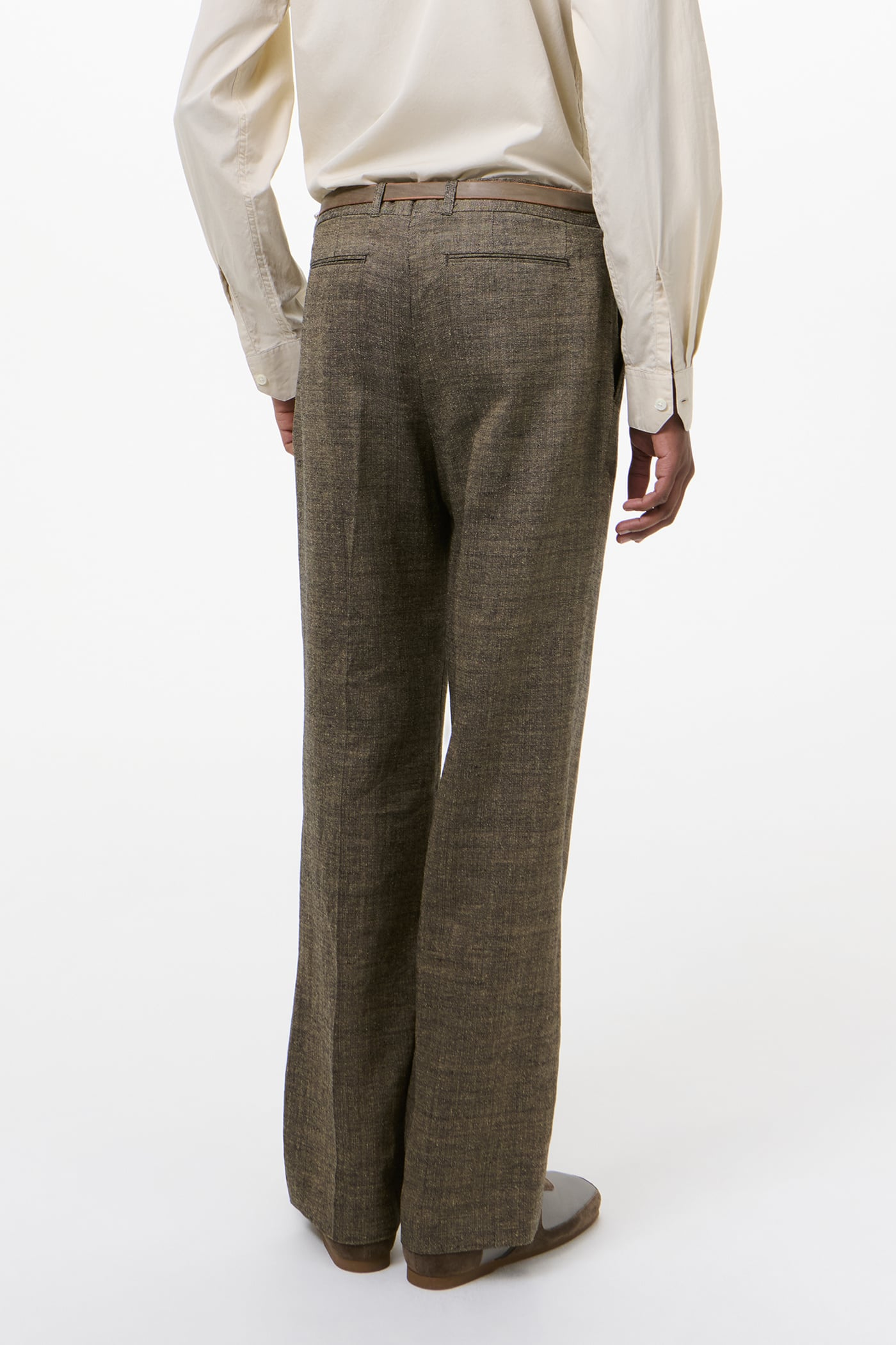 Our Slack Trouser in Deep Husk Soft Grain Weave. Produced in an Italian linen, silk and cotton blend with a softly textured grain, the Slack Trouser has a relaxed, low-rise silhouette with a slight bootcut and features a pre-constructed waistband, a concealed front closure with YKK zip fly, horn buttons, two side pockets and two back pockets.