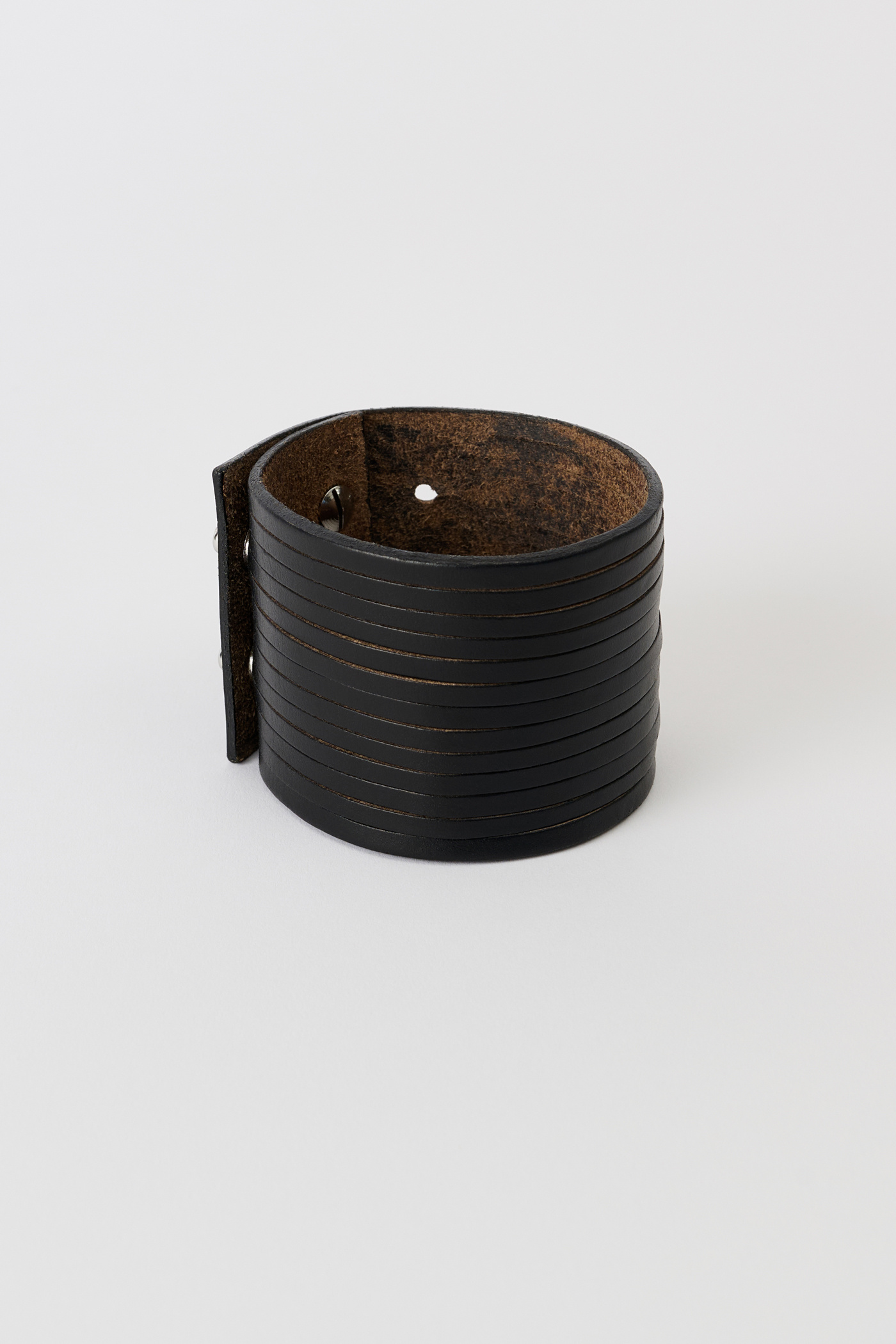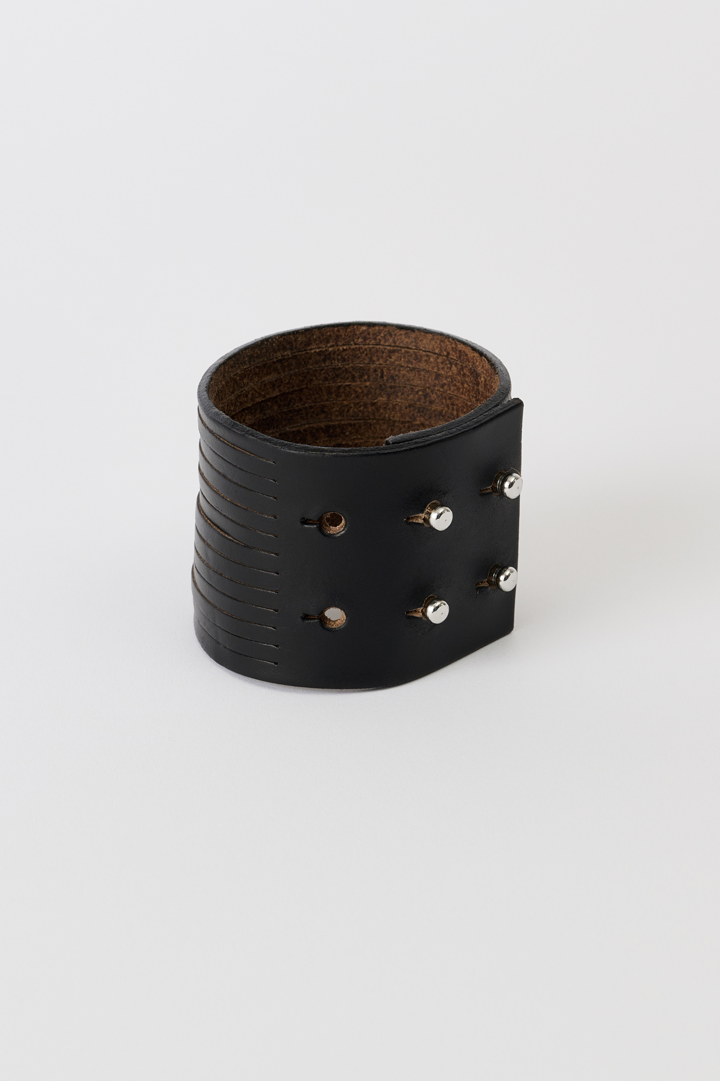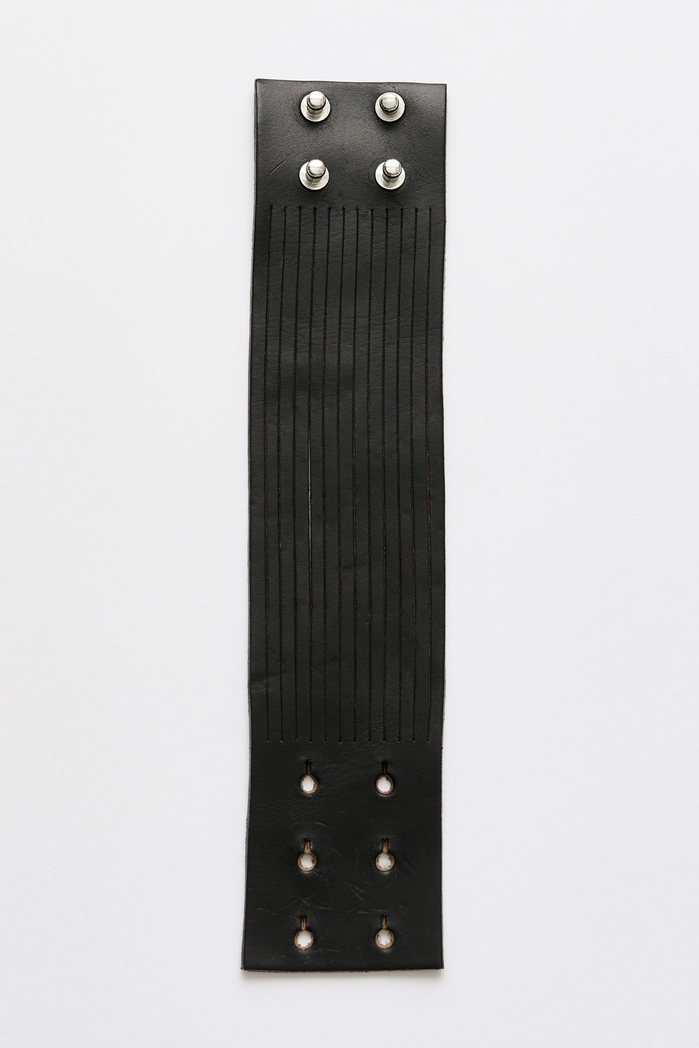 Our Slash Bracelet in Black Chromexcel Leather. Produced in a soft American Chromexcel leather with a pull-up effect, this wide bracelet features a unique slashed design and is secured with Chicago screws.
