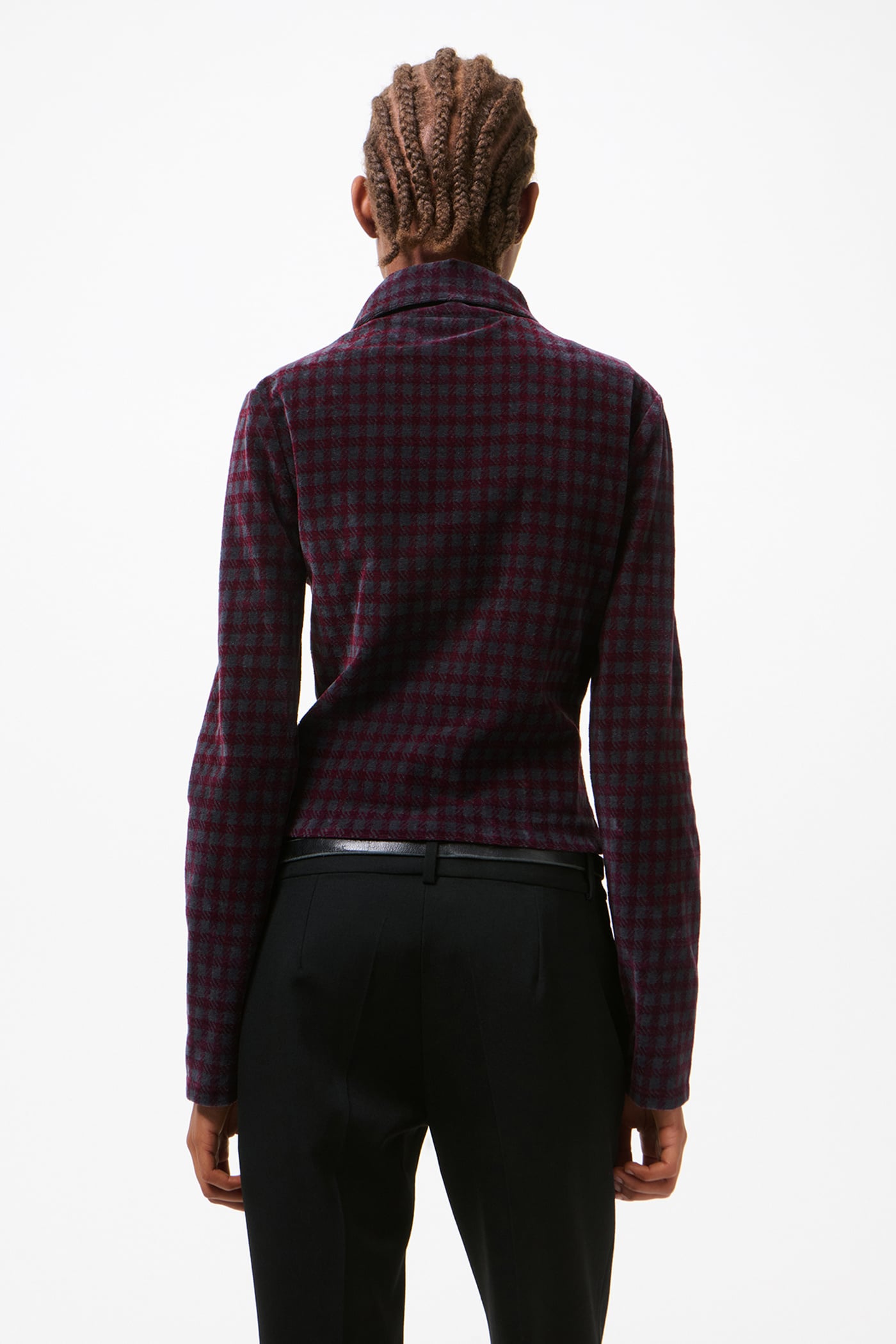 Our Slim Zip Longsleeve in Merlot Houndini Check Velour. Produced in a Portuguese soft check velour fabric made from organic cotton, polyester, polyamide, and elastane. The Slim Zip Longsleeve has a short boxy fit and features a Lampo two-way zip, funnel neck collar, flatlock seams, and a straight hem.