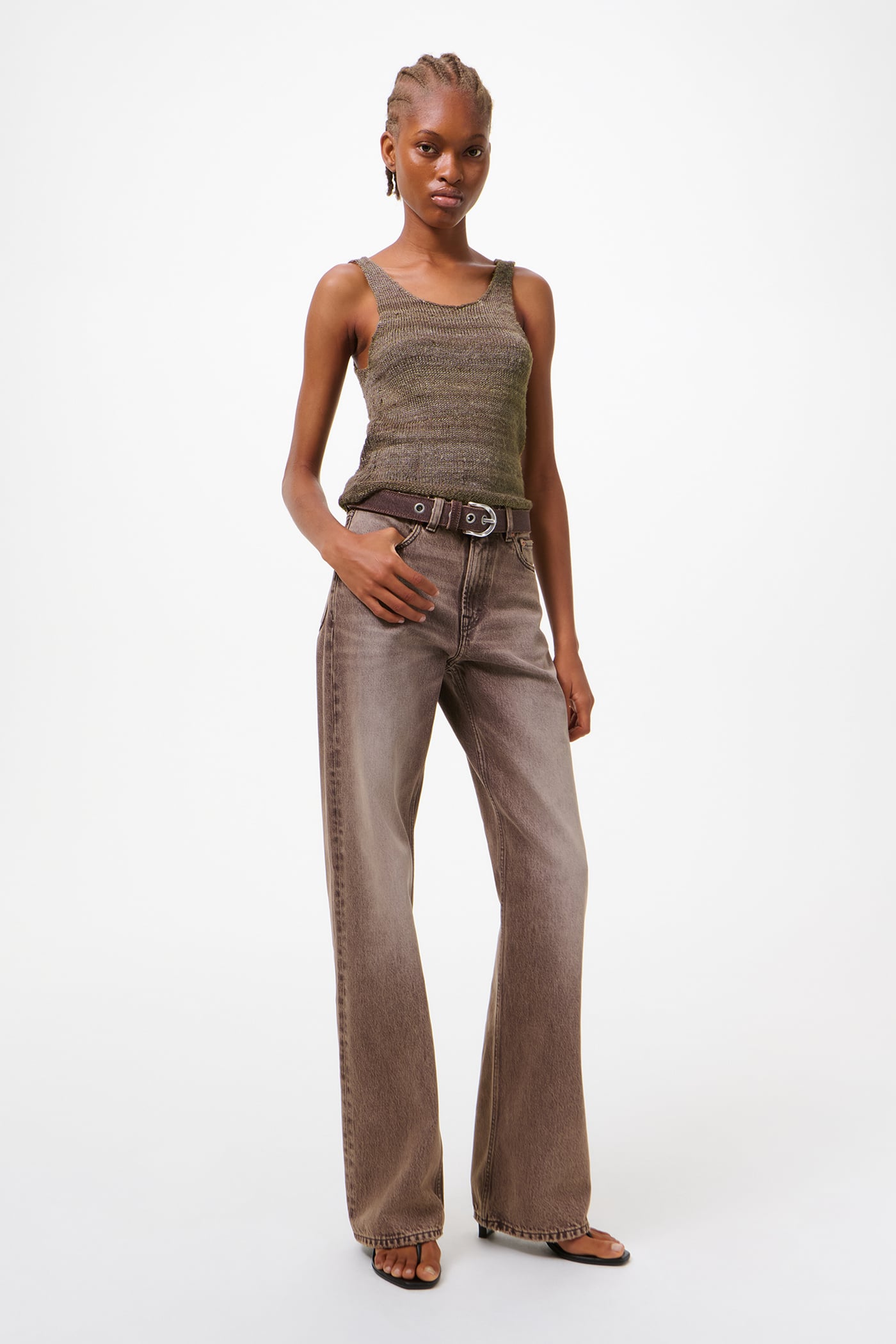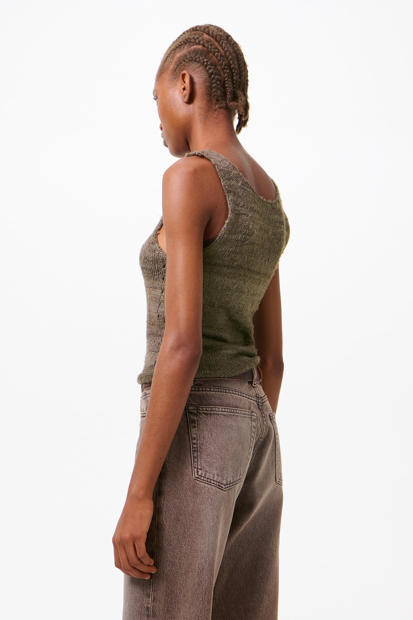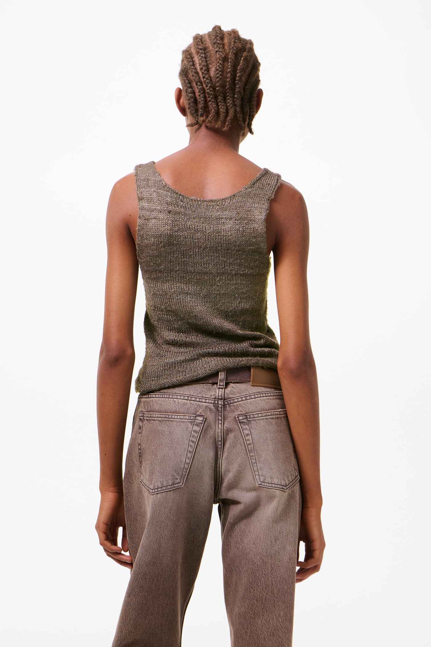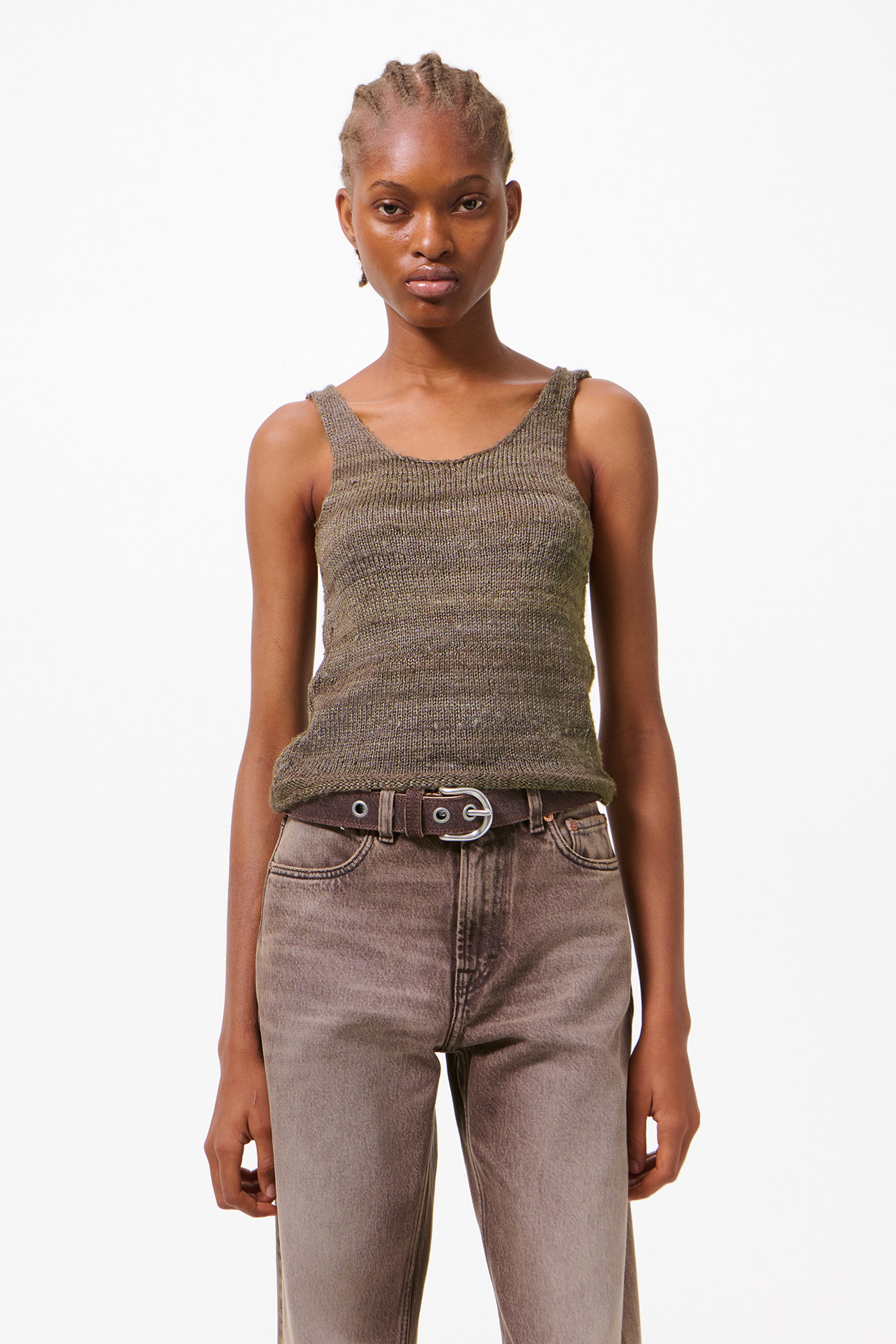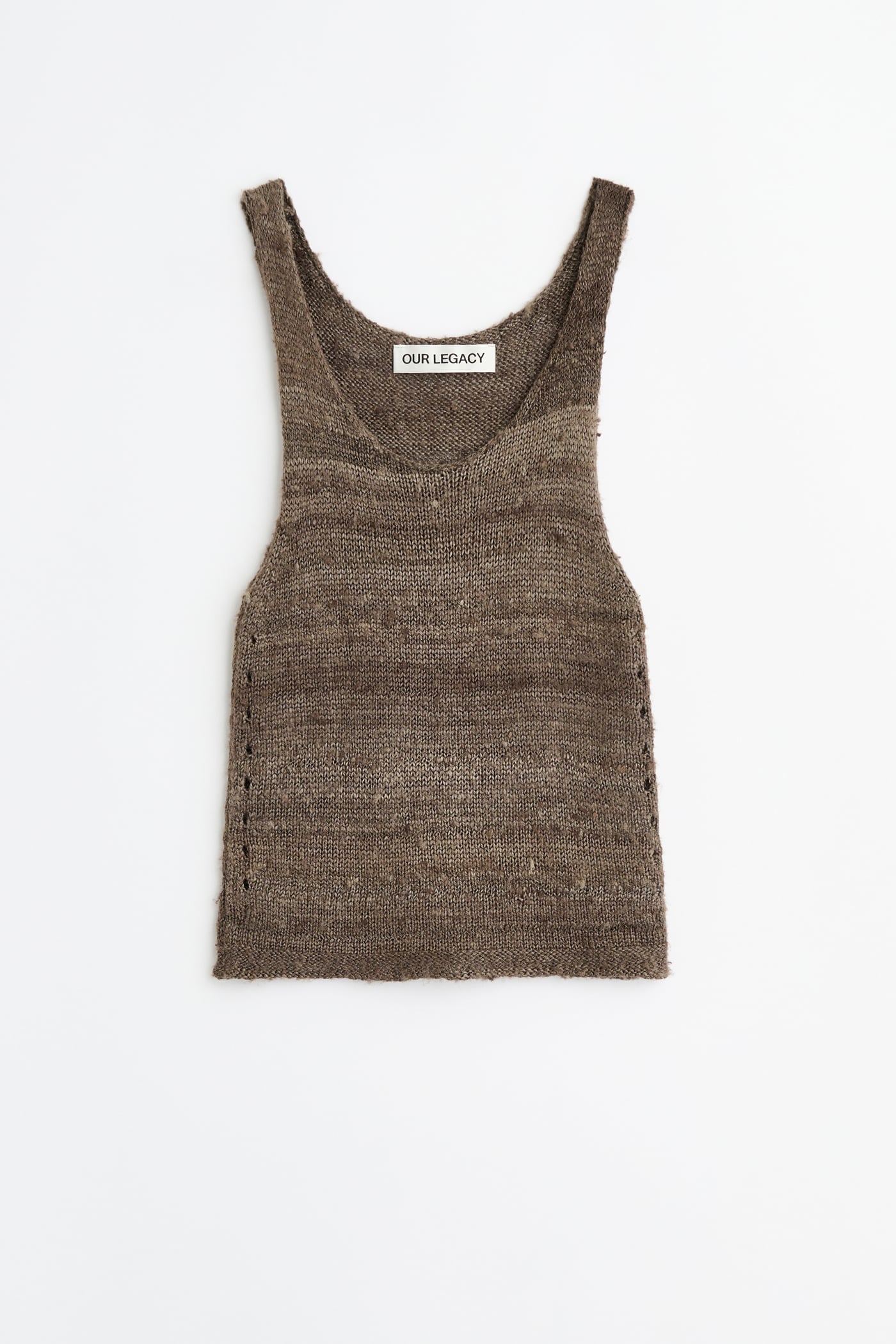 Our Solo Tank in Wathered Earth Handspun Silk. Knitted from Italian handspun silk yarn, the hand spinning imparts an irregular color and twist, creating a neppy, lightly pilled surface. The Solo Tank features narrow straps, a U-shaped neckline, and drop-stitch seam details.