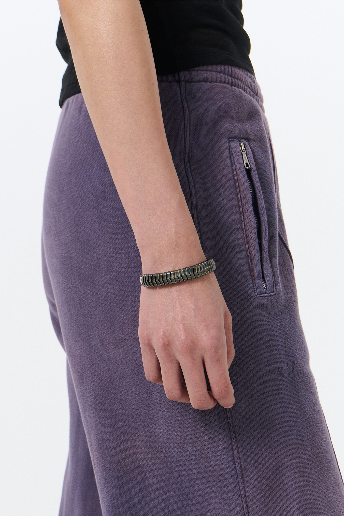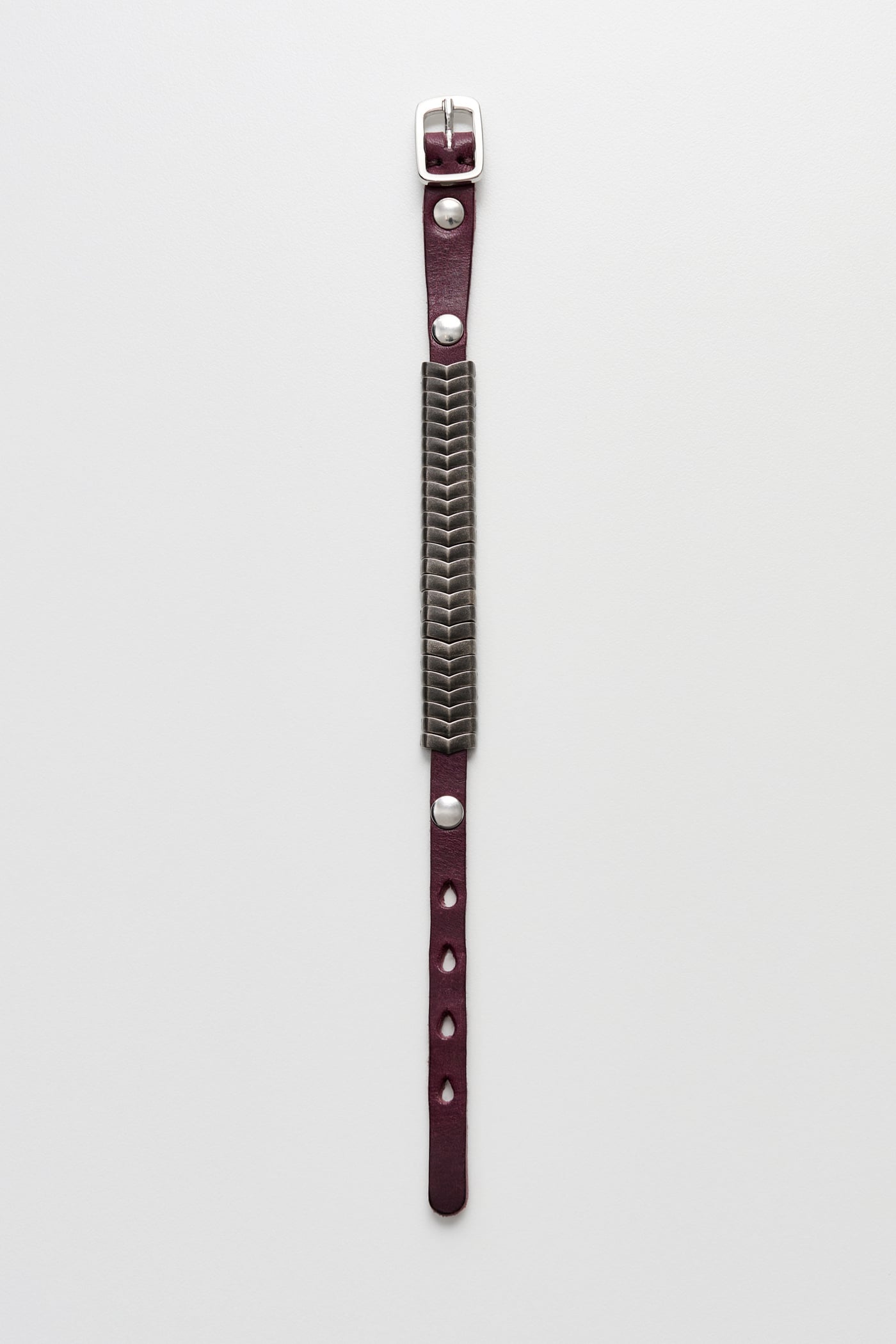 Our Spine Bracelet in Shadow Berry Leather. Produced in an Italian vegetable tanned, full-grain cow leather, the Spine Bracelet features interlocking metal slider ornaments, rivet details and an adjustable wrist strap with a metal pin buckle closure.
