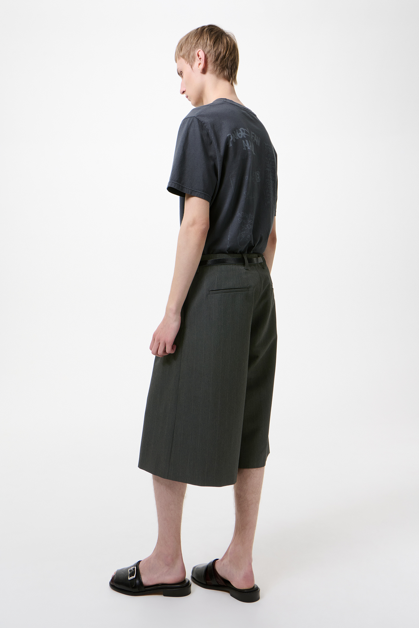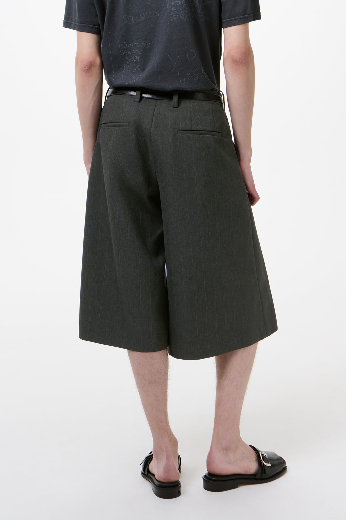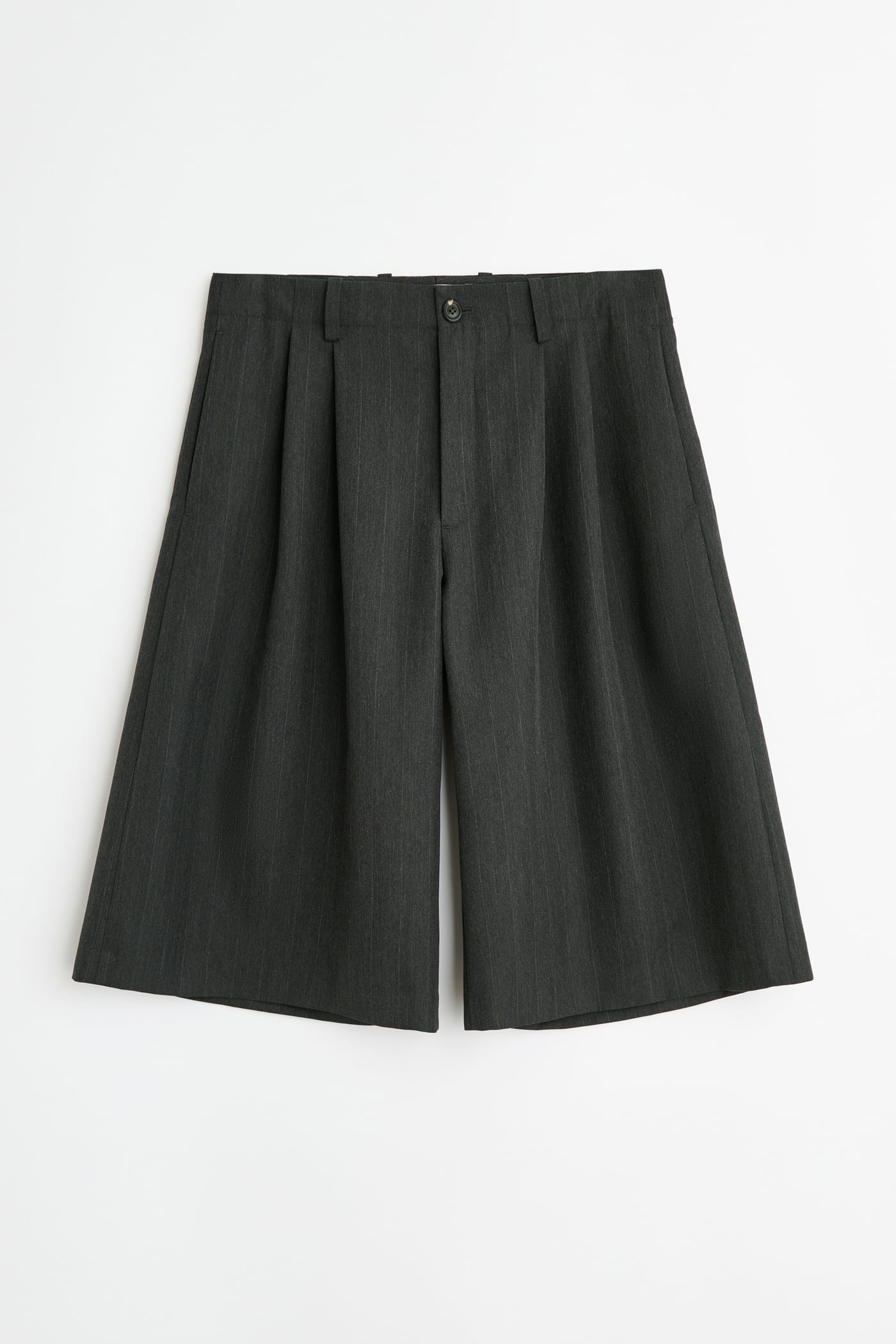 Our Split Shorts in Shark Pinstripe Herringbone. Produced in an Italian polyester and viscose suiting fabric with a refined herringbone weave and a subtle stripe design, combining a distinctive V-shaped pattern that adds texture. The men's Split Shorts have a relaxed tailored fit that sits at the knee and feature side split hems, a zip fly with button closure, slanted side pockets, two back welt pockets and pressed creases.